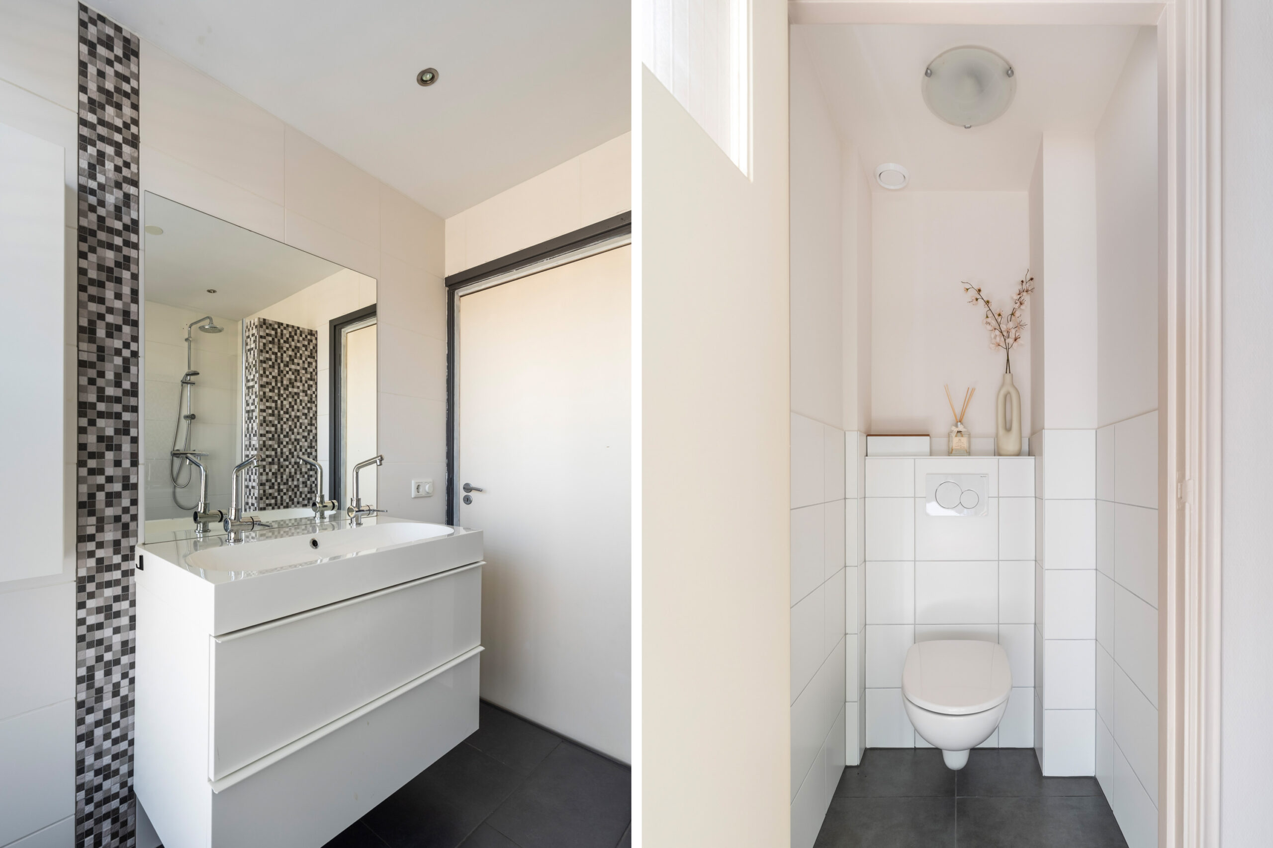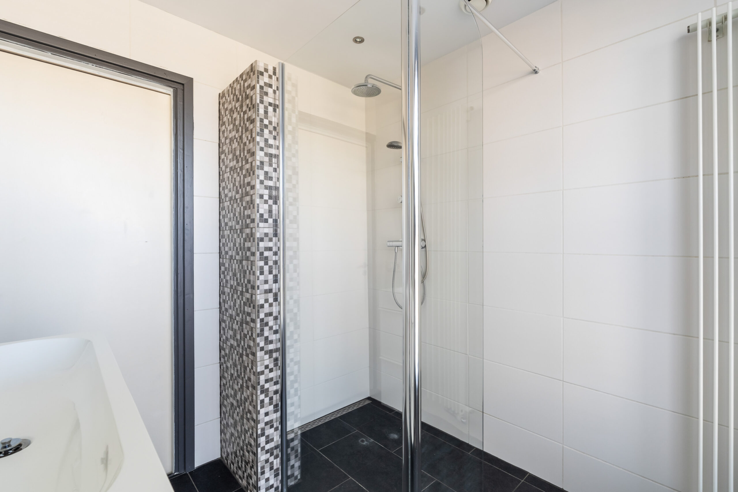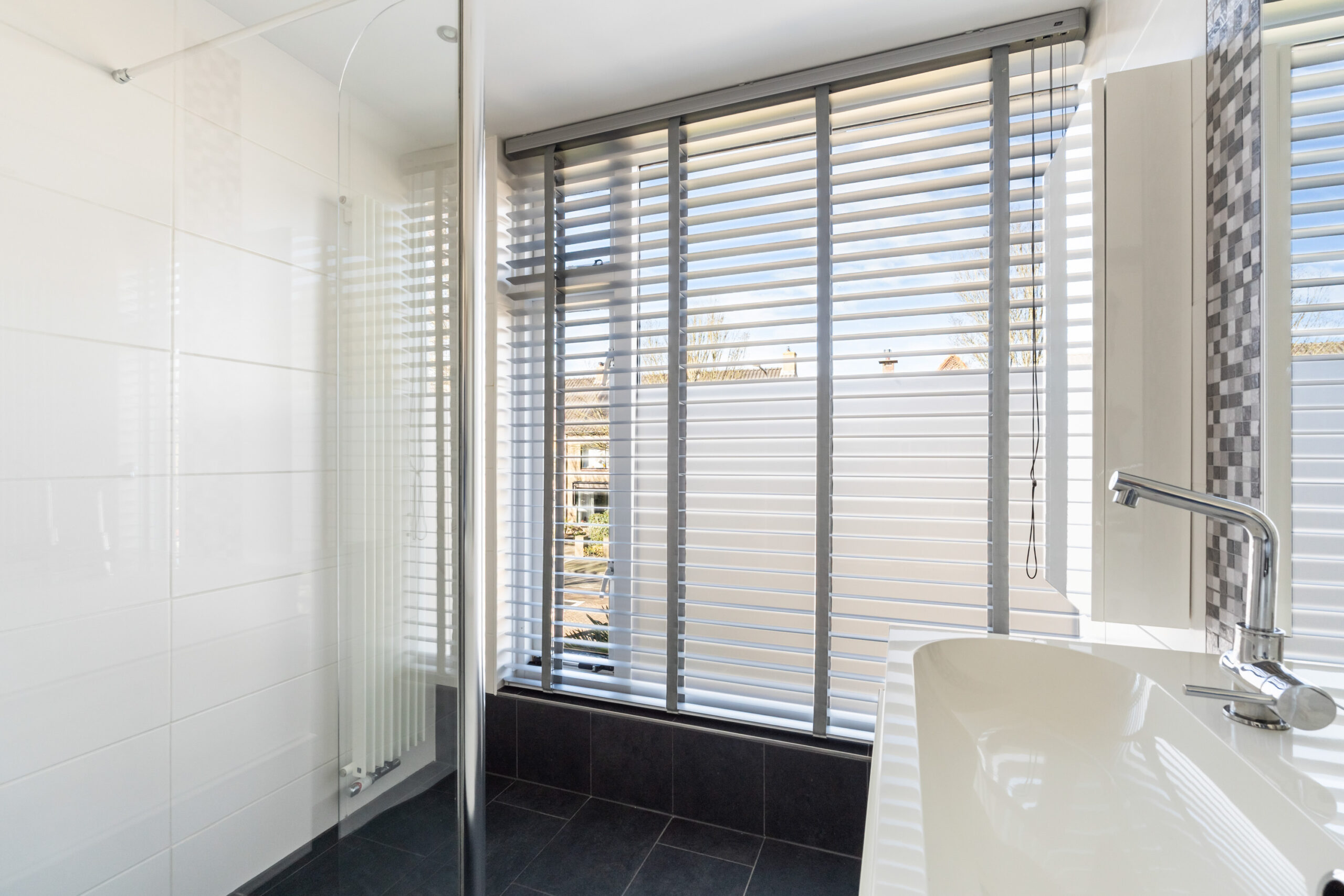 - Geheel betegelde badkamer (ca. 2013) met breed wastafelmeubel, ruime inloopdouche, radiator en inbouwspotjes.