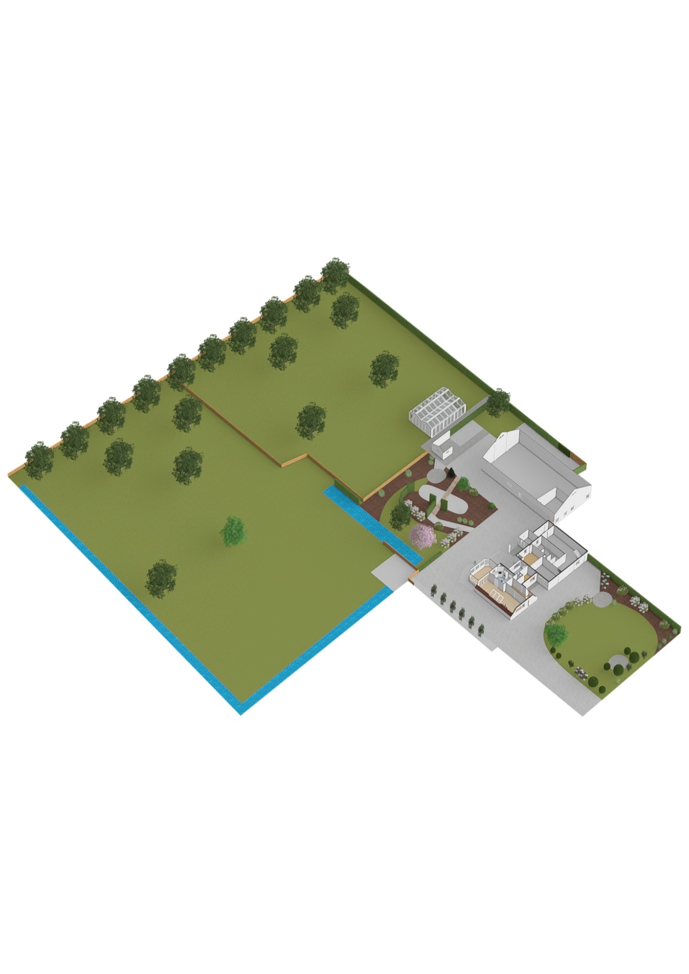De woning is omgeven door groen en grenst deels aan water, waardoor je hier elke dag wakker wordt met fluitende vogels en een prachtig uitzicht over je eigen land. De royale siertuin is zonnig en smaakvol aangelegd, met volop ruimte om te ontspannen, te tuinieren of simpelweg te genieten van het buitenleven.