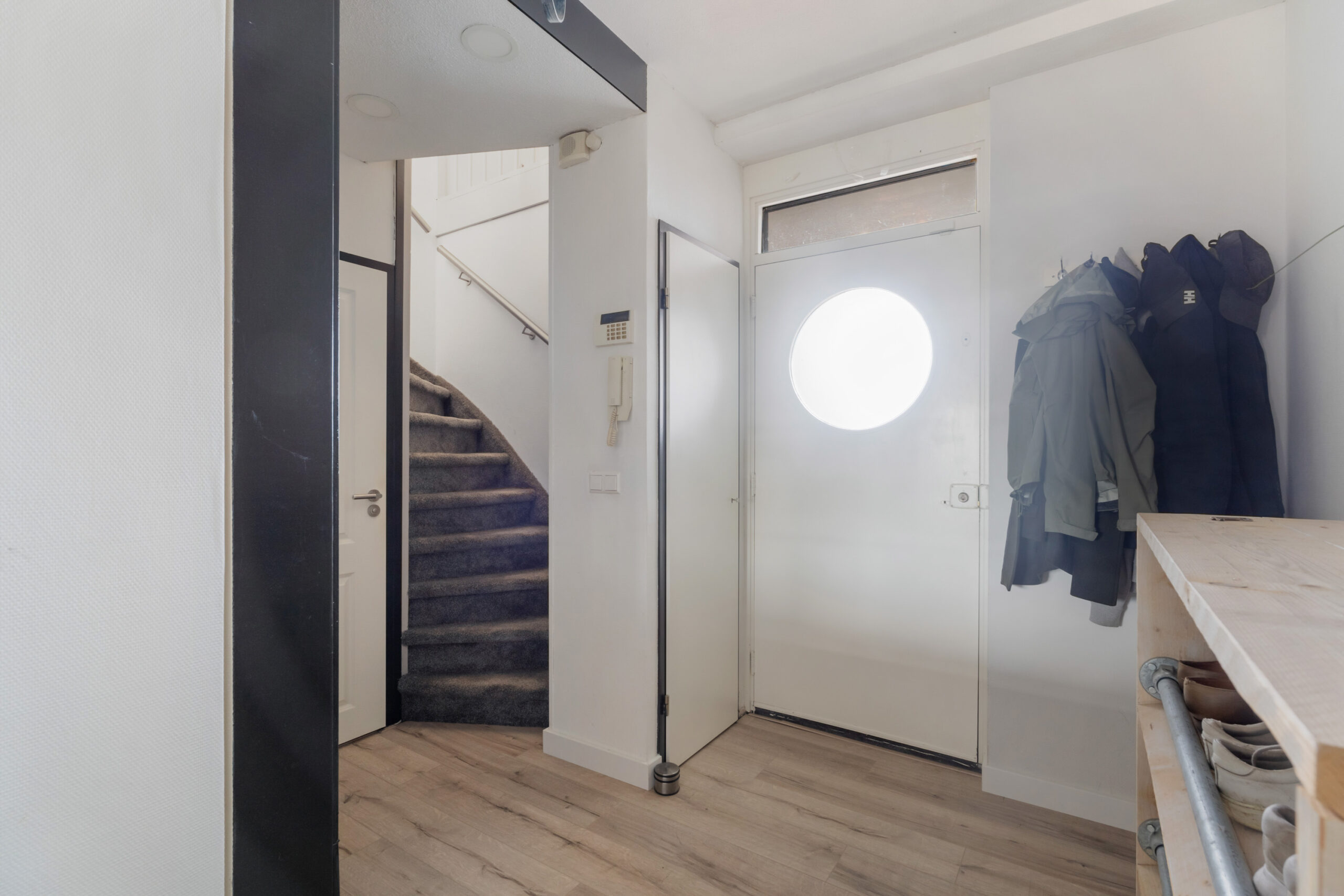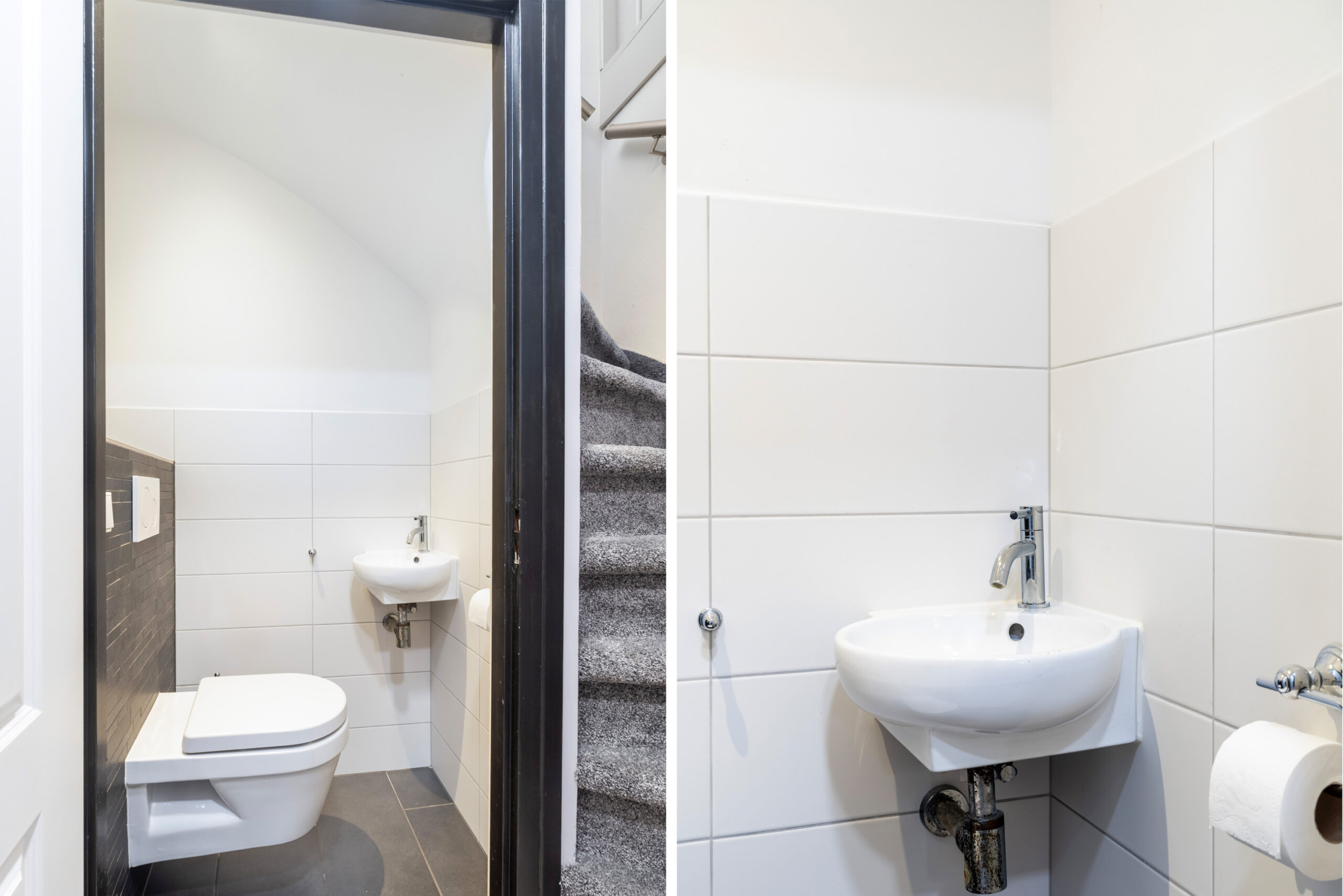 - Ruime entreehal met meterkast, trapopgang naar de bovenste etage en deels betegelde toilet en fonteintje;