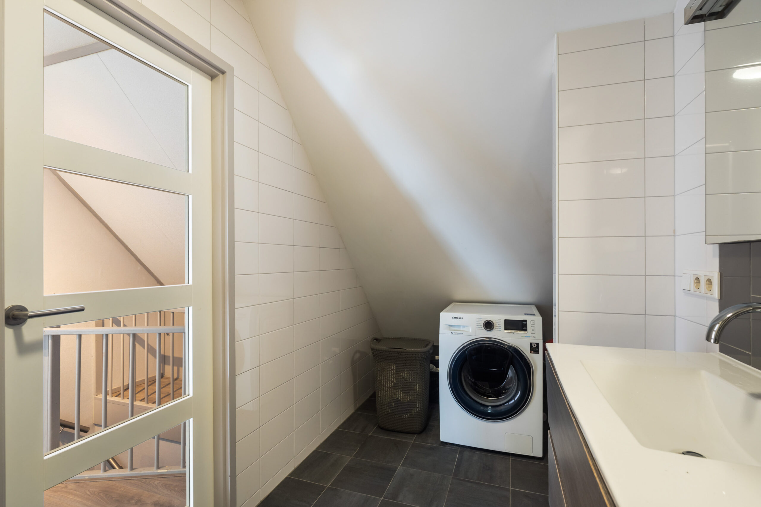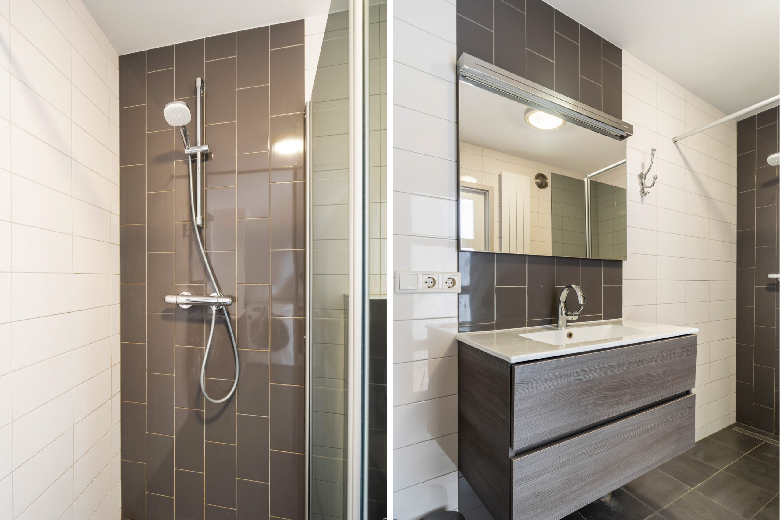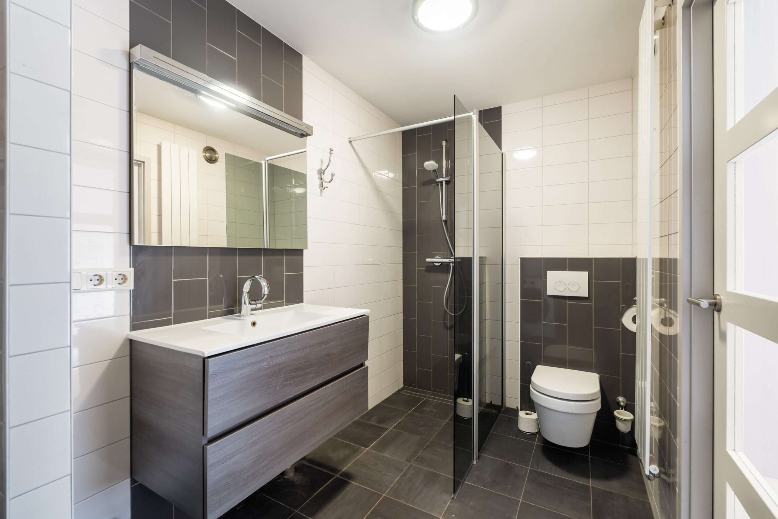 - Nette, geheel betegelde badkamer met inloopdouche, wastafelmeubel, tweede toilet en opstelplaats voor de cv-ketel en wasmachine.