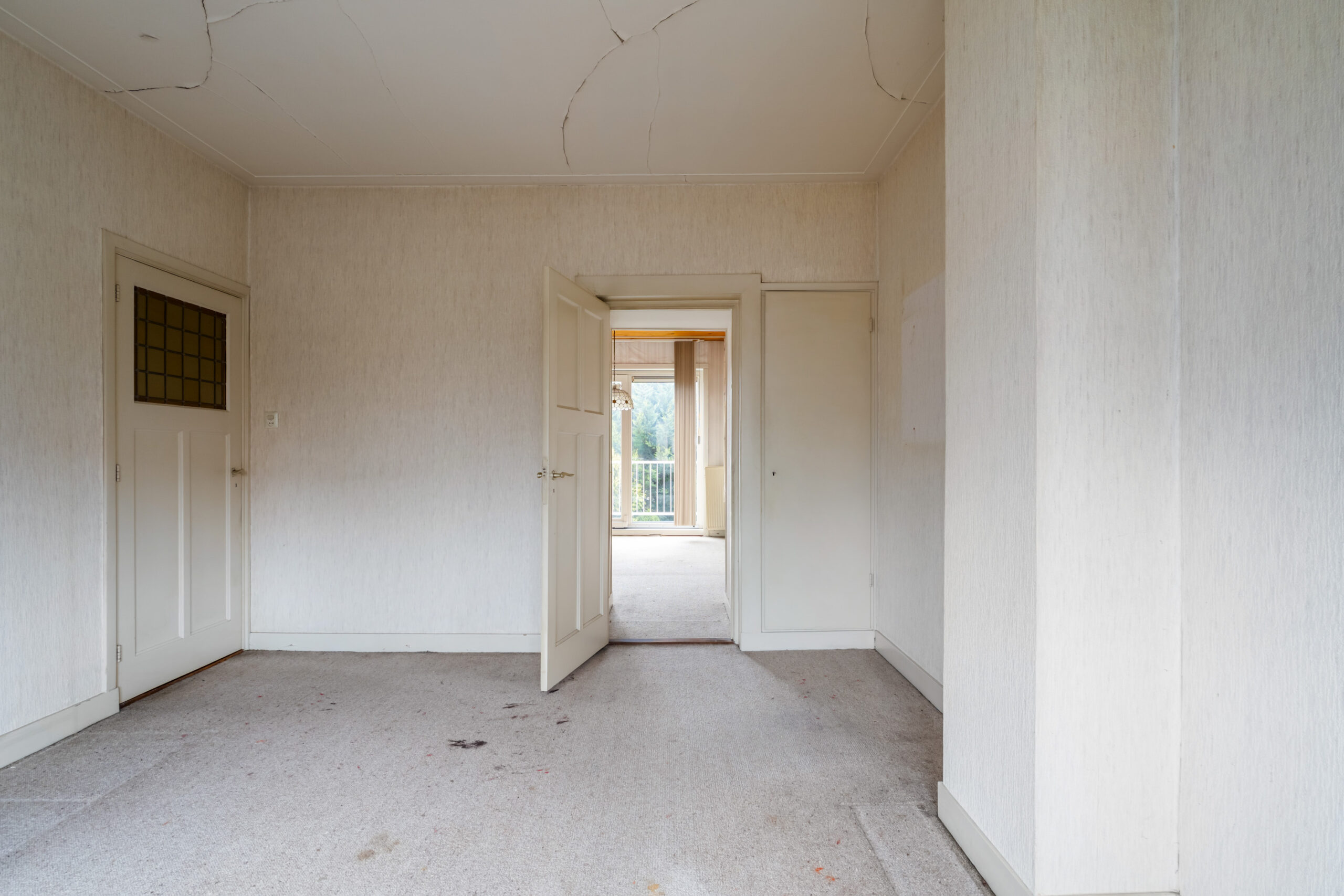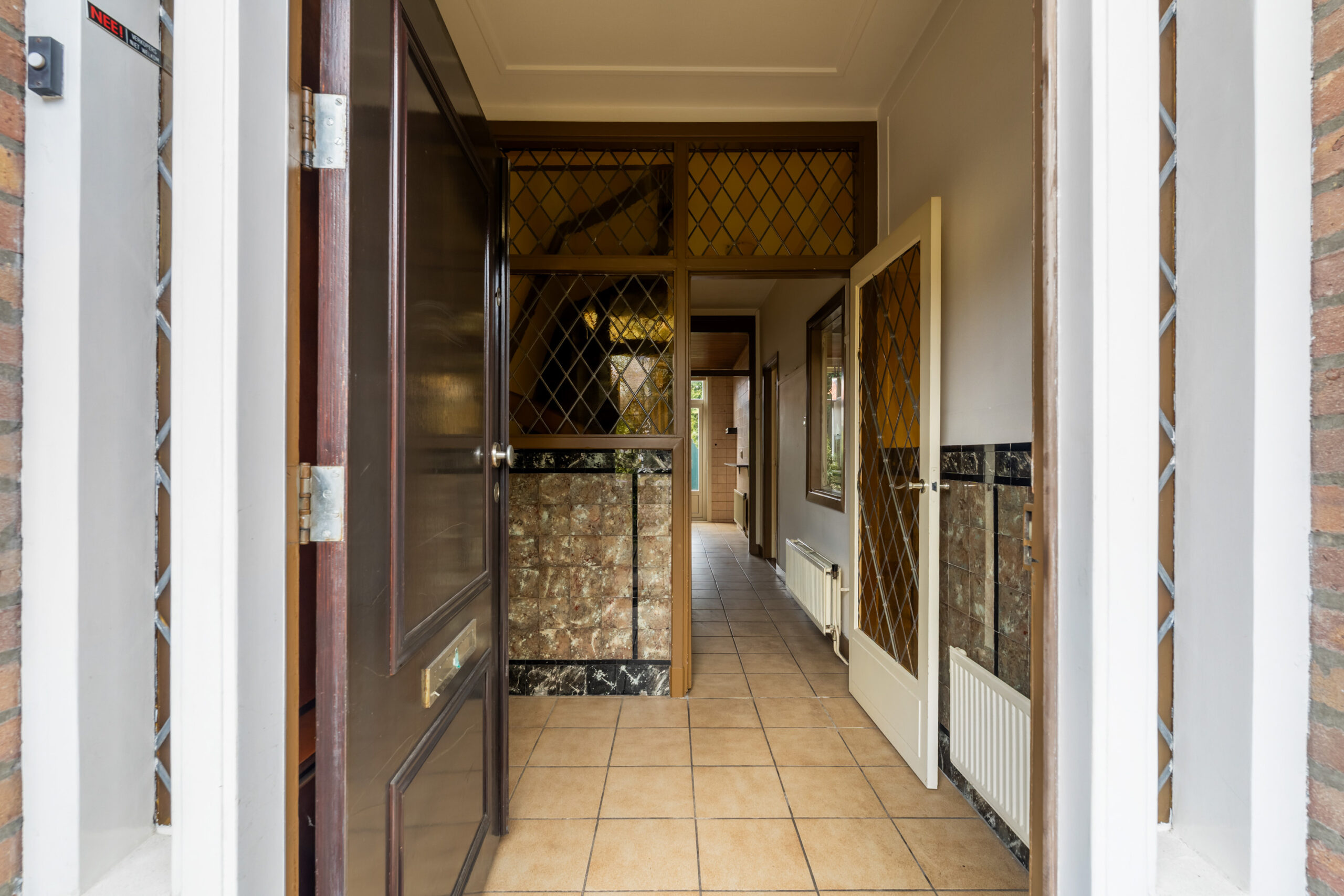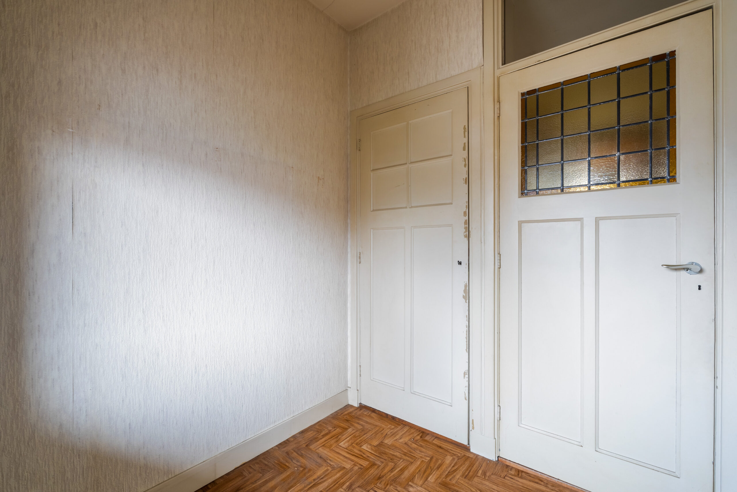 - Entree, vestibule met glas-in-lood raampjes en meterkast.