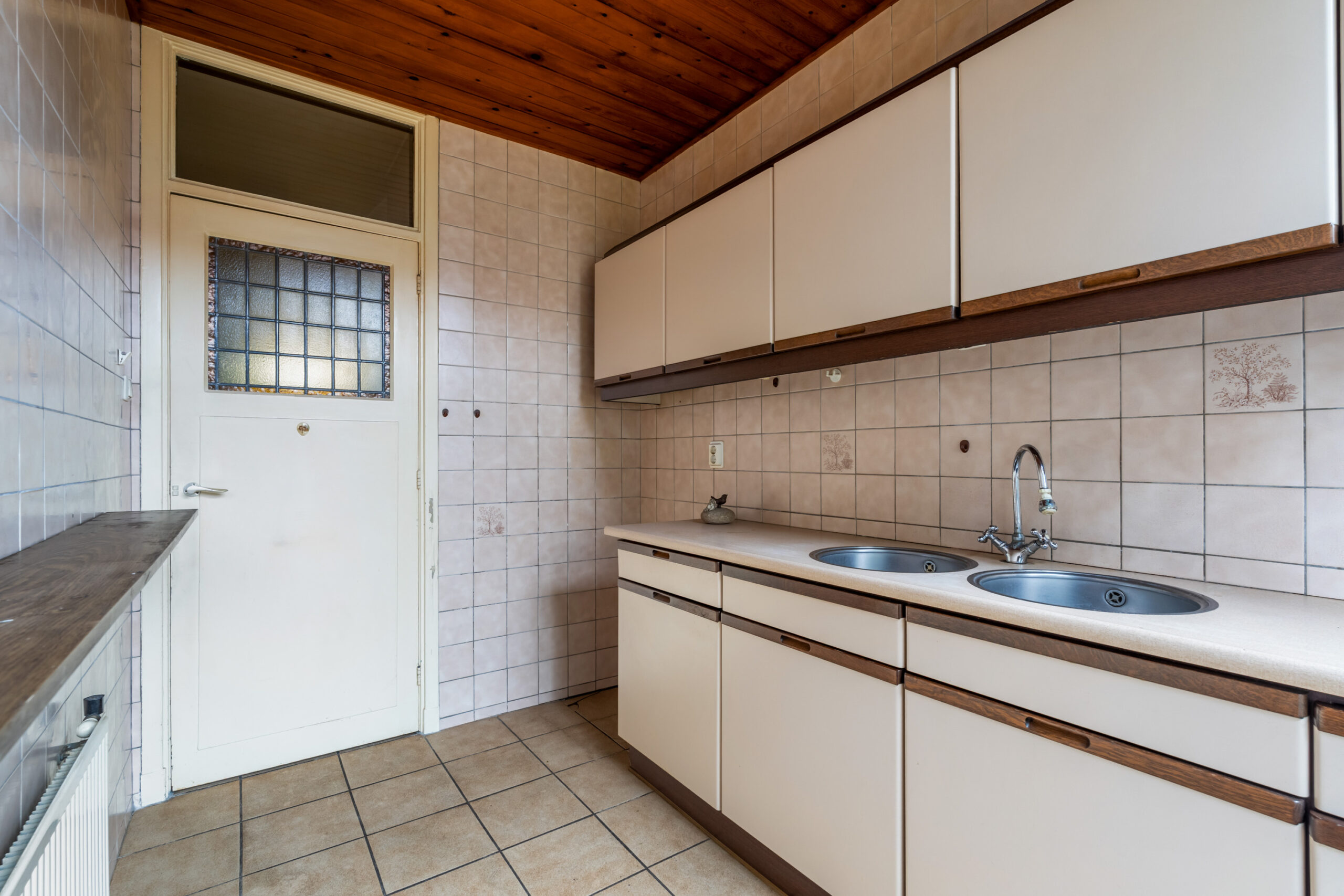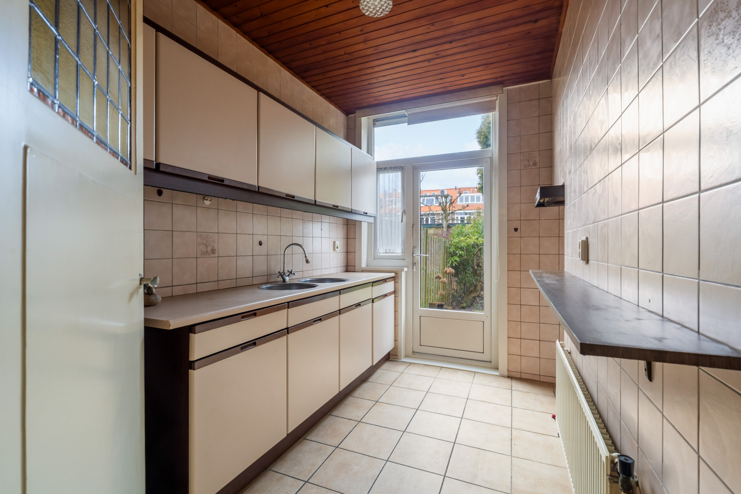 - Dichte keuken met eenvoudig keukenblok en deur nar de achtertuin.