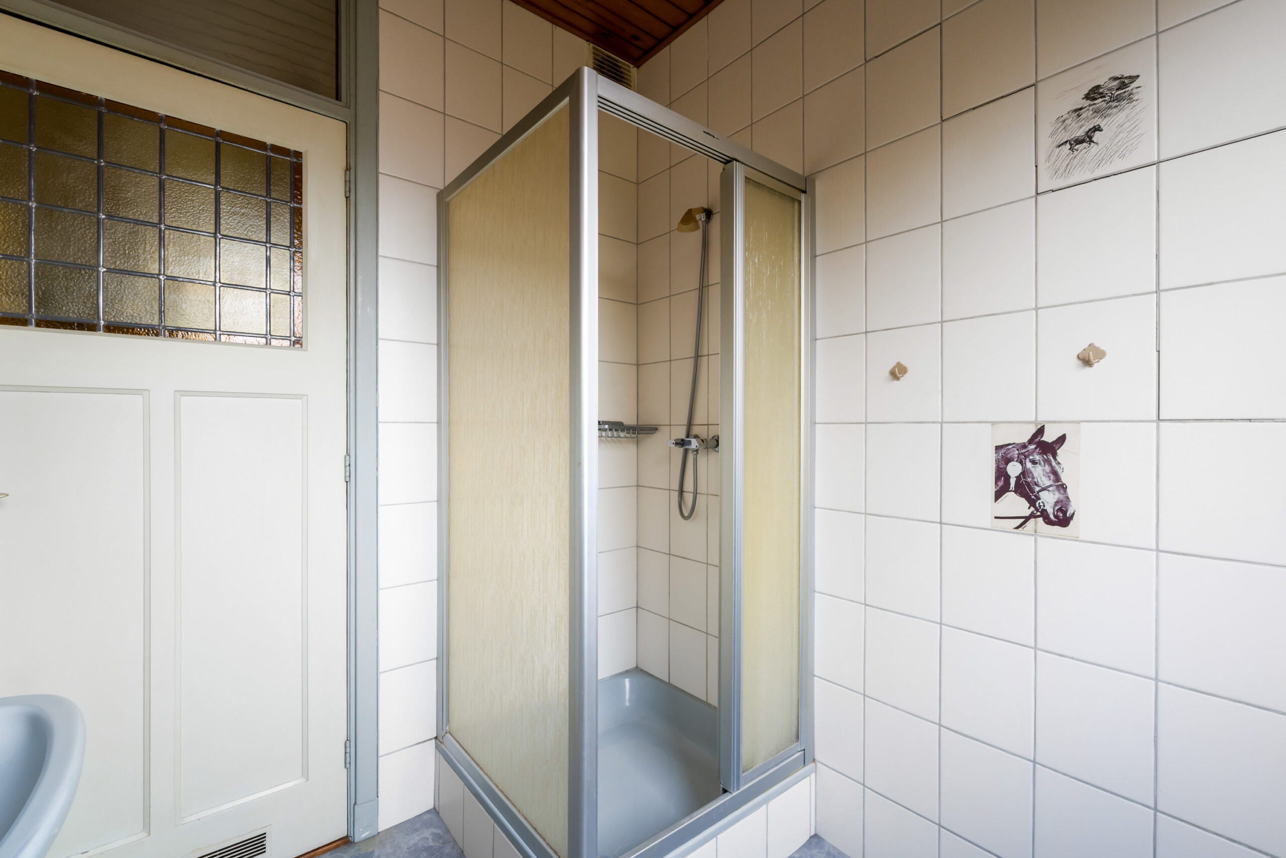 - Eenvoudige badkamer met douchehoek, dubbele wastafel en raampartij.
