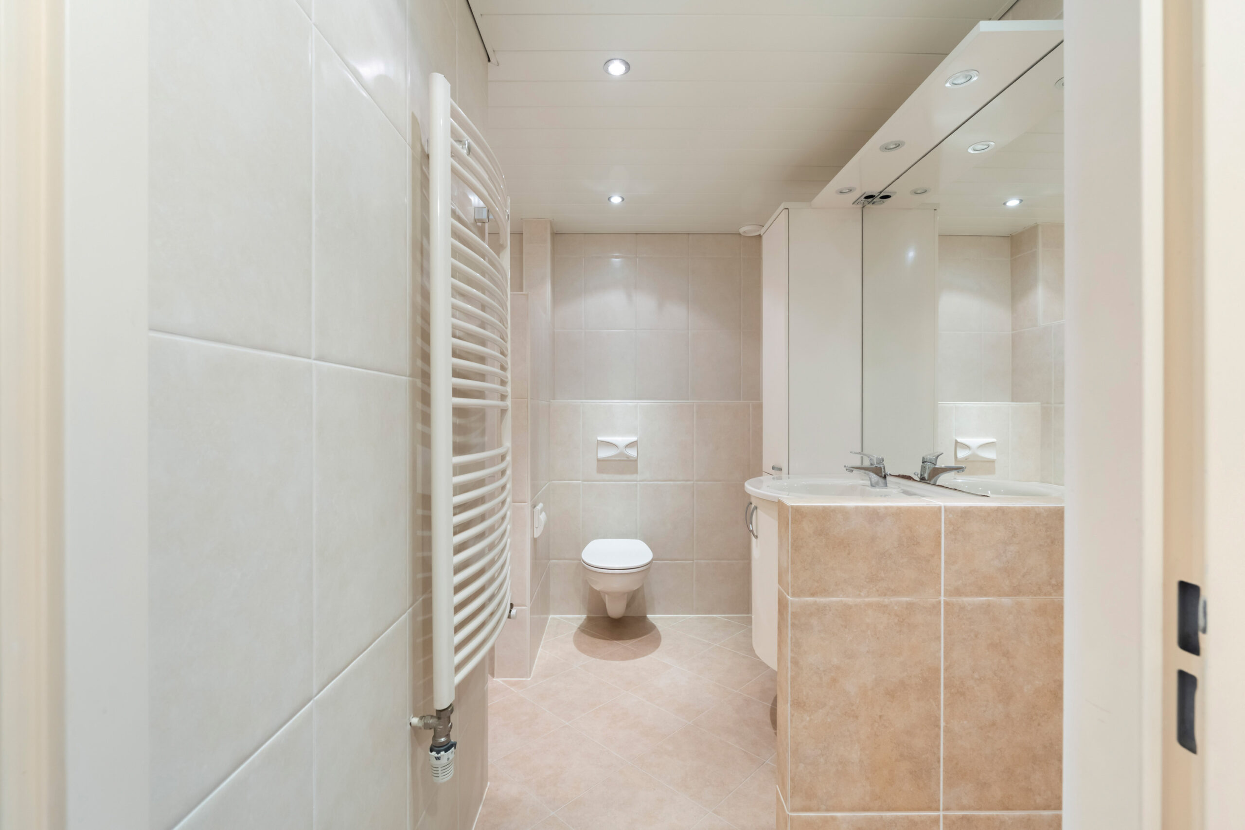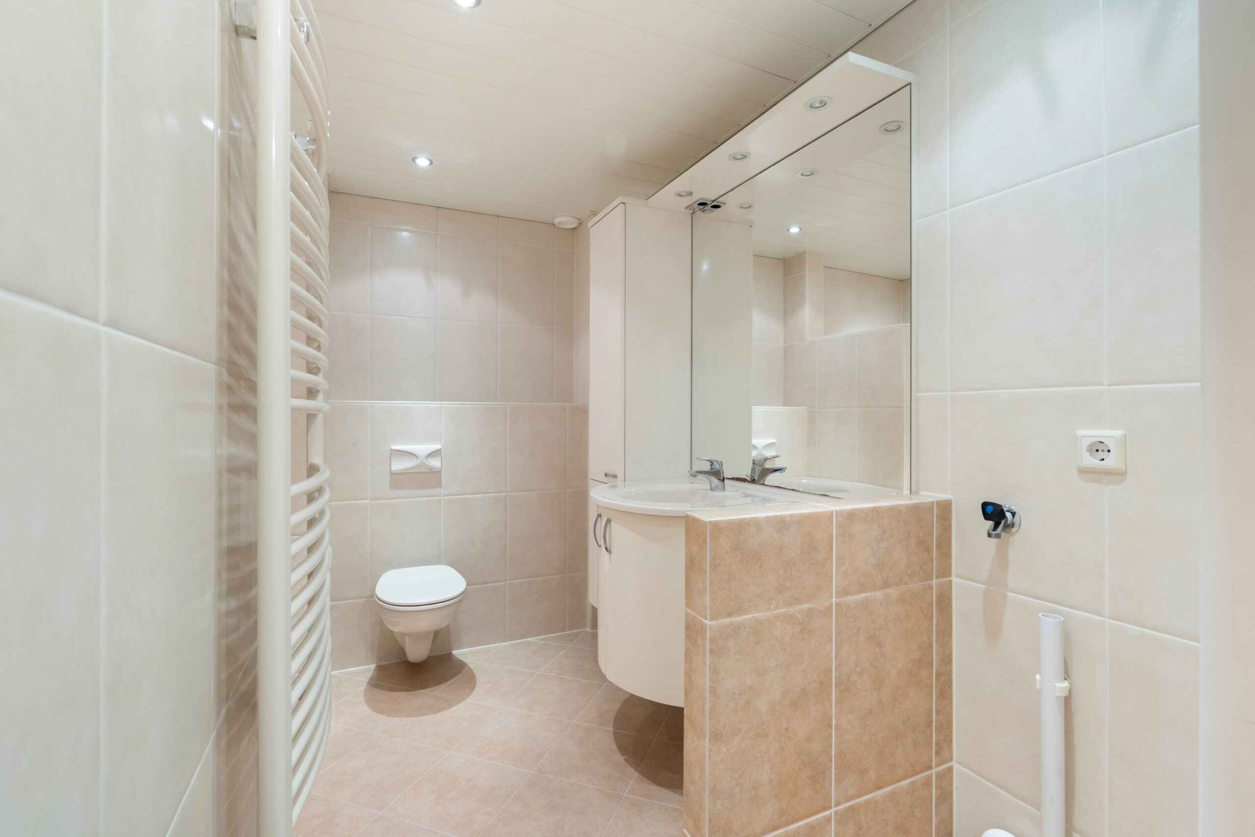 - Geheel betegelde badkamer voorzien van inloopdouche, een tweede toilet en een wastafel met wastafelmeubel. Tevens bevindt zich in de badkamer de aansluiting voor de wasmachine.