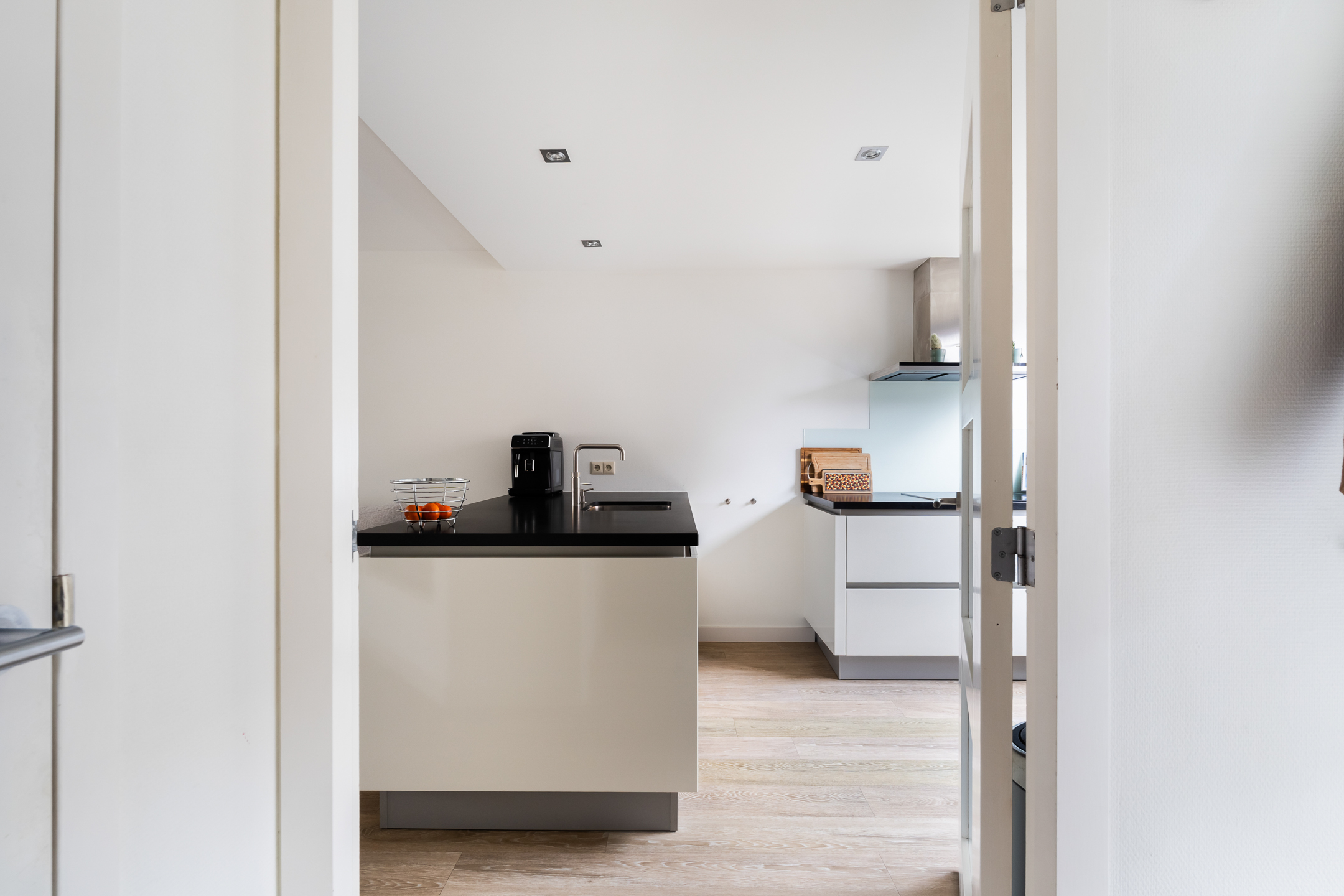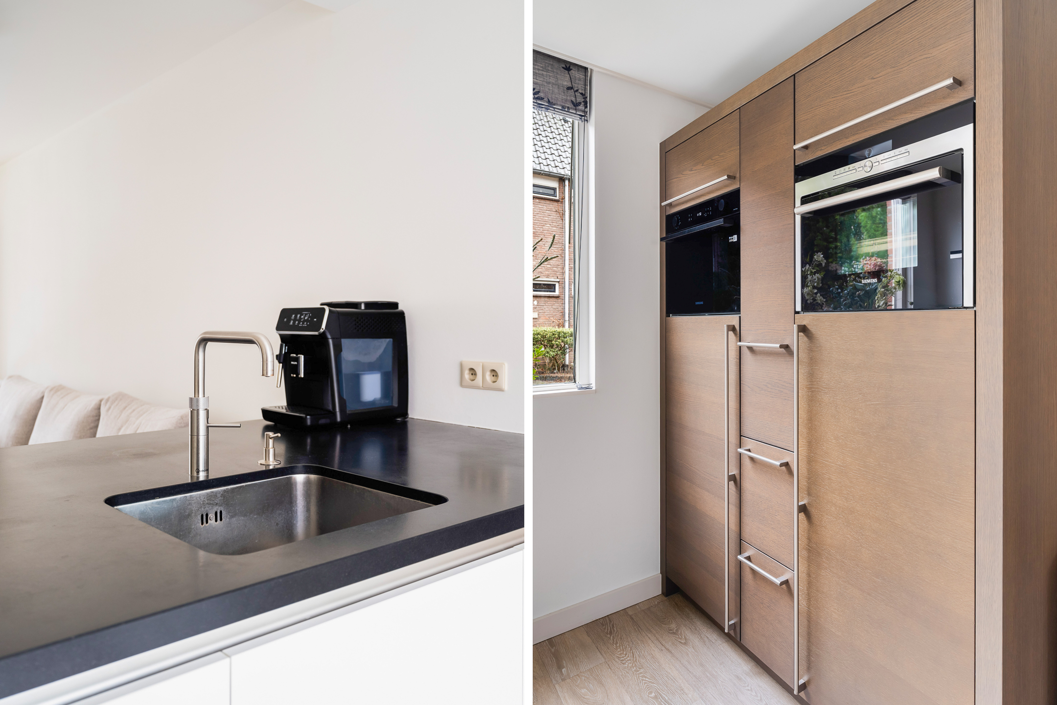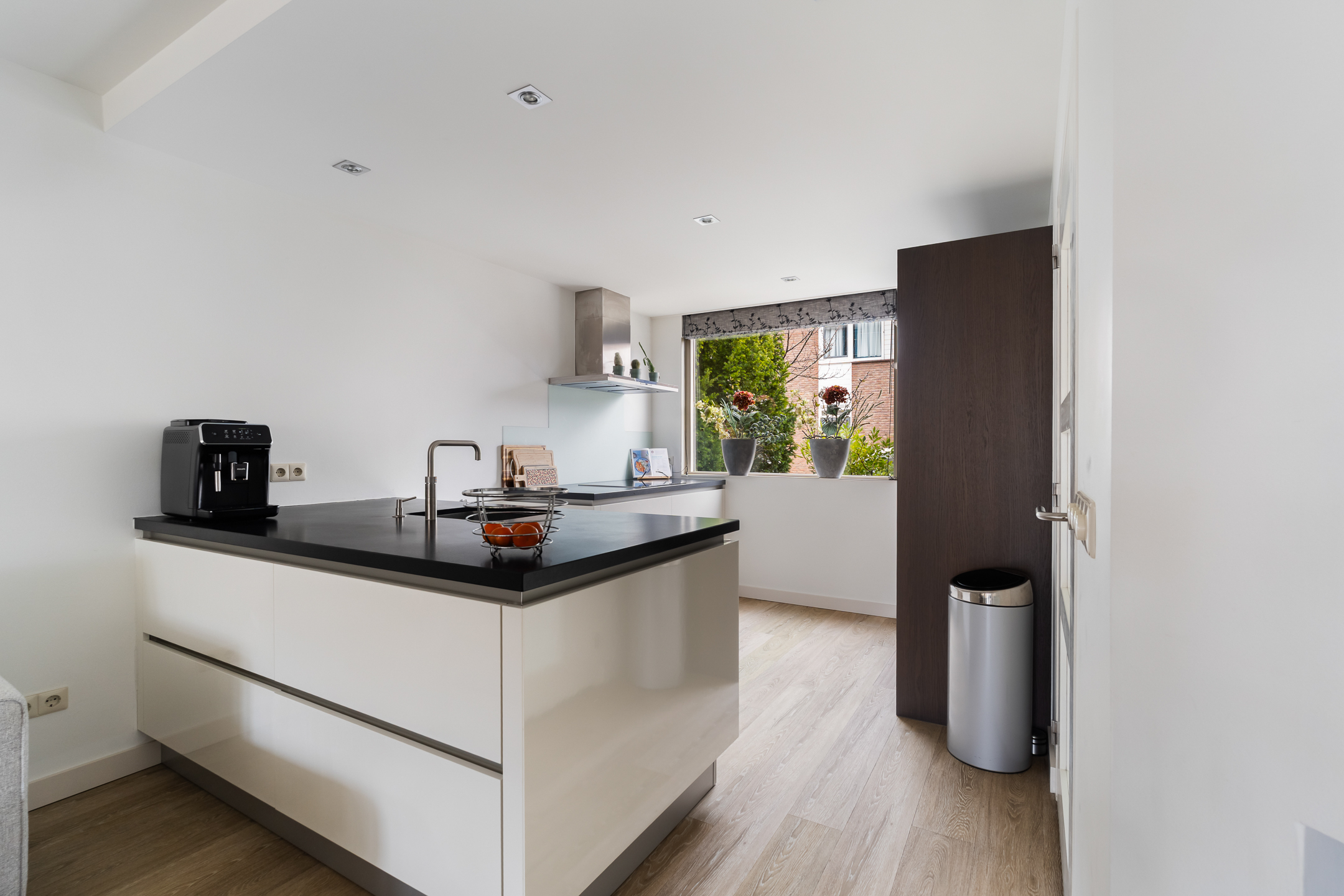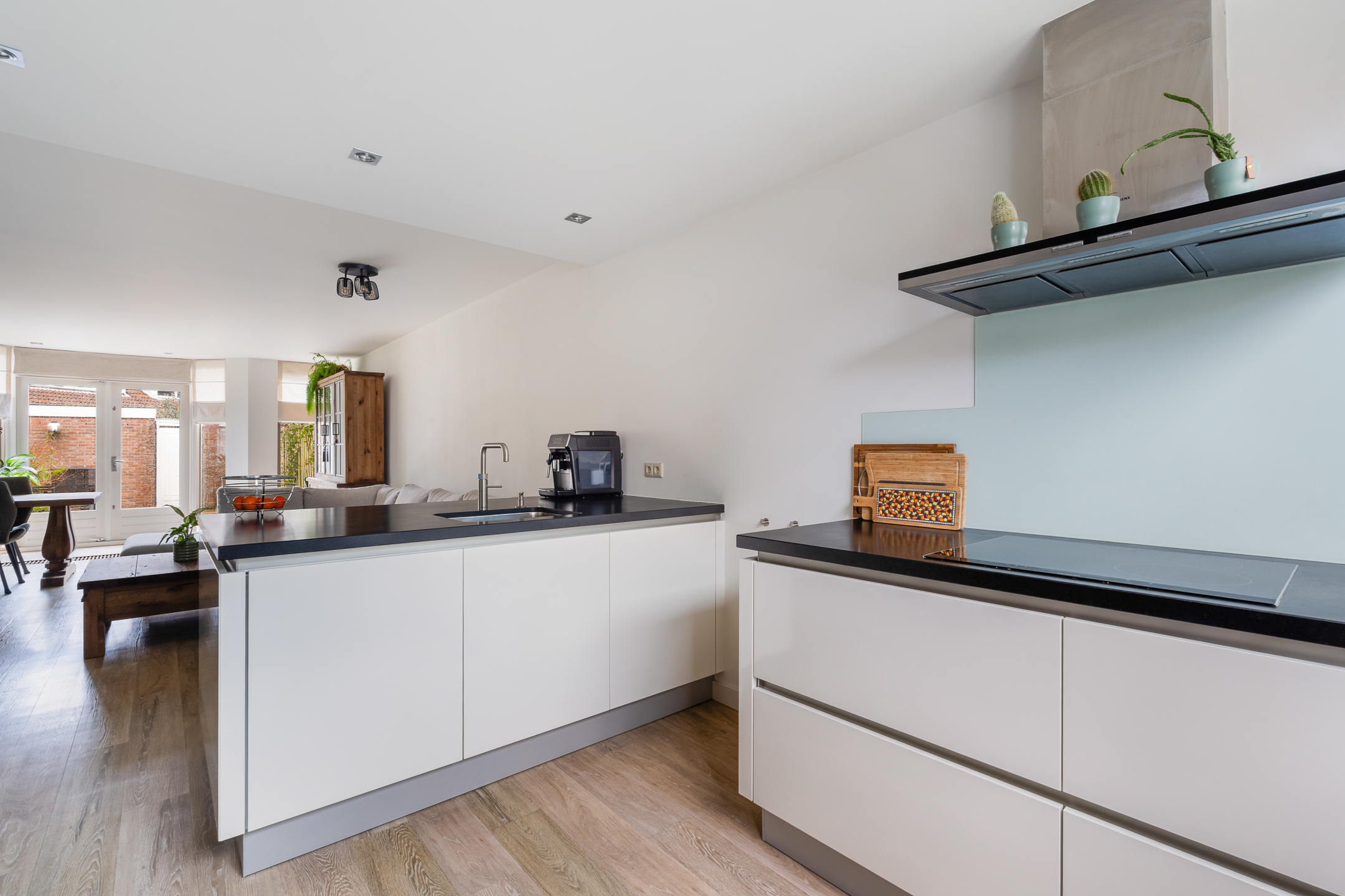 - Moderne open keuken gelegen aan de voorzijde van de woning voorzien van spoeleiland diverse inbouwapparatuur, composiet aanrechtblad en raampartij.