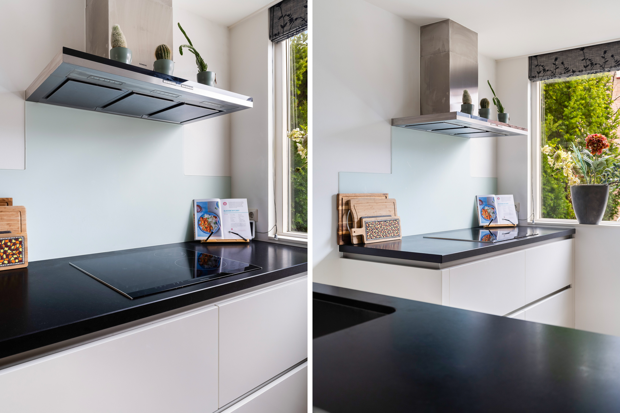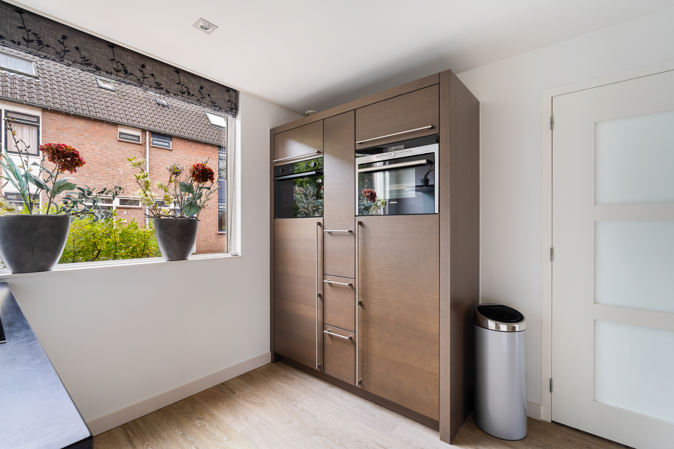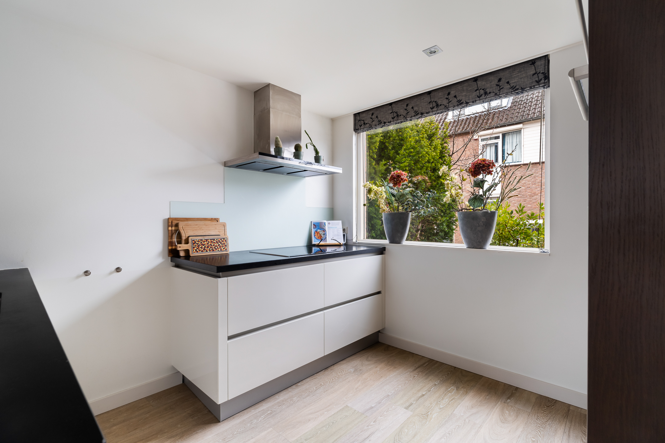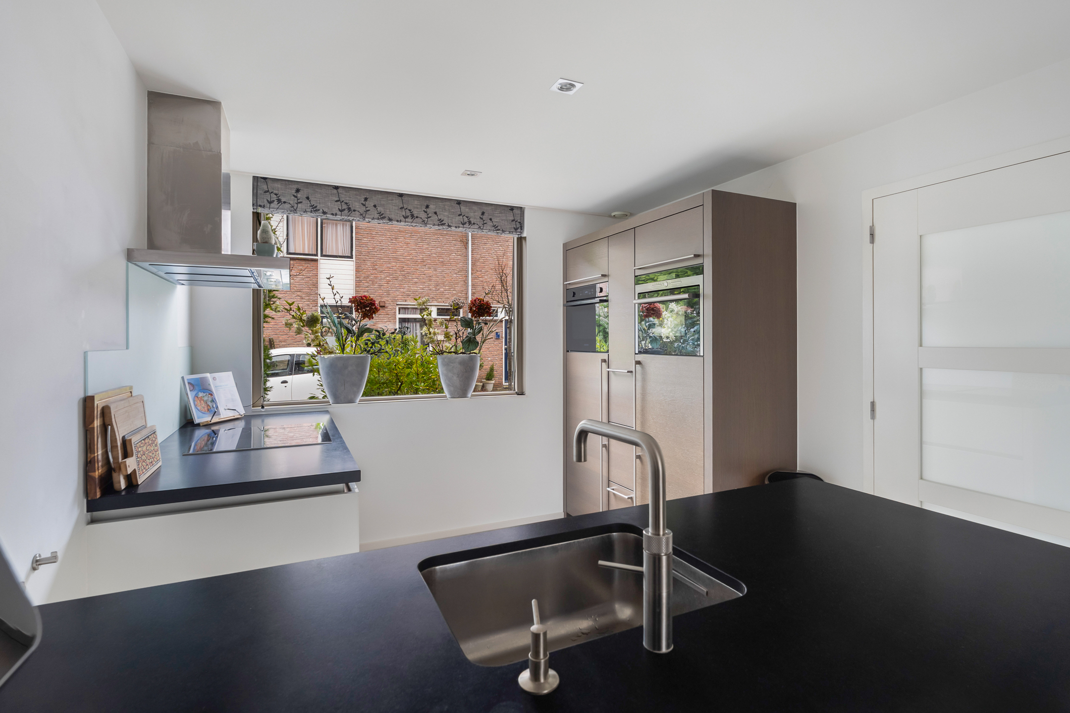 - Moderne open keuken gelegen aan de voorzijde van de woning voorzien van spoeleiland diverse inbouwapparatuur, composiet aanrechtblad en raampartij.