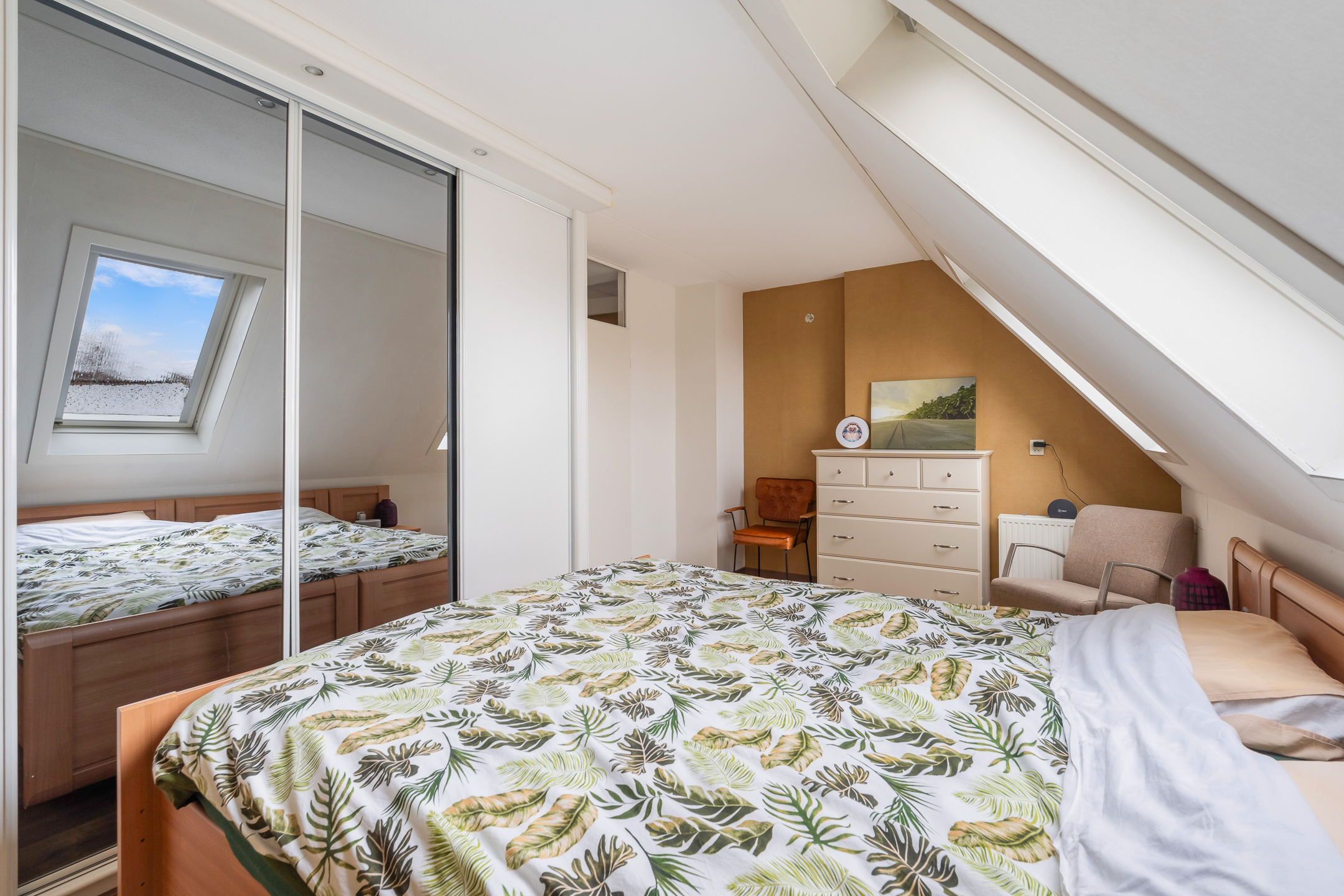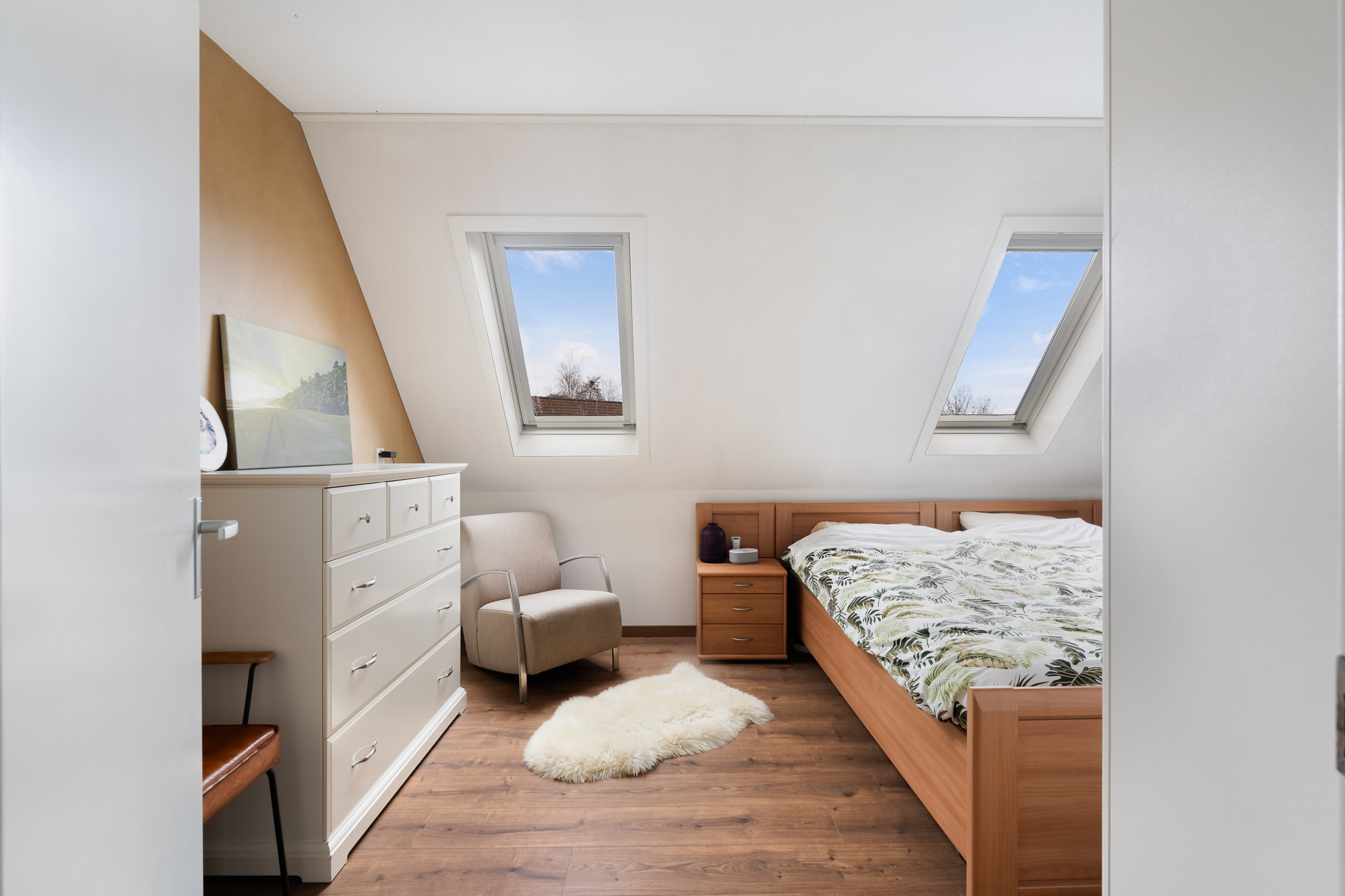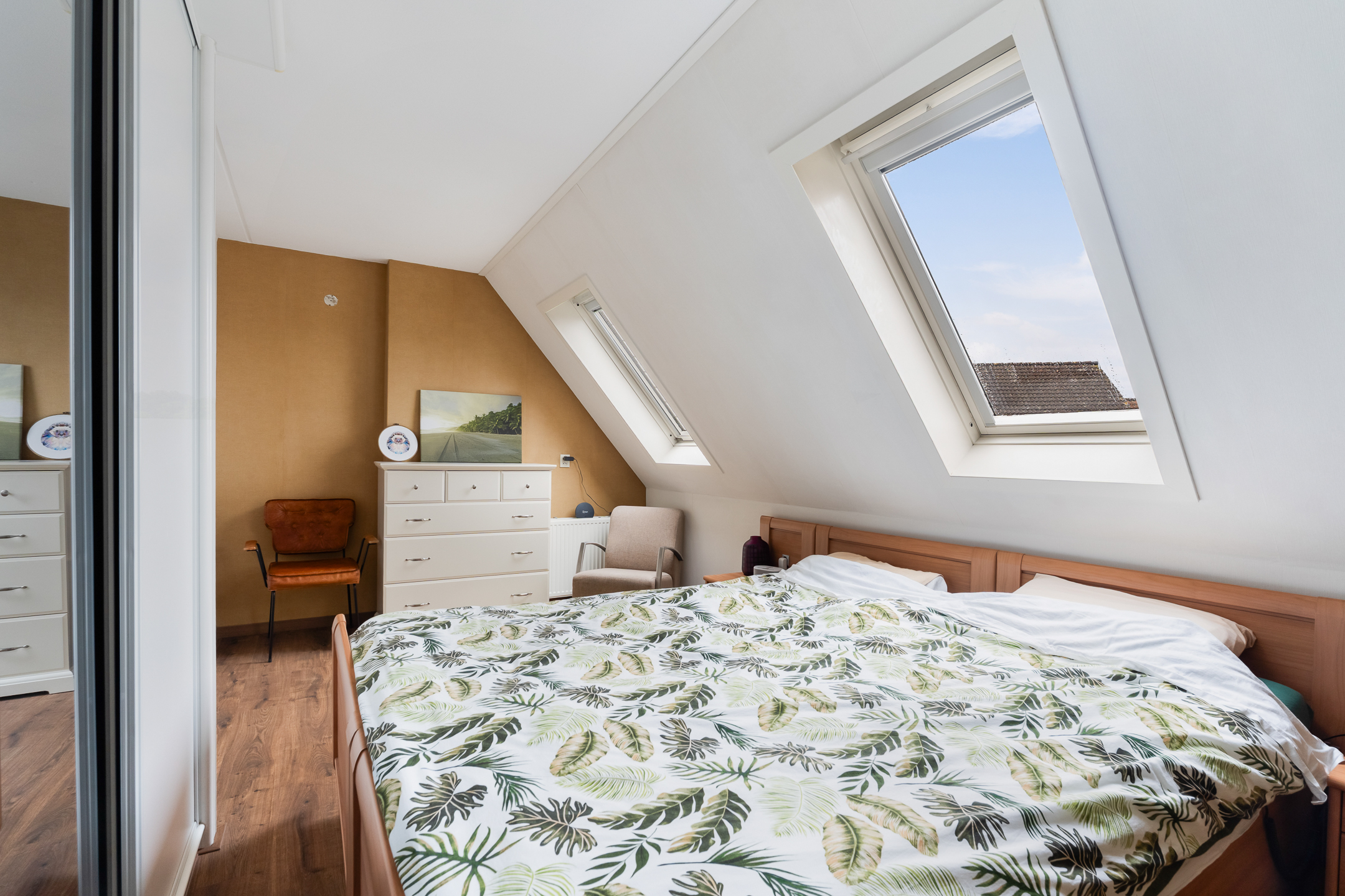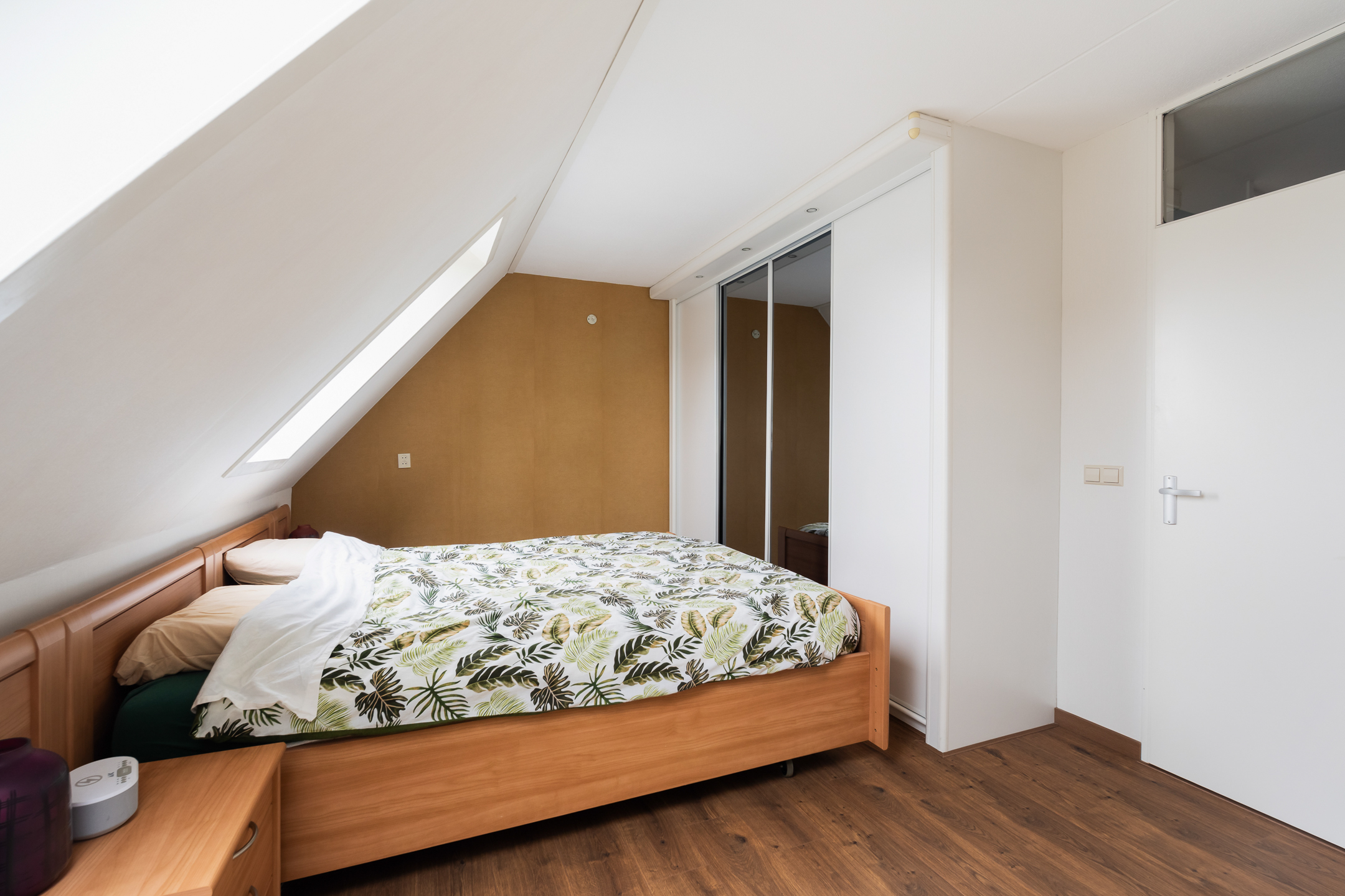 - Ruime slaapkamer met laminaat vloer, dakraam, veel bergruimte en toegang tot de bergvliering.