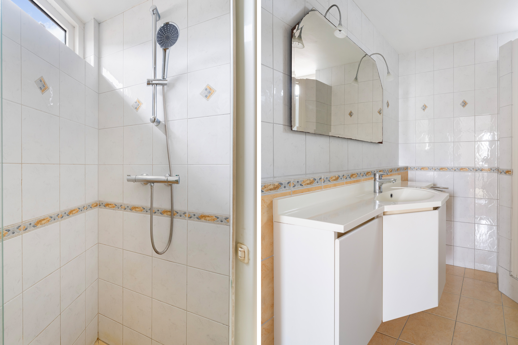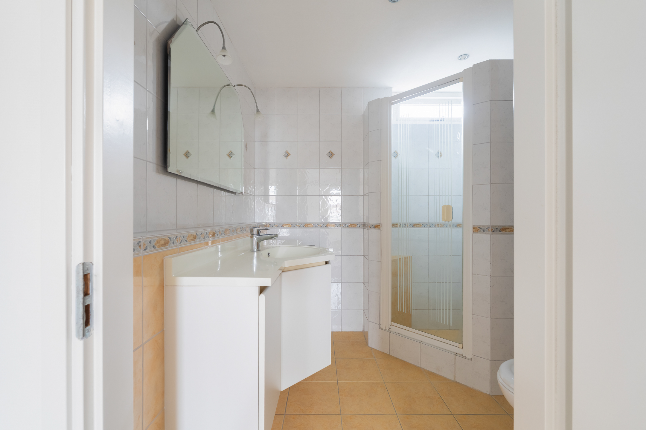 - Geheel betegelde badkamer met douchehoek, wastafelmeubel, 2e toilet en elektrische vloerverwarming.