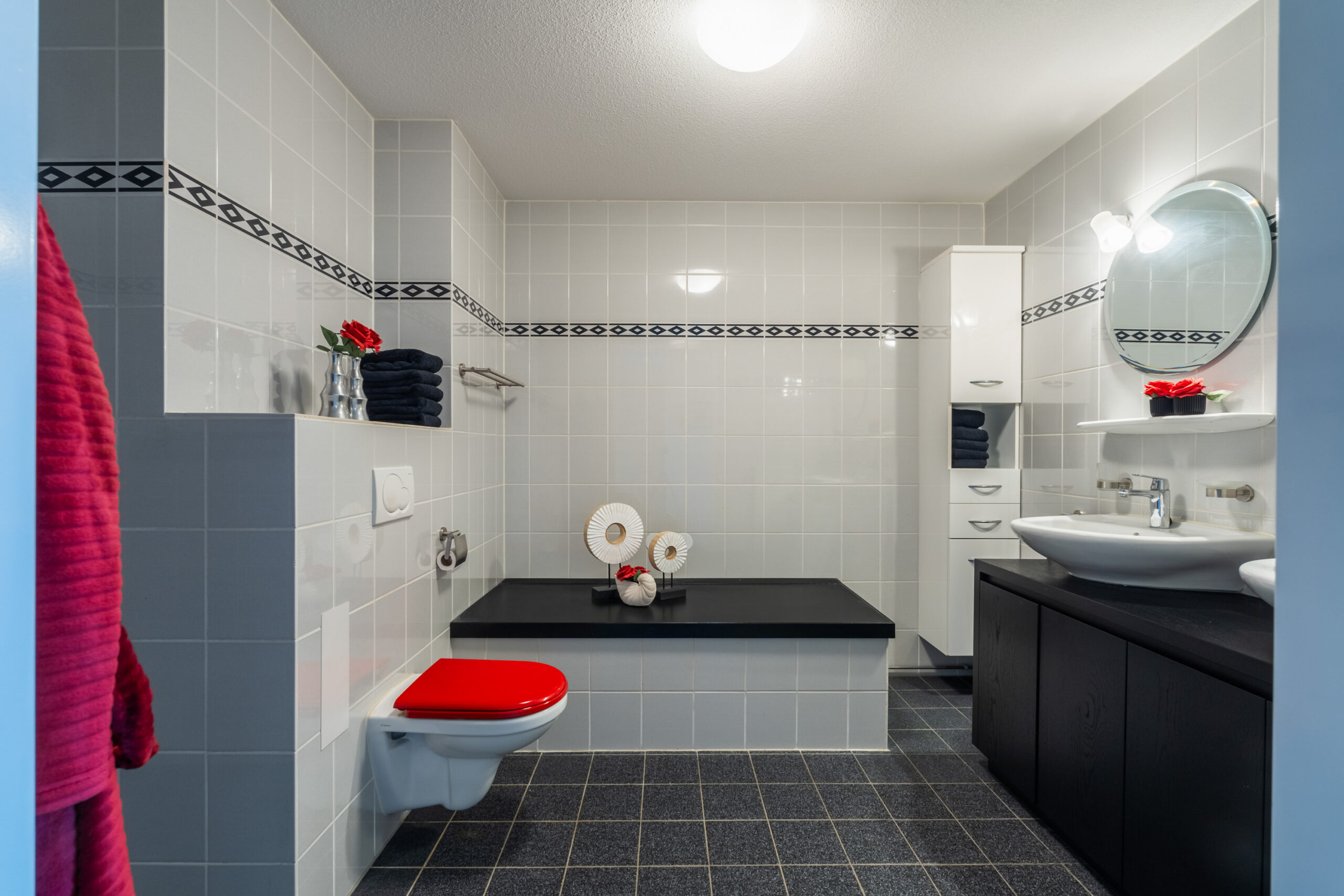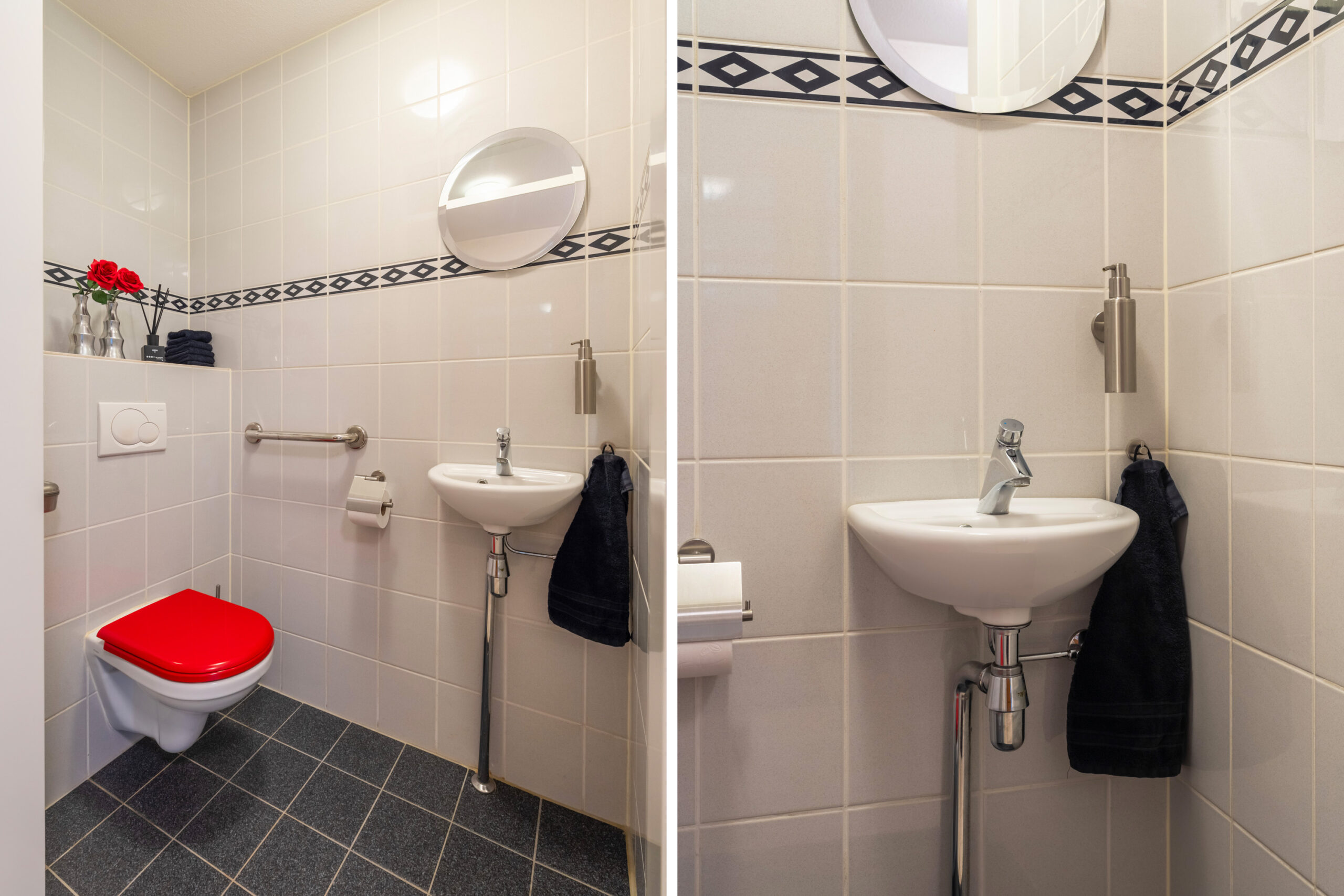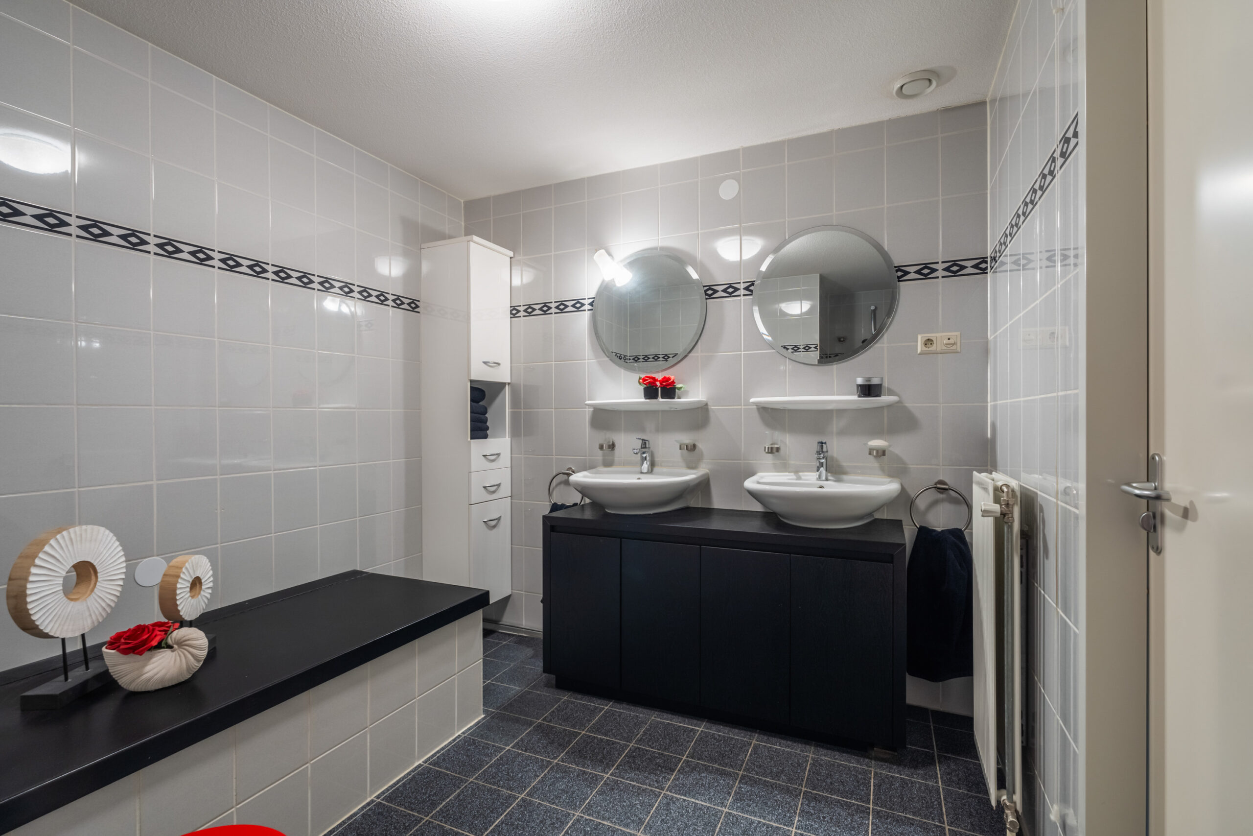 - Geheel betegelde moderne badkamer (2005) voorzien van vloerverwarming en douche, toilet en dubbele wastafel