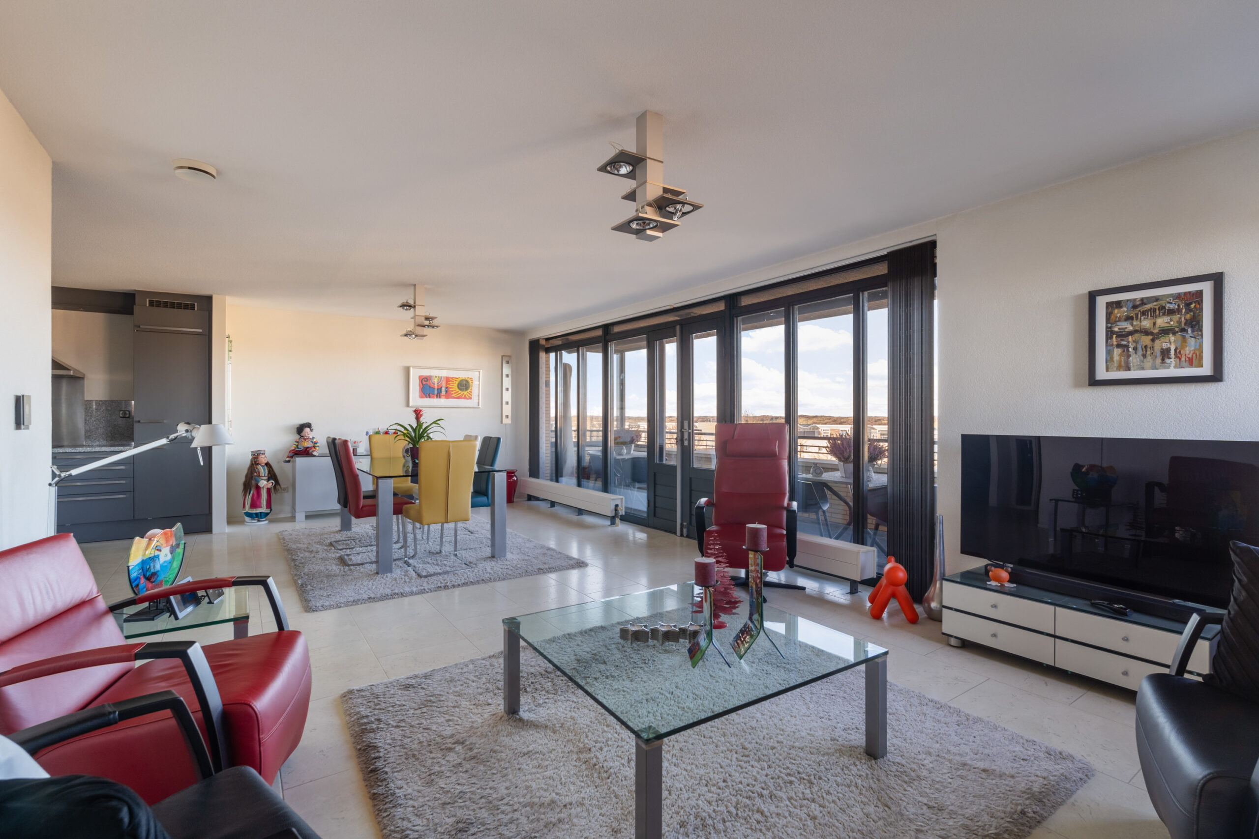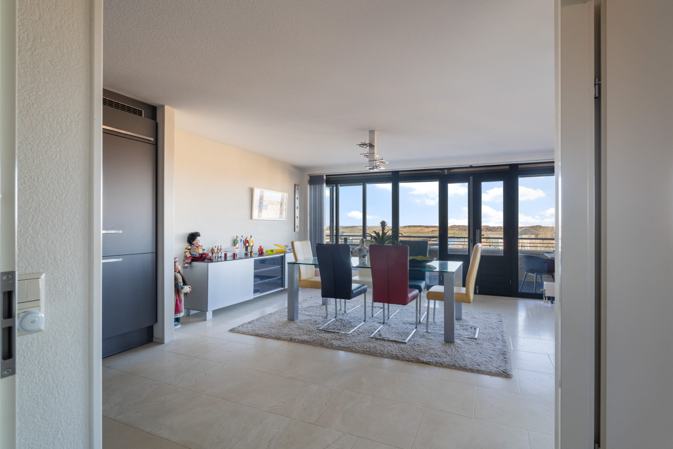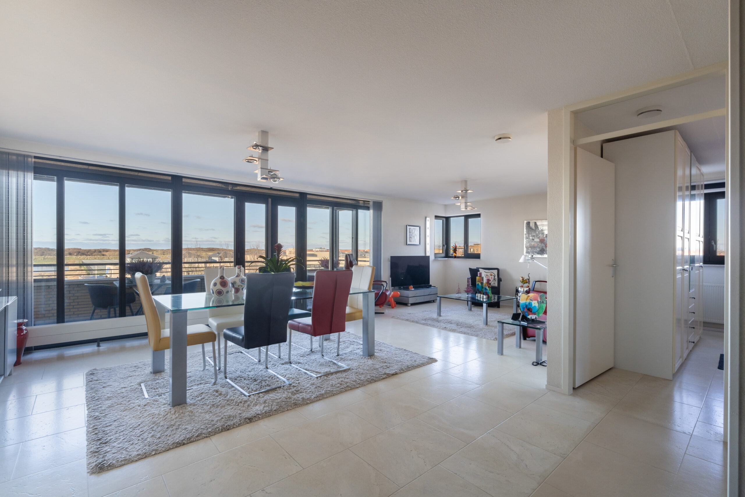 - Lichte riante woonkamer (ca. 36 m2) met vrij uitzicht als een schilderij op de duinen en groenzone. Als je de openslaande deuren naar het balkon opent, hoor je de zee! De kurkvloer maakt het lekker licht, ook door het zijraam. De elektrisch bedienbare zonwering zorgt voor de nodige schaduw in de middag.