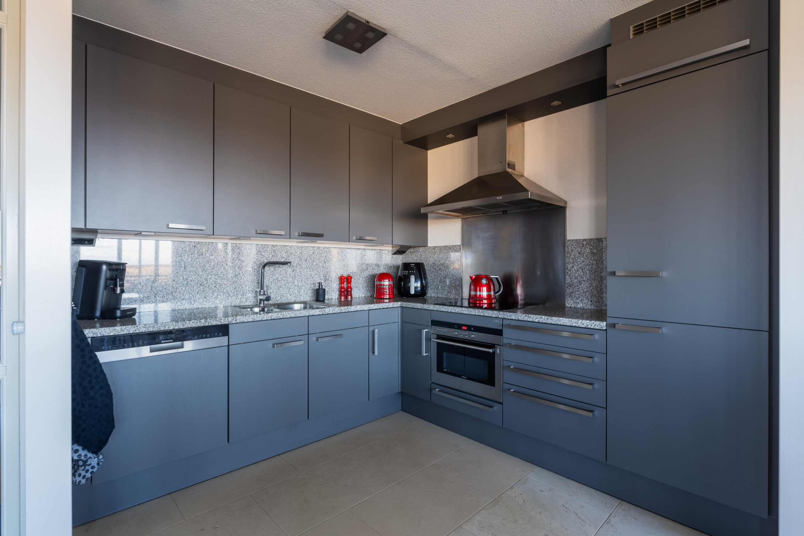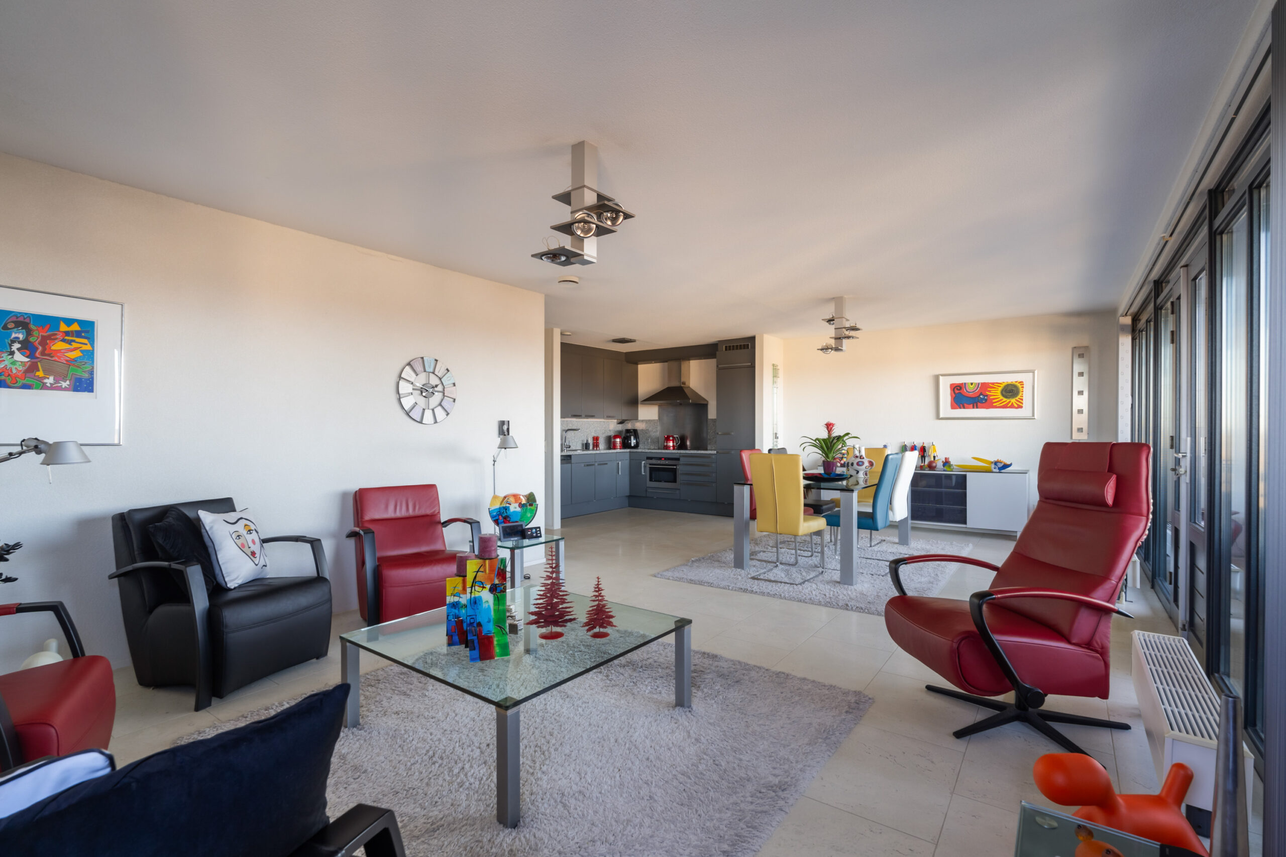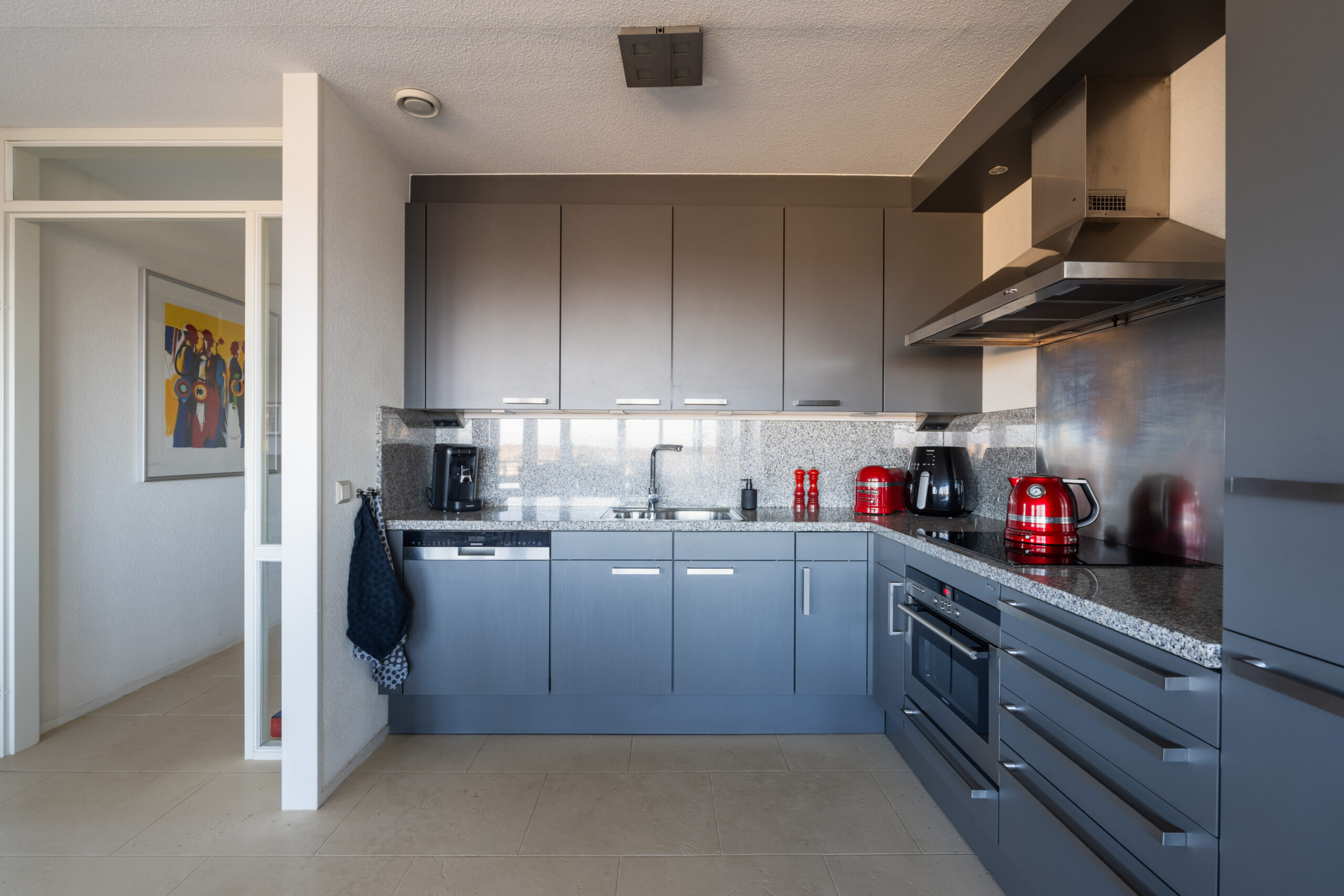 - Lichte riante woonkamer (ca. 36 m2) met vrij uitzicht als een schilderij op de duinen en groenzone. Als je de openslaande deuren naar het balkon opent, hoor je de zee! De kurkvloer maakt het lekker licht, ook door het zijraam. De elektrisch bedienbare zonwering zorgt voor de nodige schaduw in de middag.