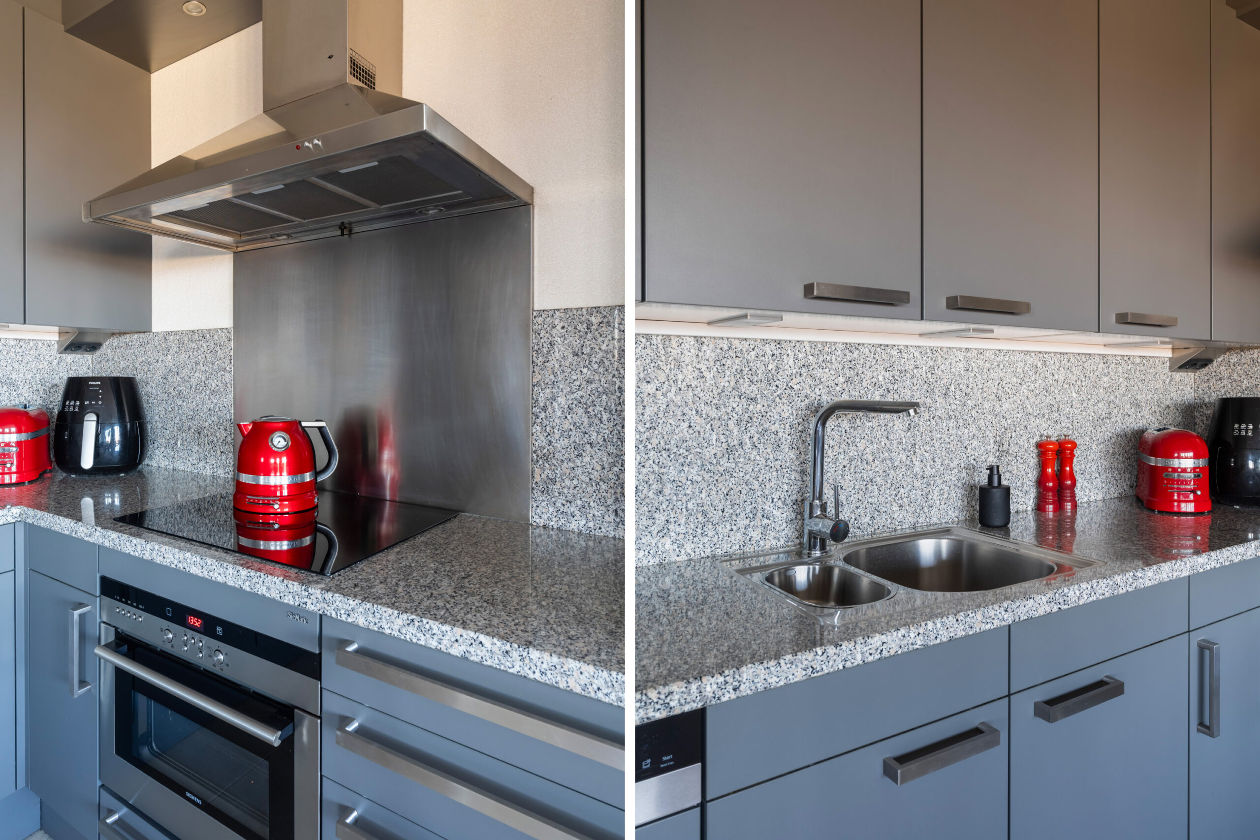 - Moderne grijze Siematic hoekkeuken (2005) met diverse inbouwapparatuur, zoals een vaatwasser, koelkast, inductiekookplaat en een combi magnetron/oven.