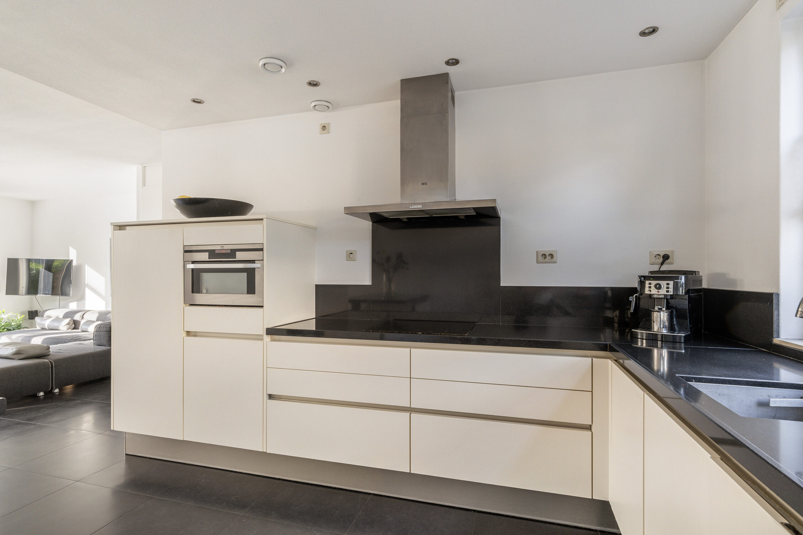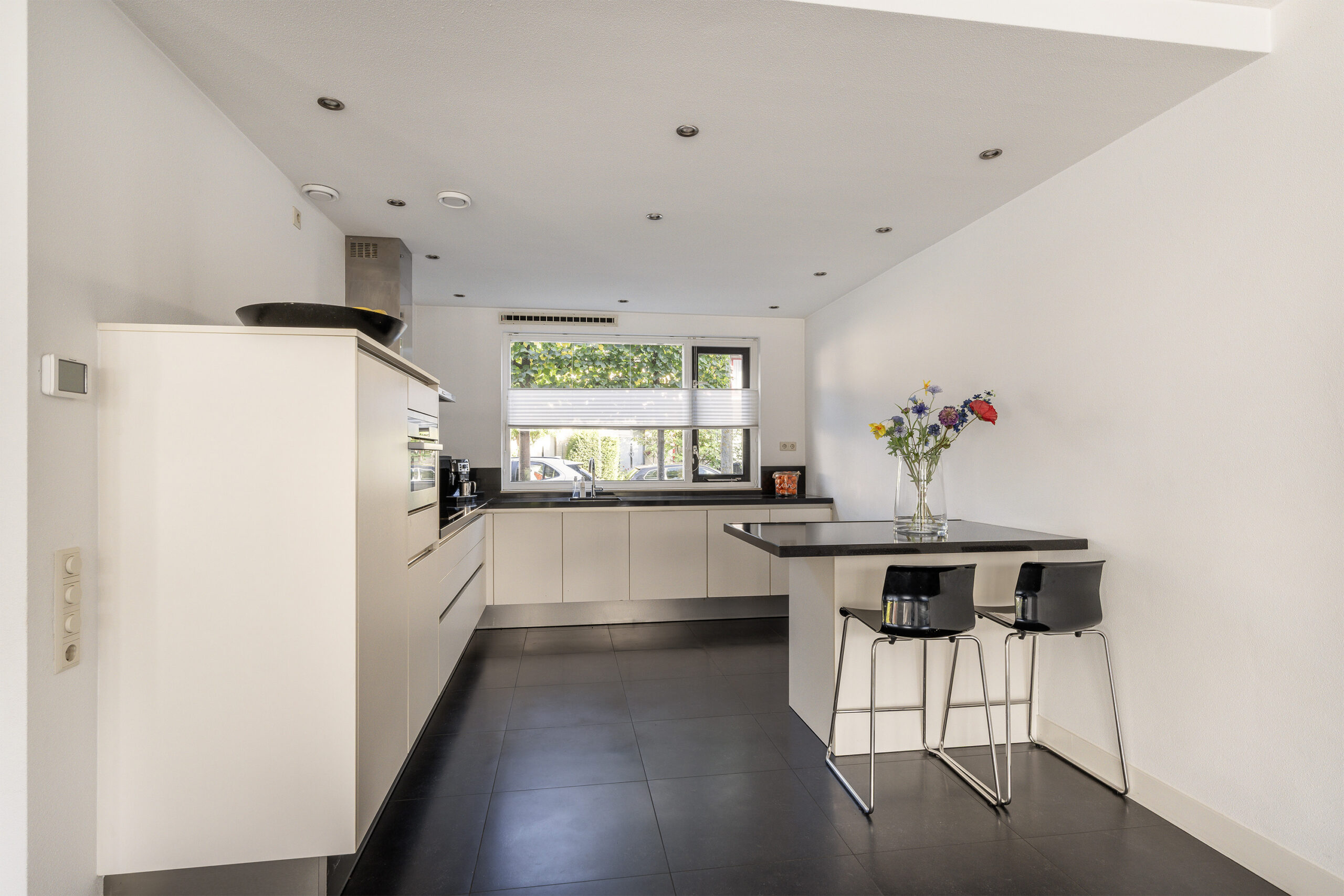 - Ruime en moderne open keuken in lichte kleurstelling met composiet aanrechtblad, diverse inbouwapparatuur, veel opbergruimte en grote raampartij.