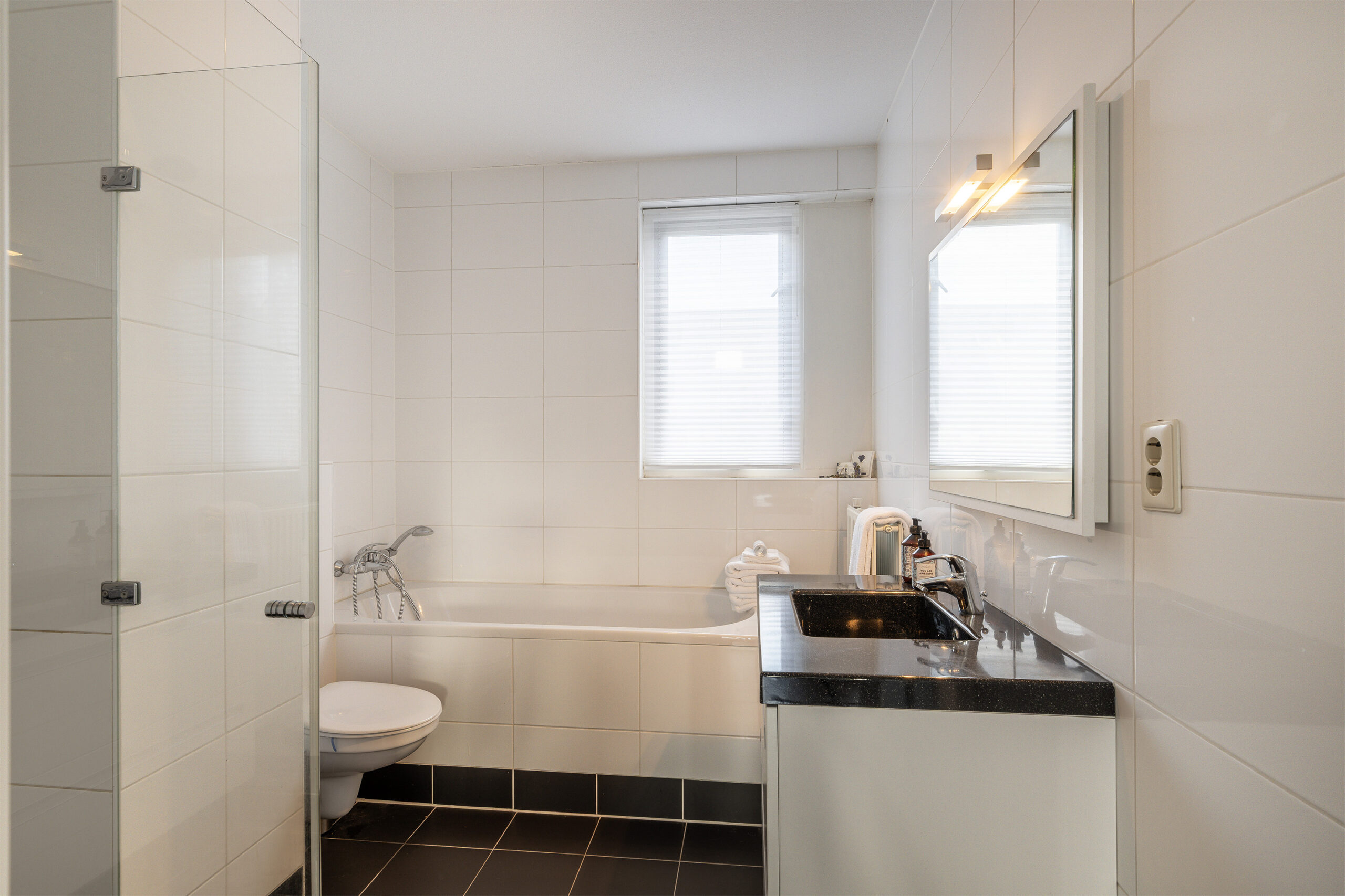 - Geheel betegelde badkamer met raampartij en voorzien van ligbad, inloopdouche, dubbel wastafelmeubel, 2e toilet en radiator.