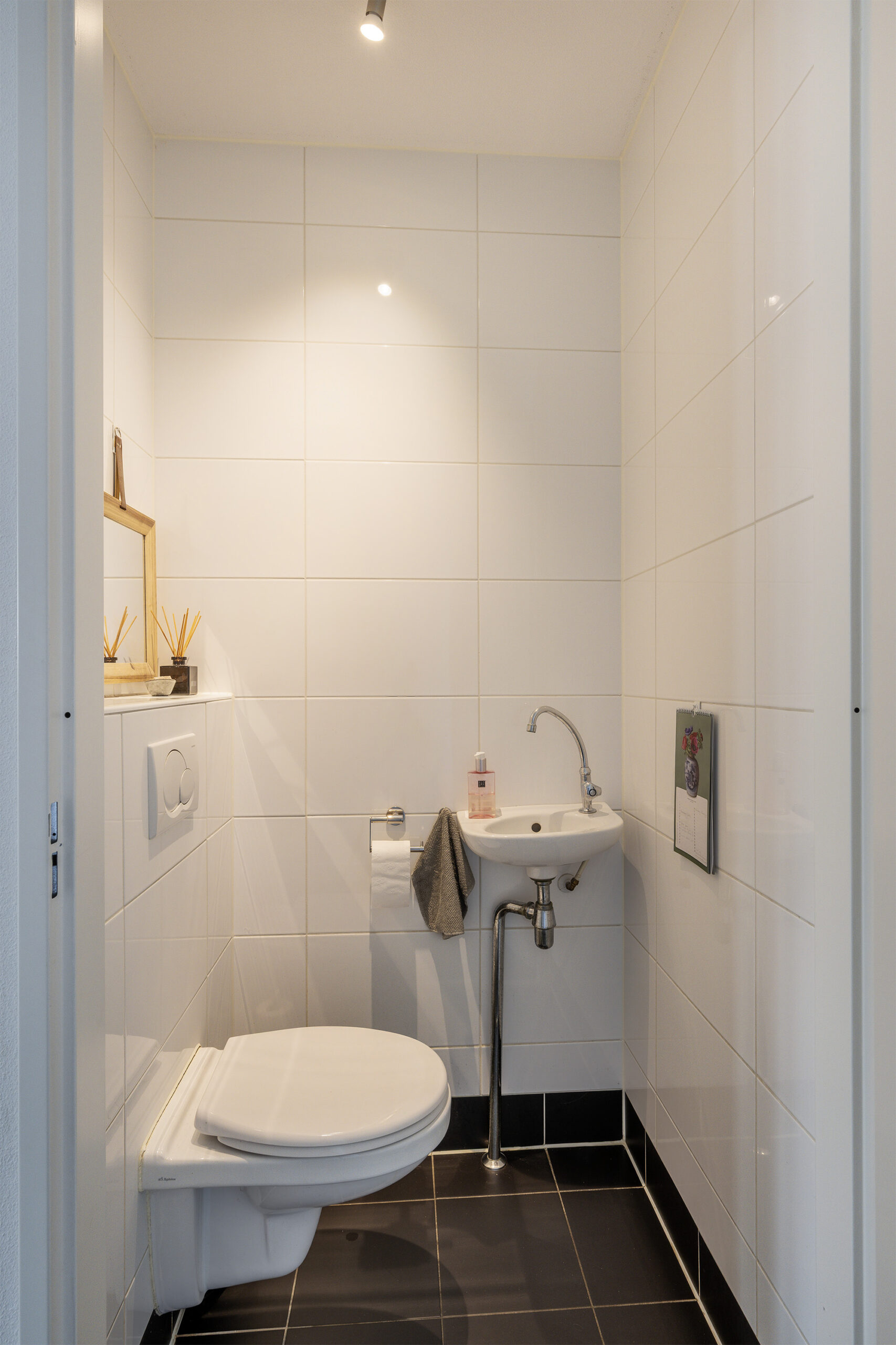 - Nette geheel betegelde toiletruimte met wandcloset en hoekfonteintje.