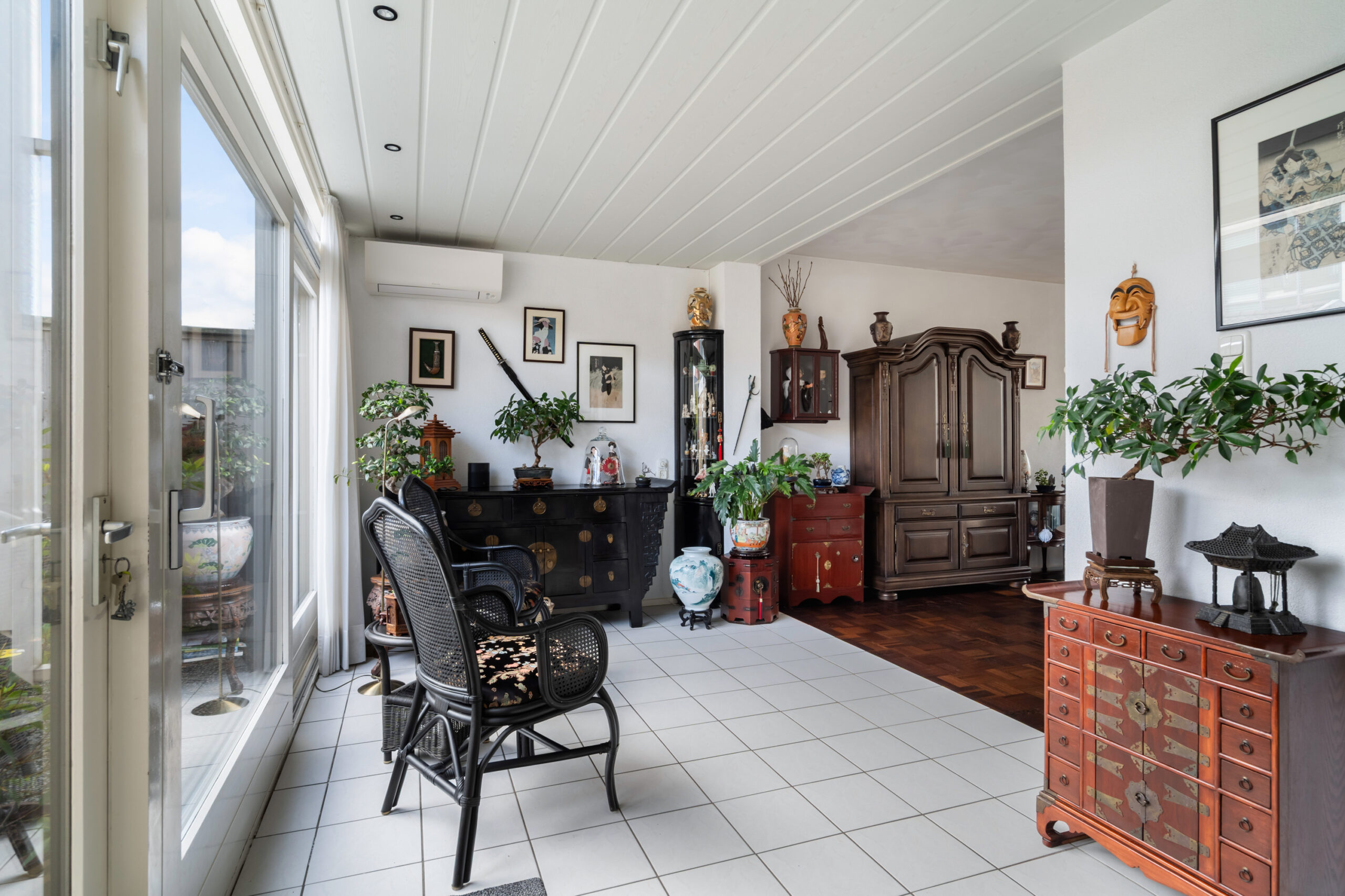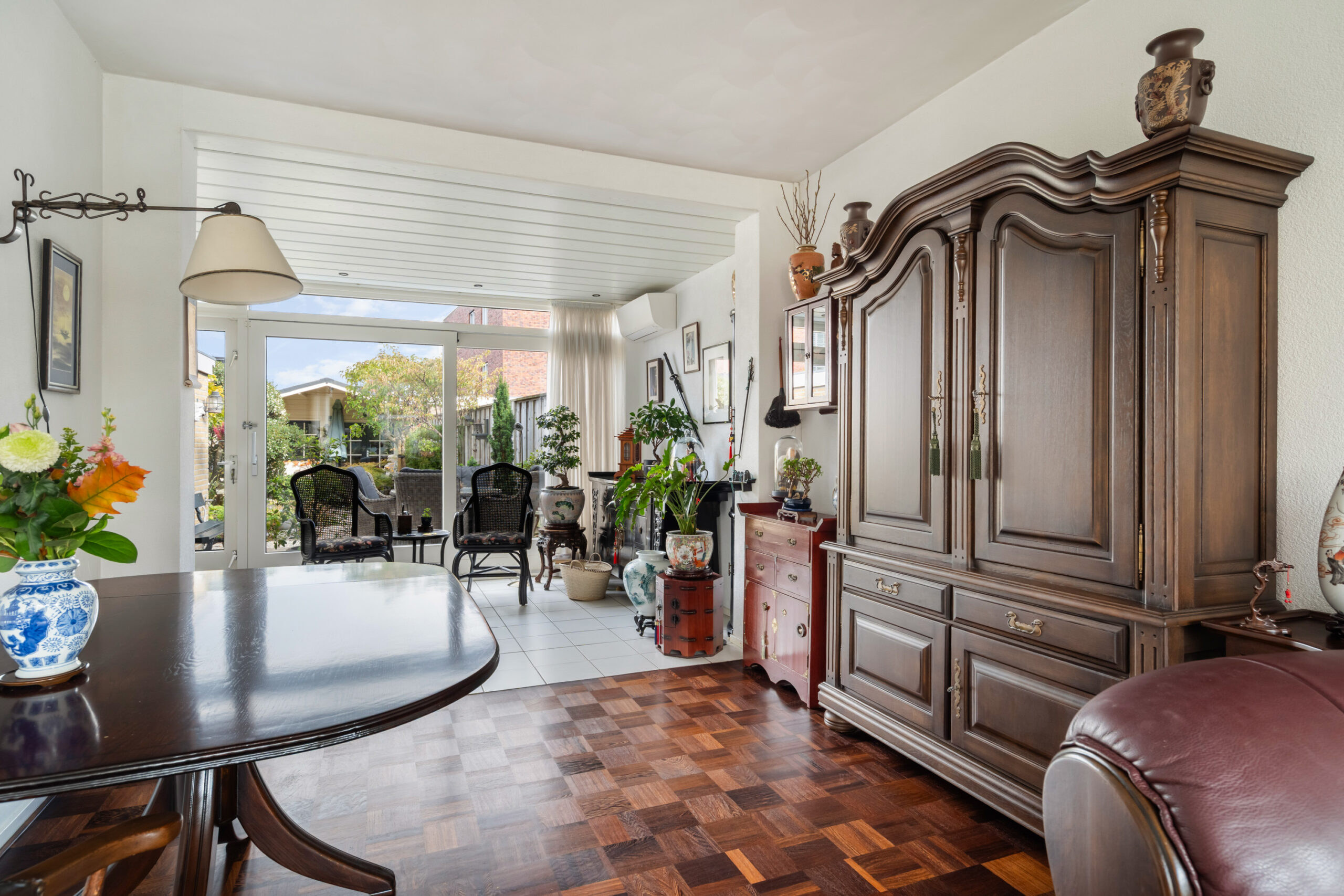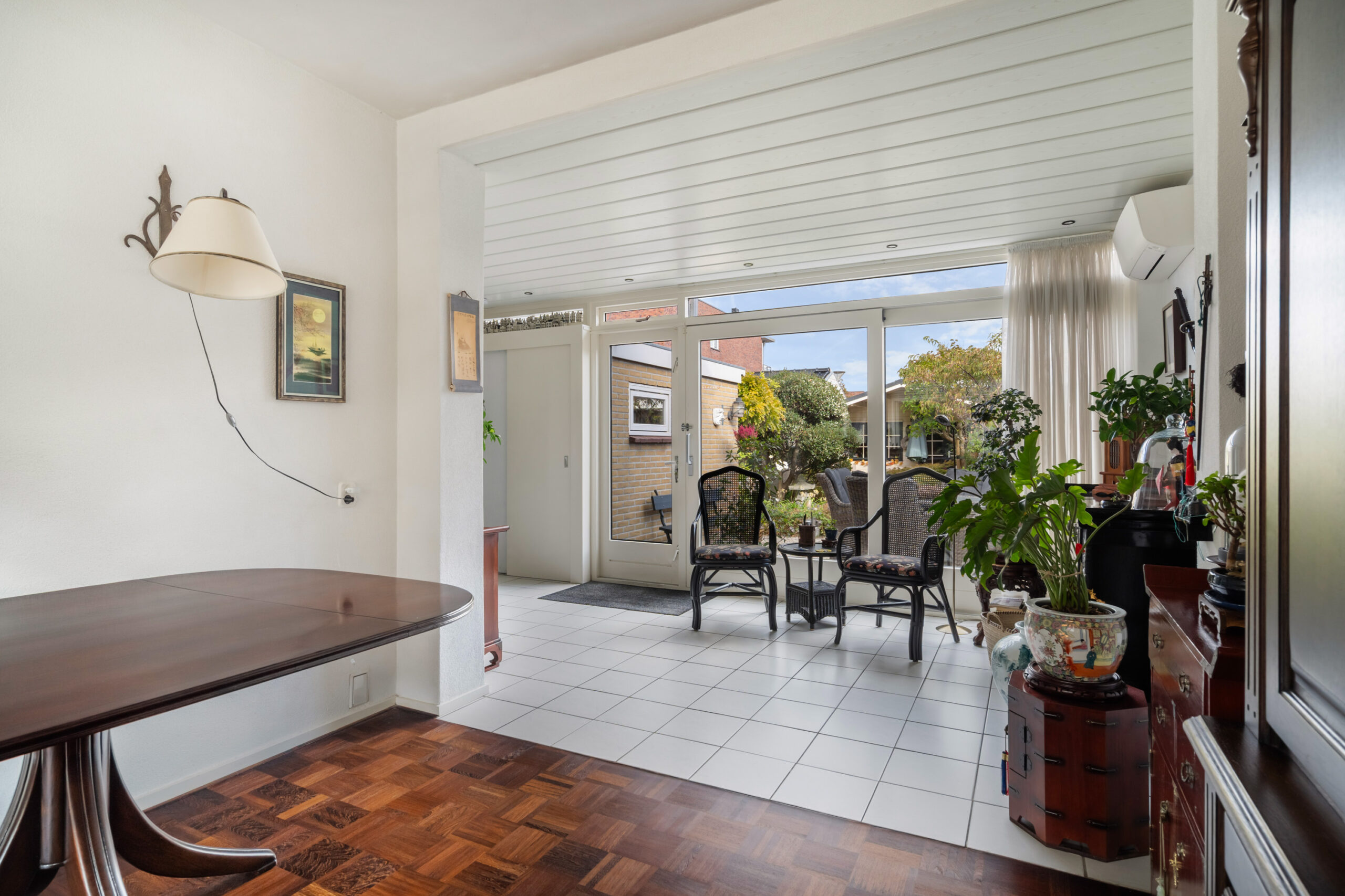 - Zitkamer in de uitbouw (1992) voorzien van plavuizen vloer, vloerverwarming, airco, schuifpui en loopdeur naar de achtertuin;