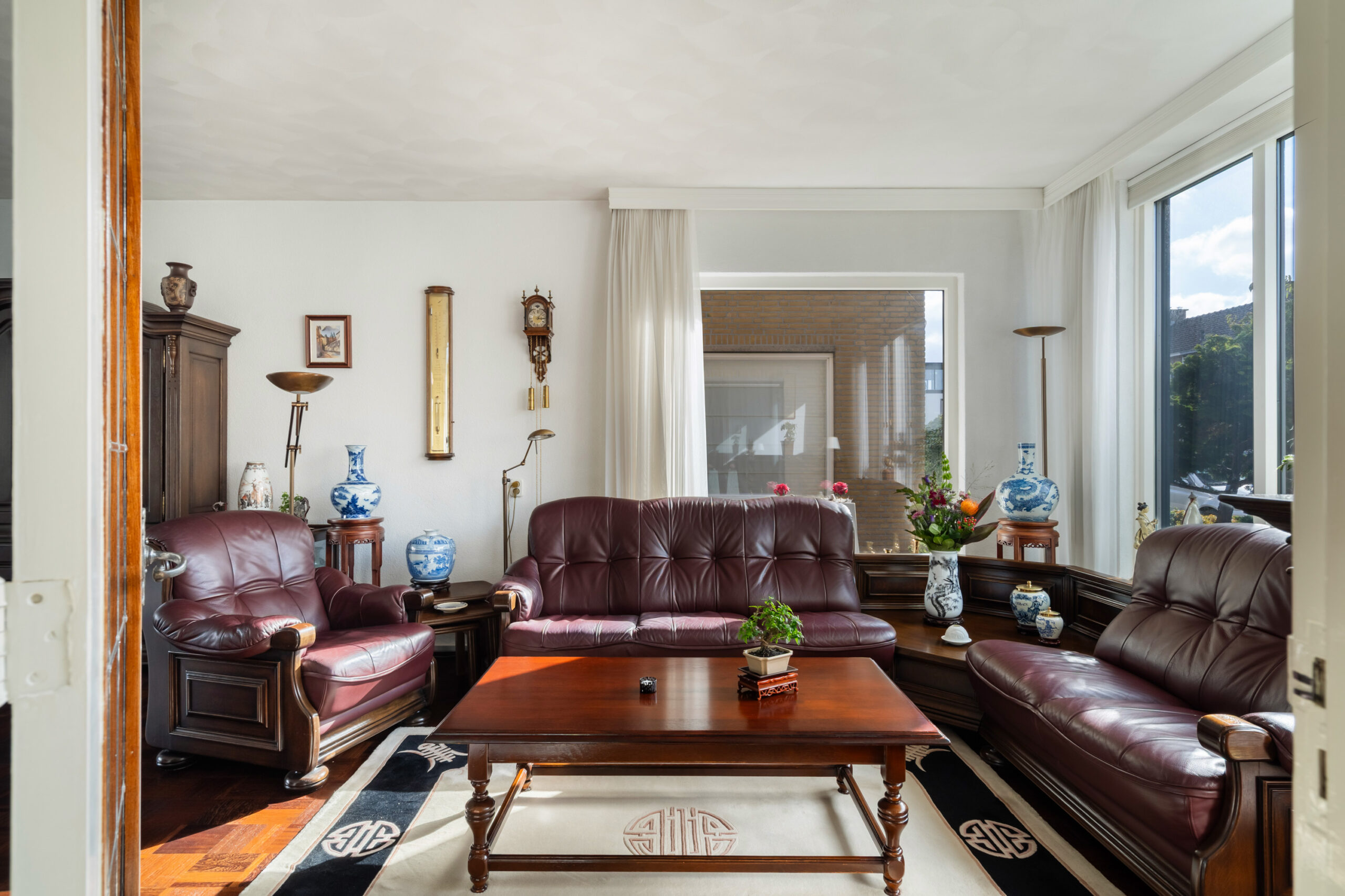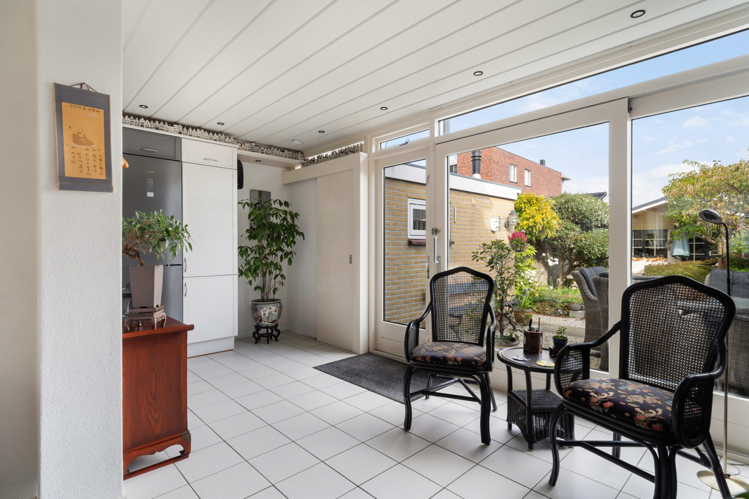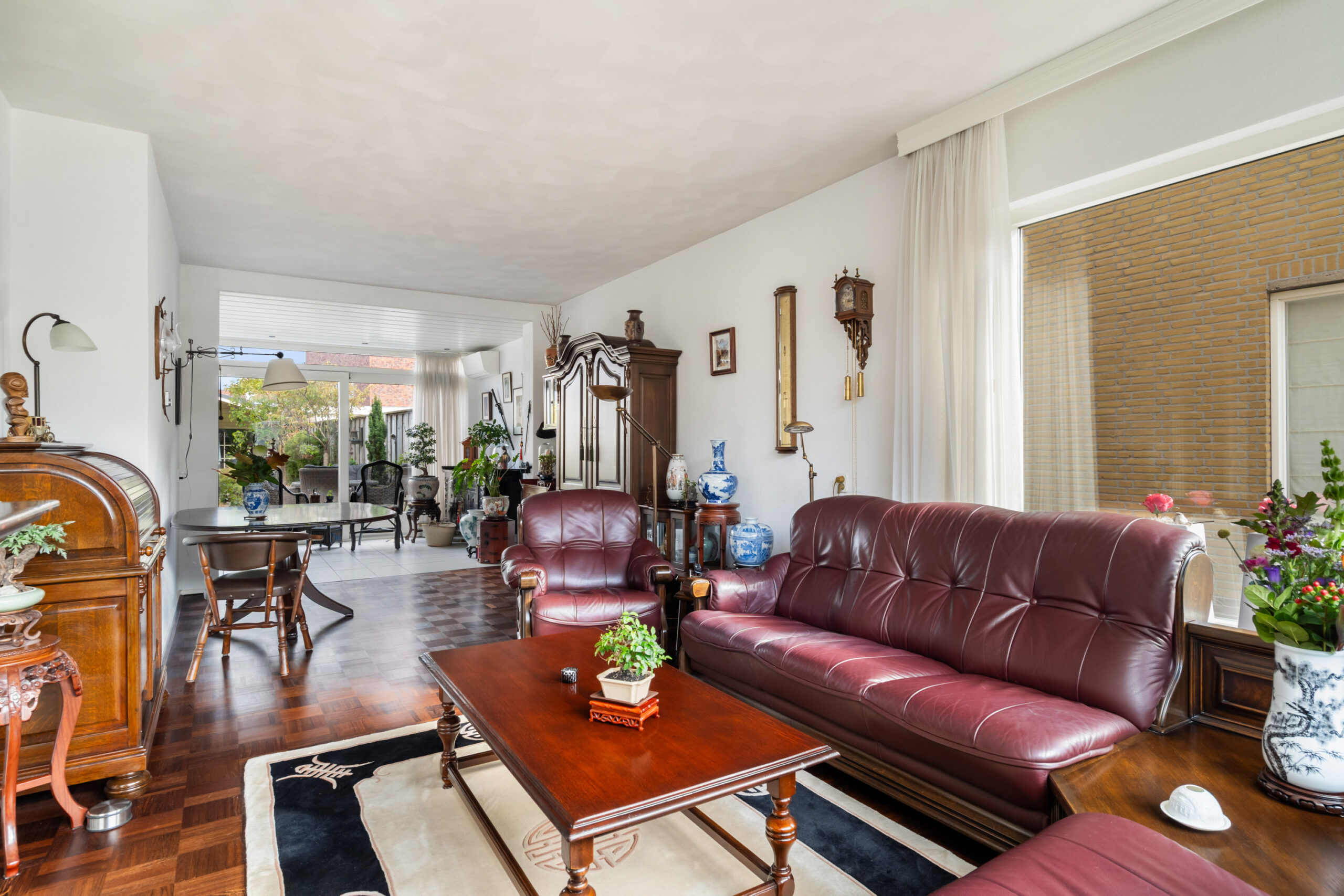 - Zitkamer in de uitbouw (1992) voorzien van plavuizen vloer, vloerverwarming, airco, schuifpui en loopdeur naar de achtertuin;