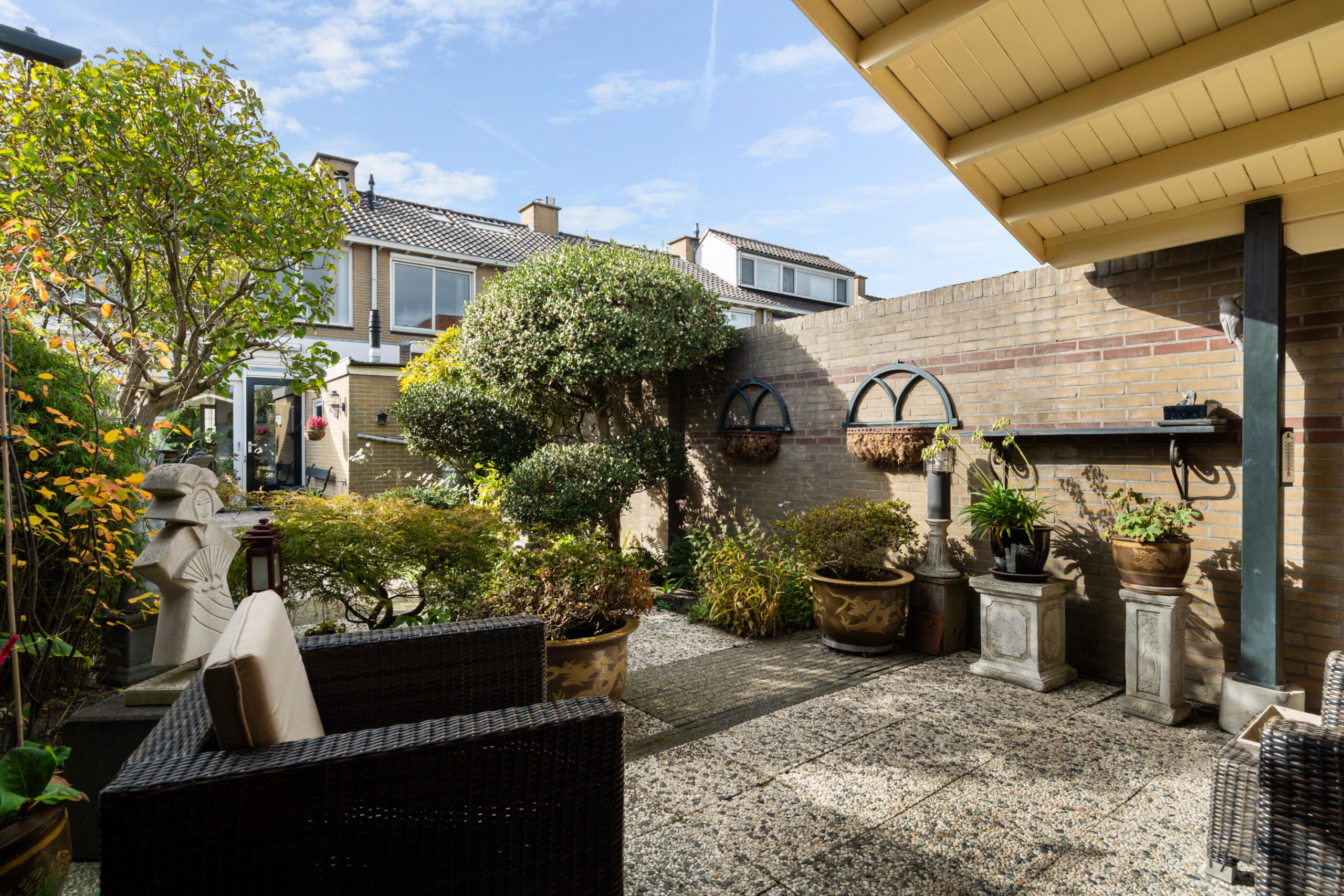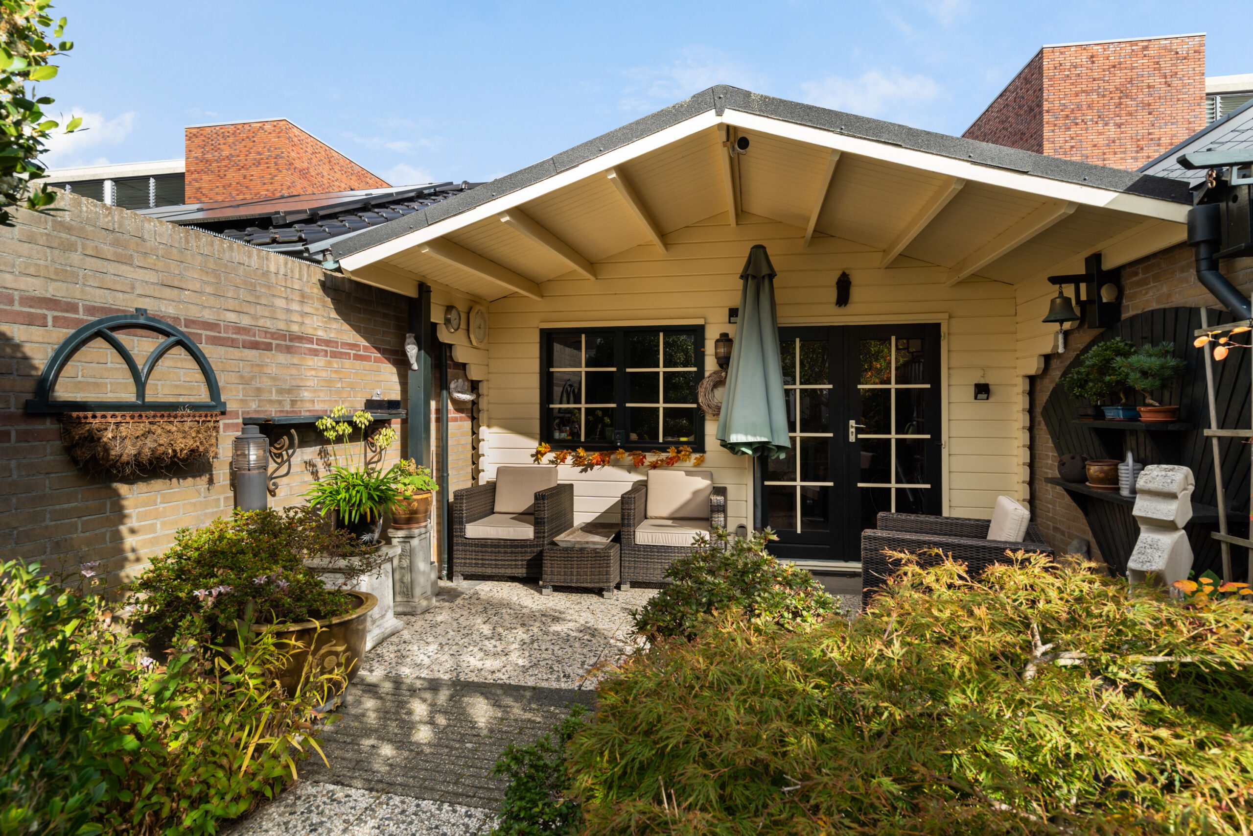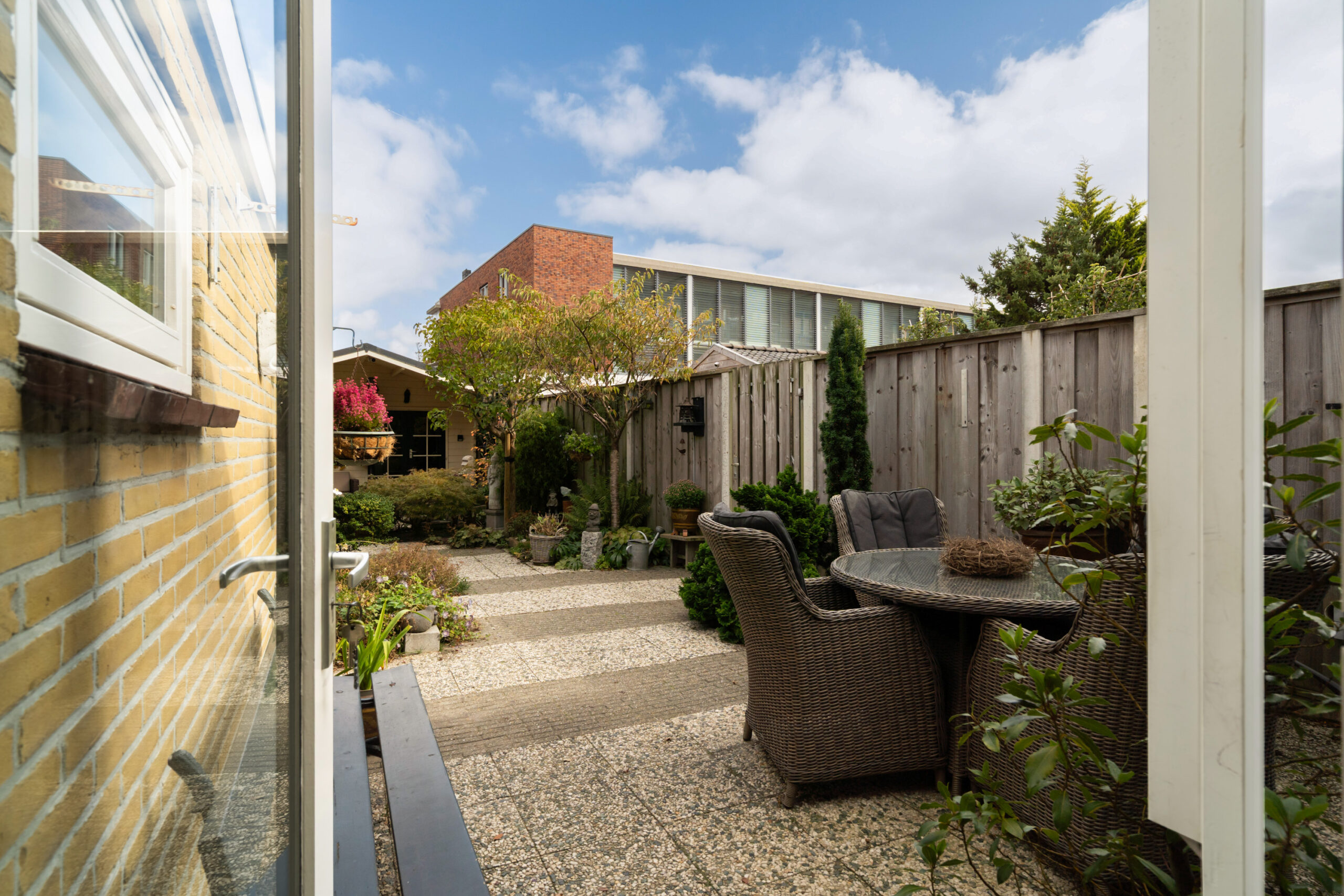 - Sfeervolle achtertuin van maar liefst 14 meter diep (NO) voorzien van eenvoudige tegels en sierbeplanting. De tuin is voorzien van een tuinhuis en biedt toegang tot het zij-erf en de garage.