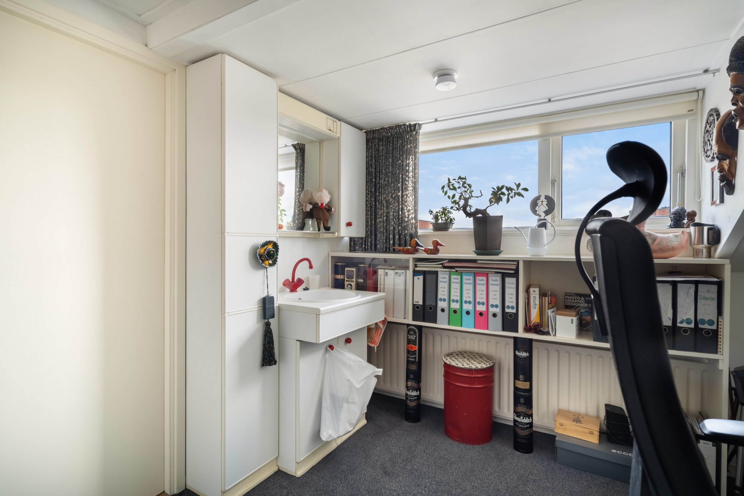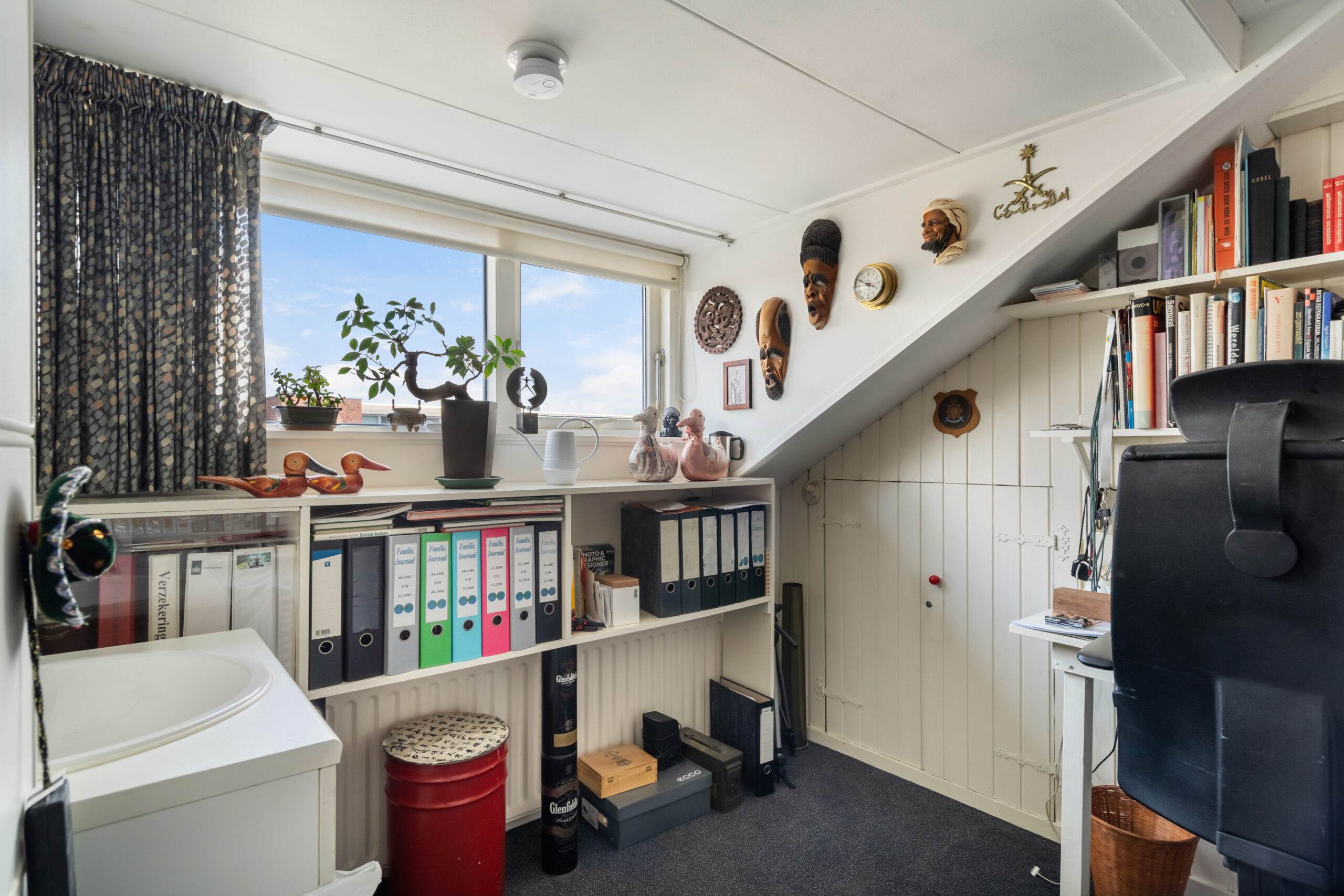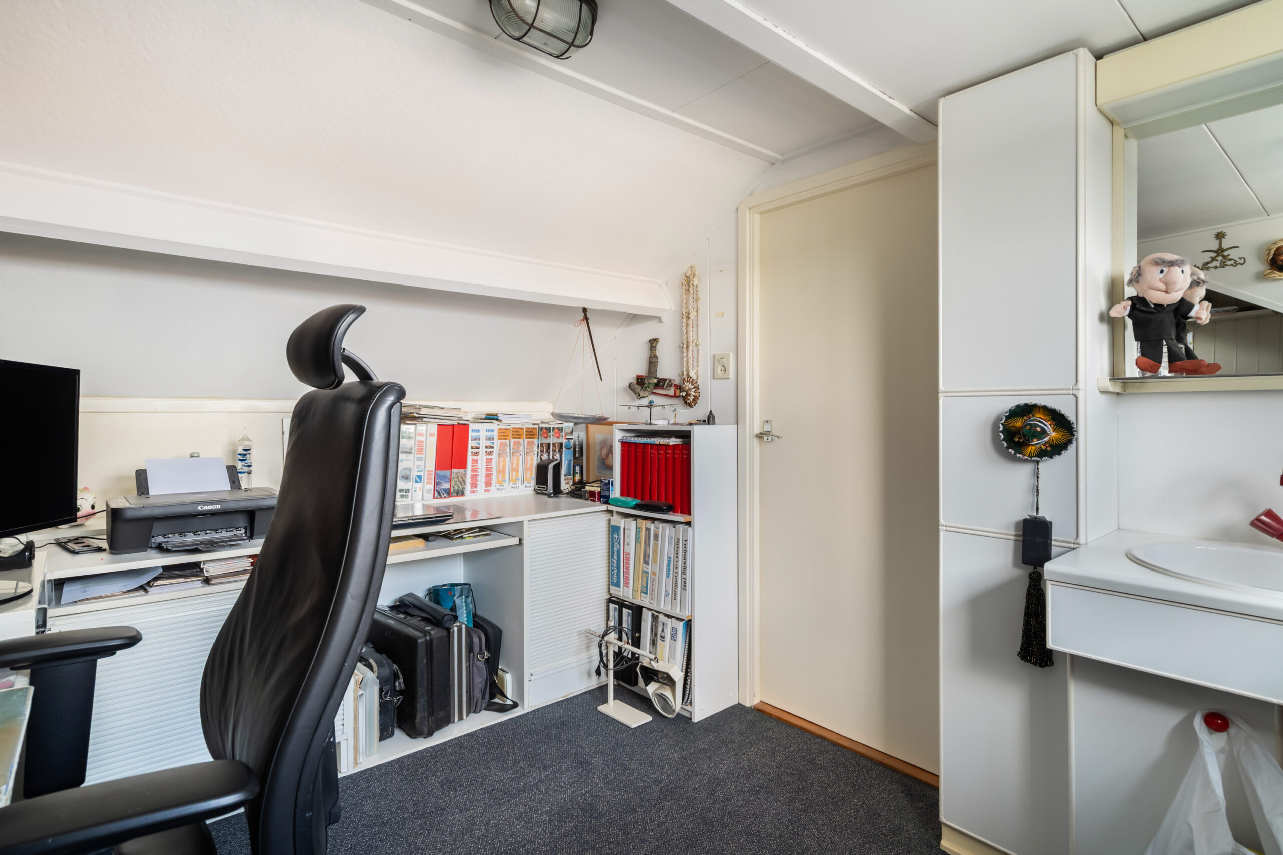 - Zolderetage voorzien van dakkapel, kamer met wastafel en diverse knieschotten.