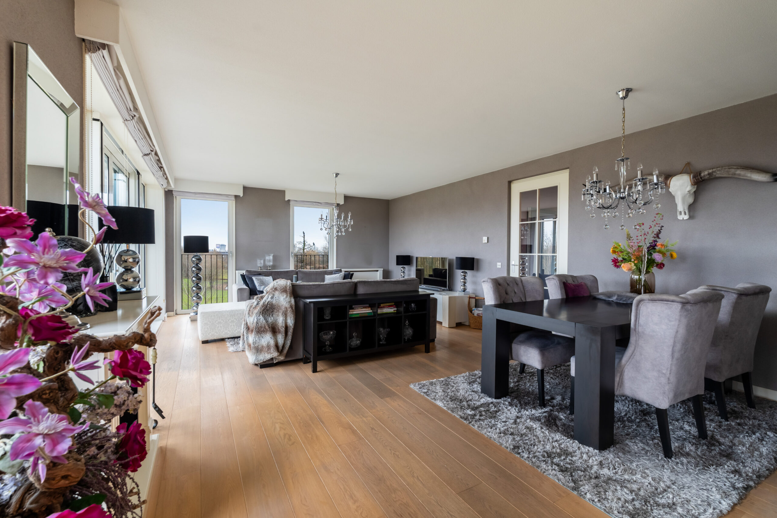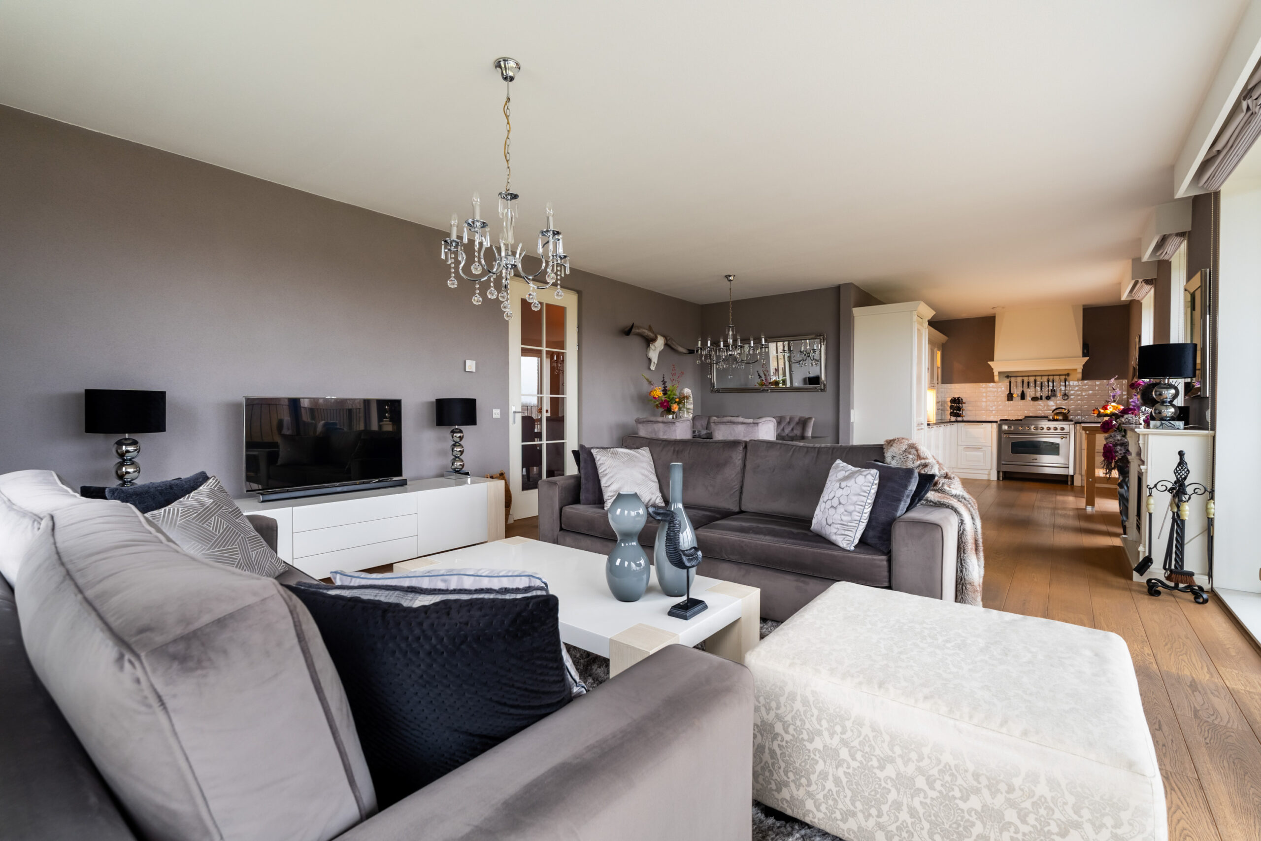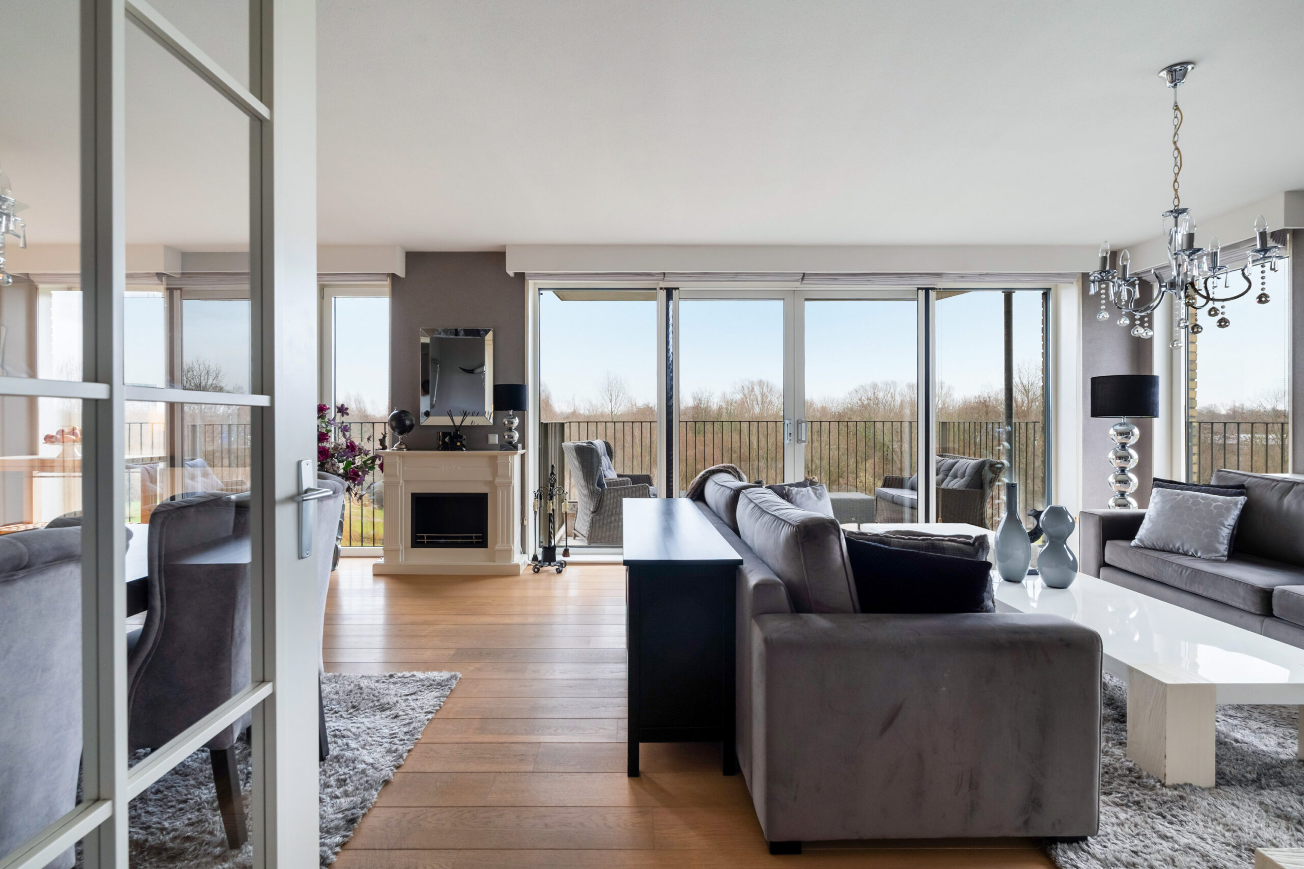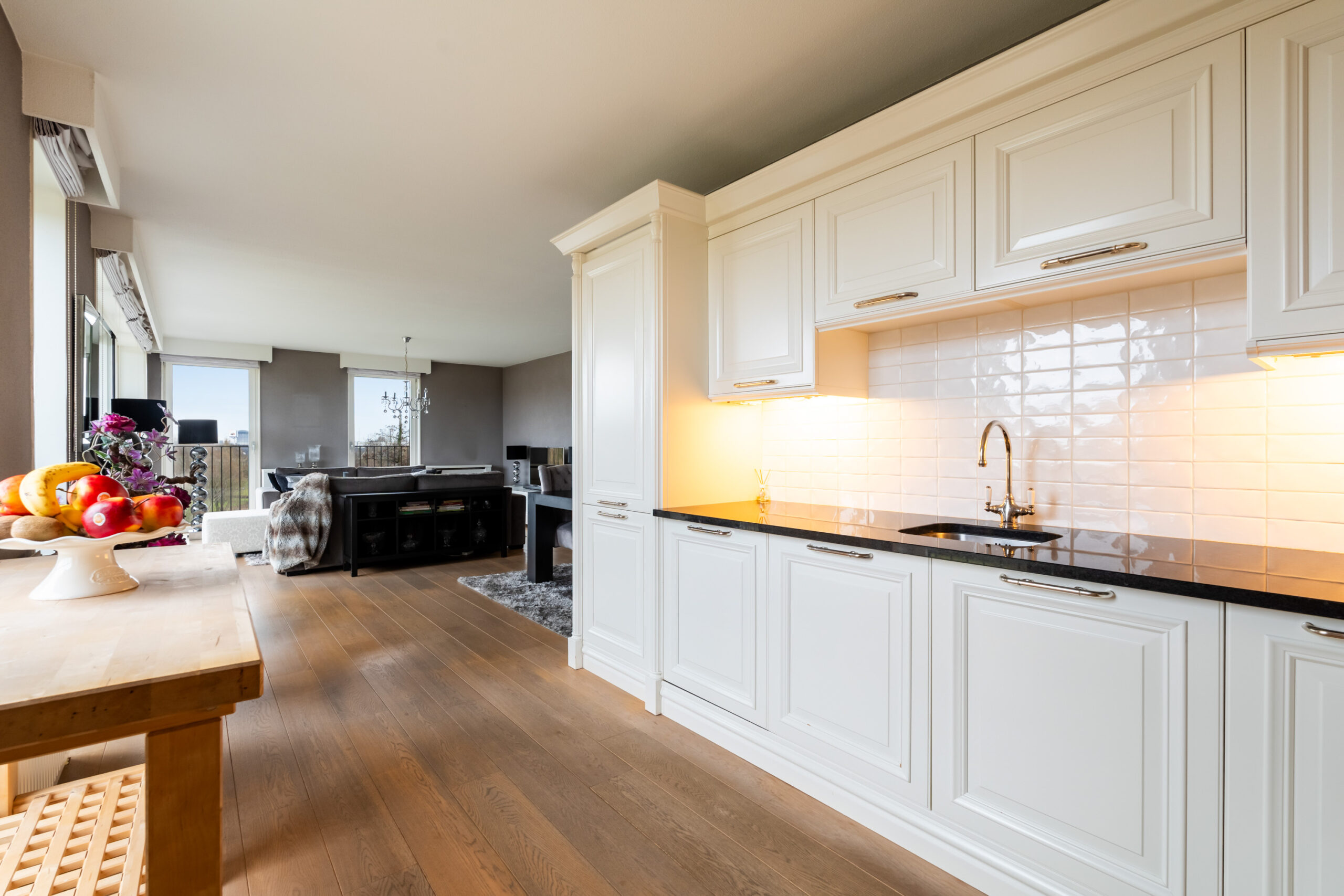 - Riante woonkamer voorzien van houten vloer en open keuken met diverse inbouwapparatuur, waaronder: een Boretti gasfornuis, afzuigkap, vaatwasser, koel-vriescombinatie en schuifpui naar het balkon gelegen op het oosten. Door de diverse raampartijen heeft u schitterend uitzicht over de wijde omgeving.