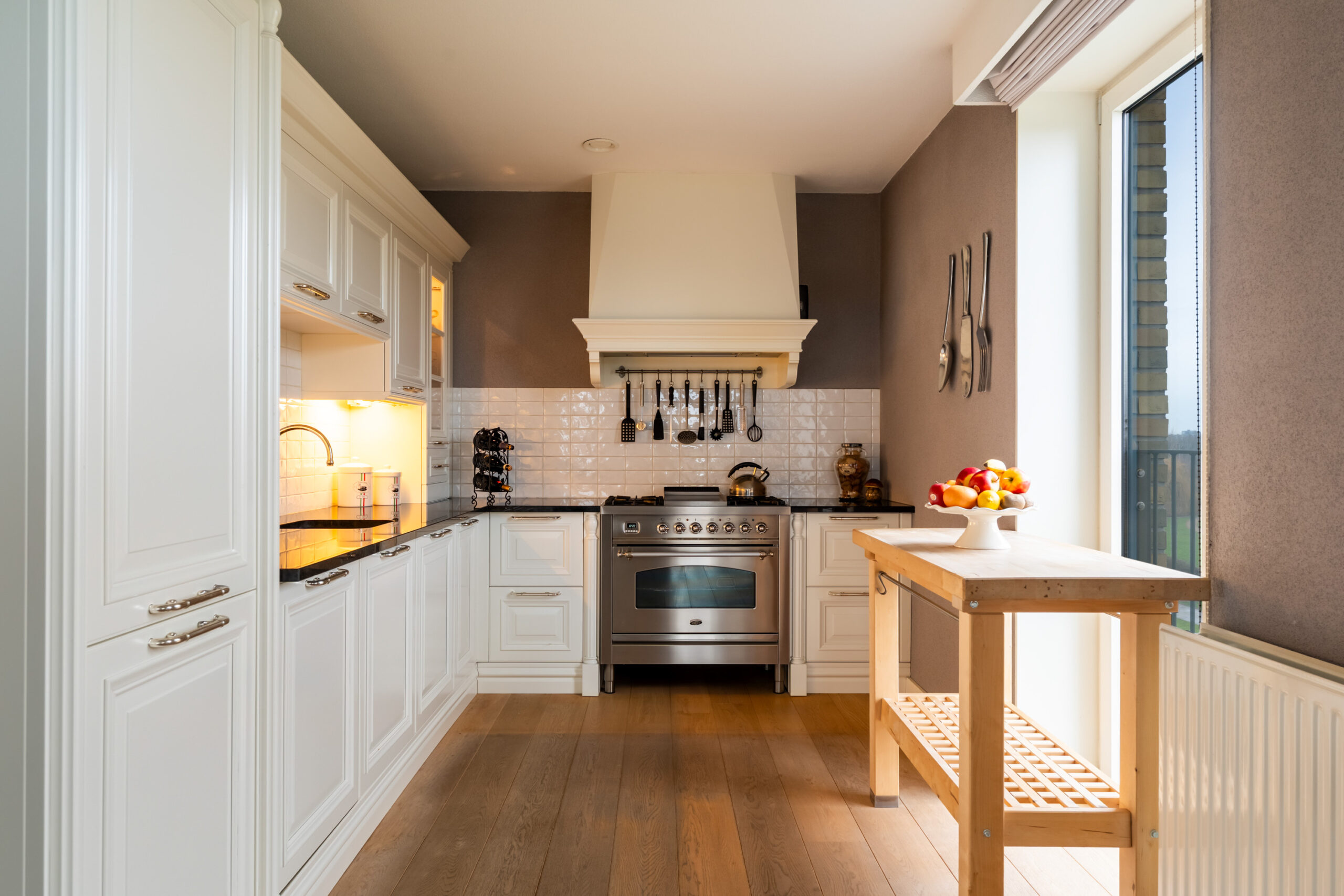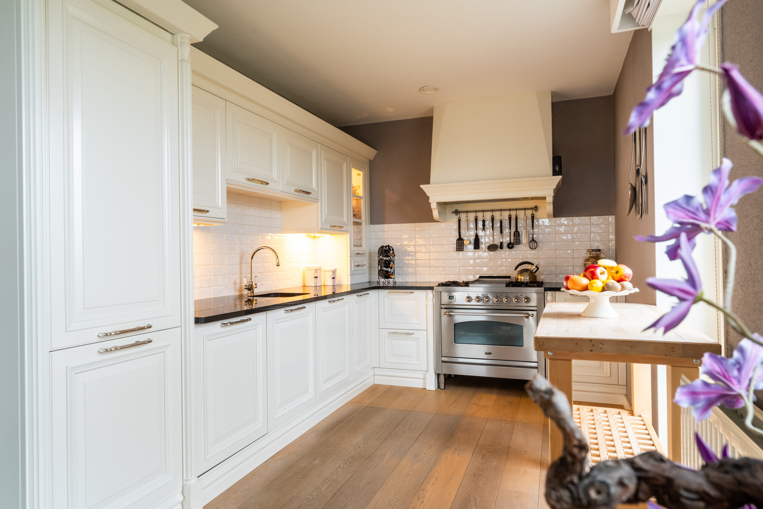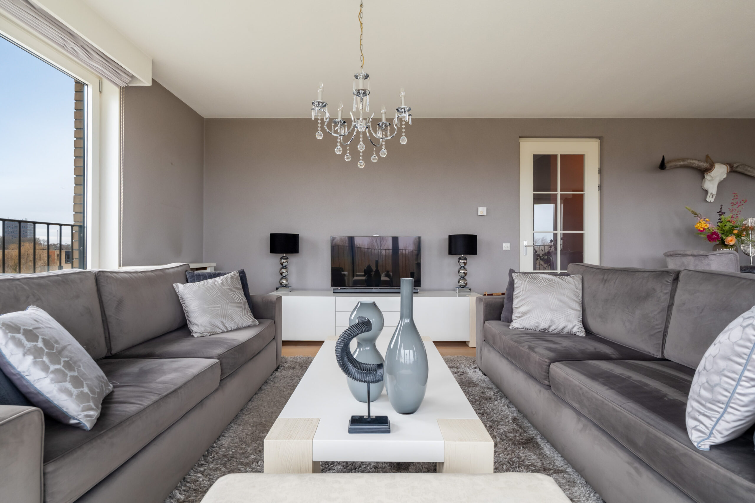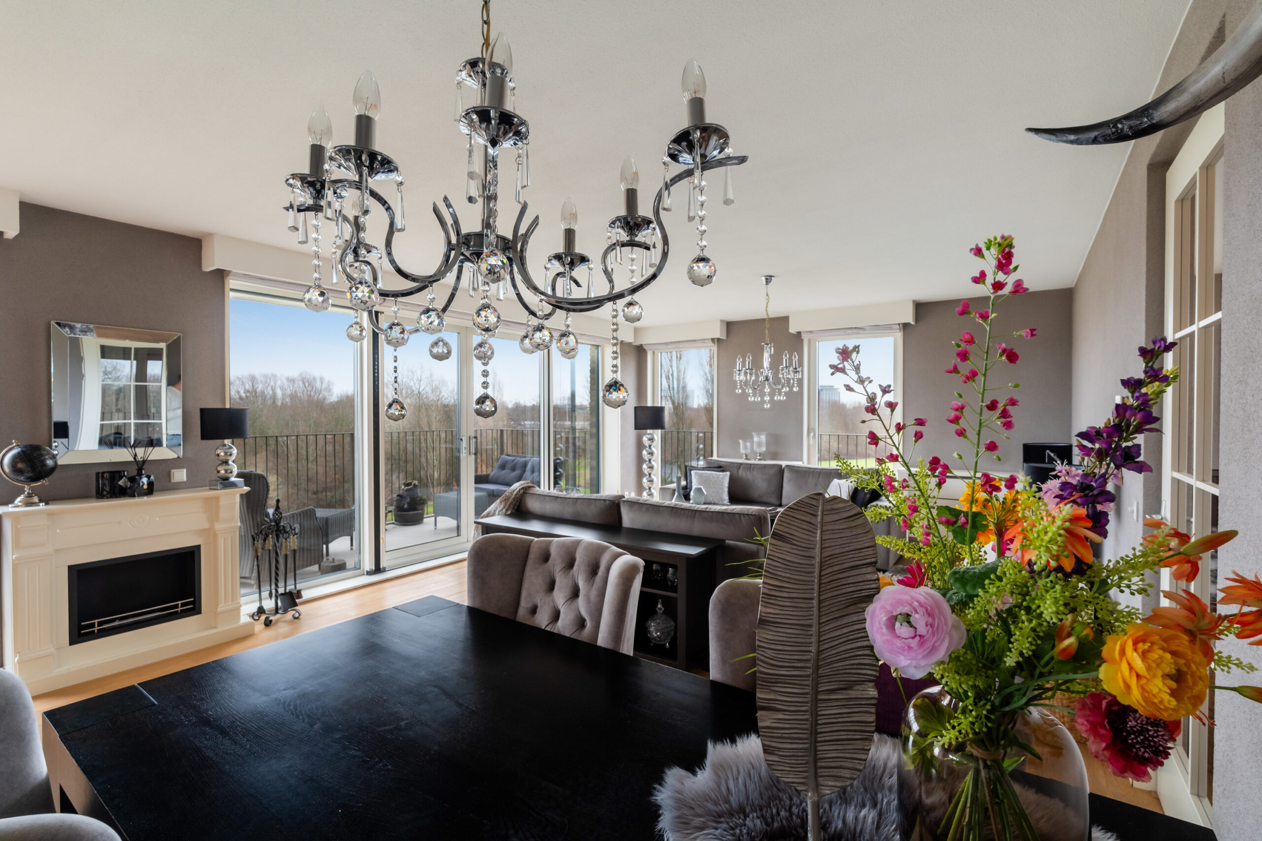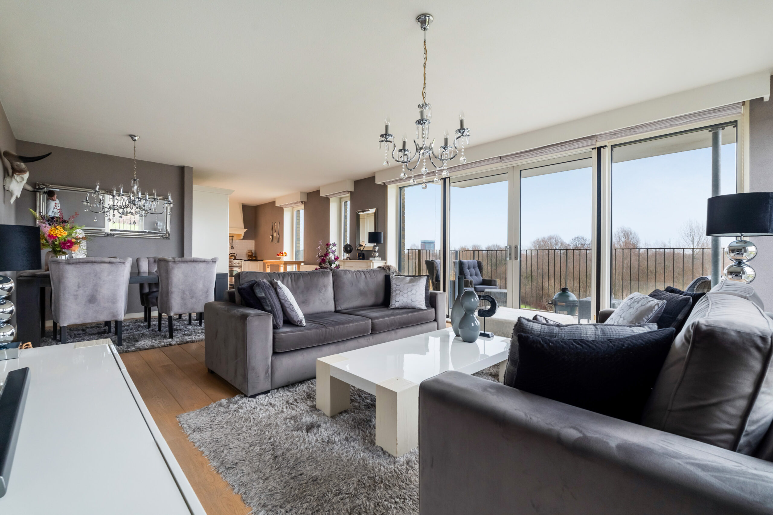 - Riante woonkamer voorzien van houten vloer en open keuken met diverse inbouwapparatuur, waaronder: een Boretti gasfornuis, afzuigkap, vaatwasser, koel-vriescombinatie en schuifpui naar het balkon gelegen op het oosten. Door de diverse raampartijen heeft u schitterend uitzicht over de wijde omgeving.