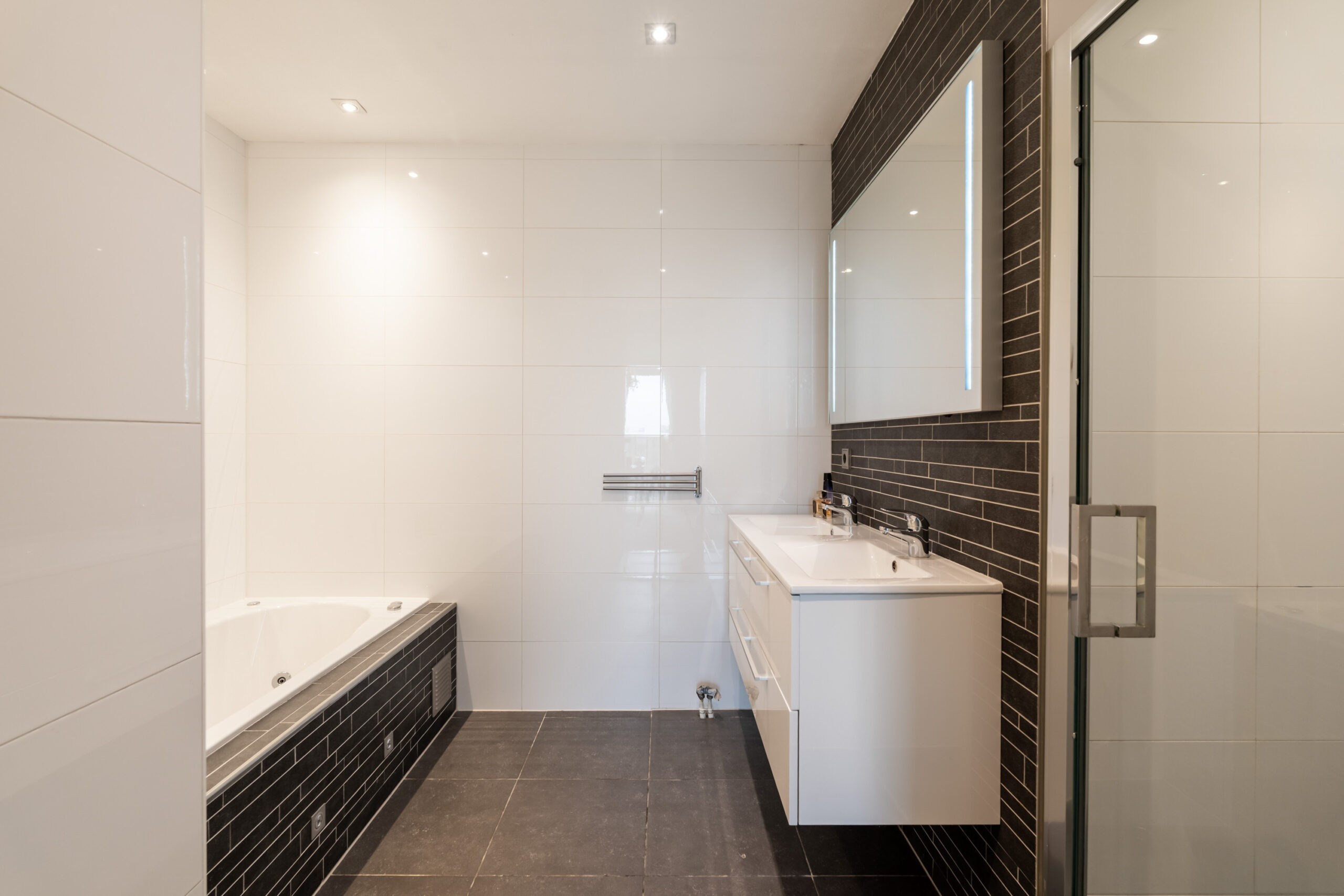 - Geheel betegelde badkamer, voorzien van whirpool, dubbel wastafelmeubel en inloopdouche.