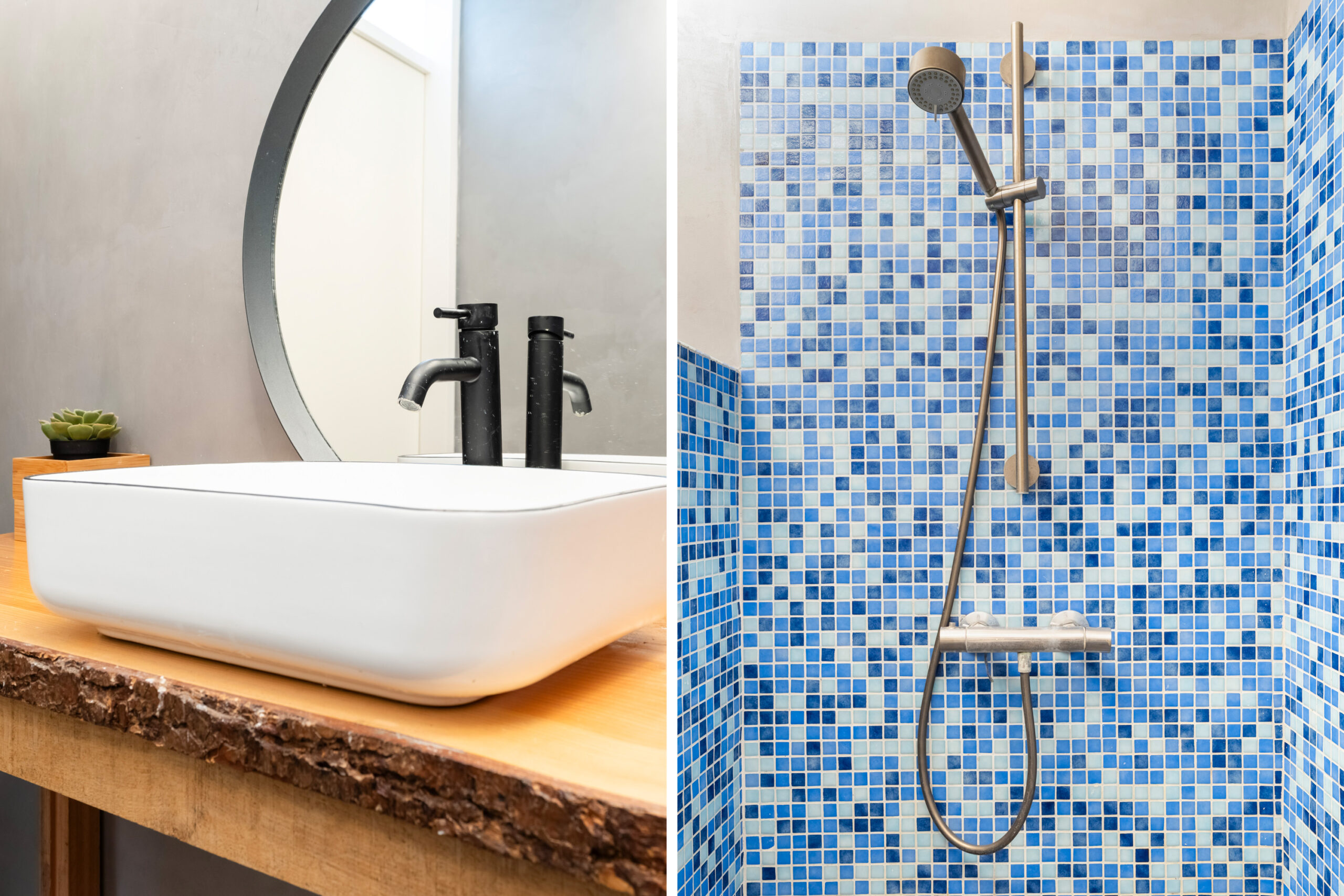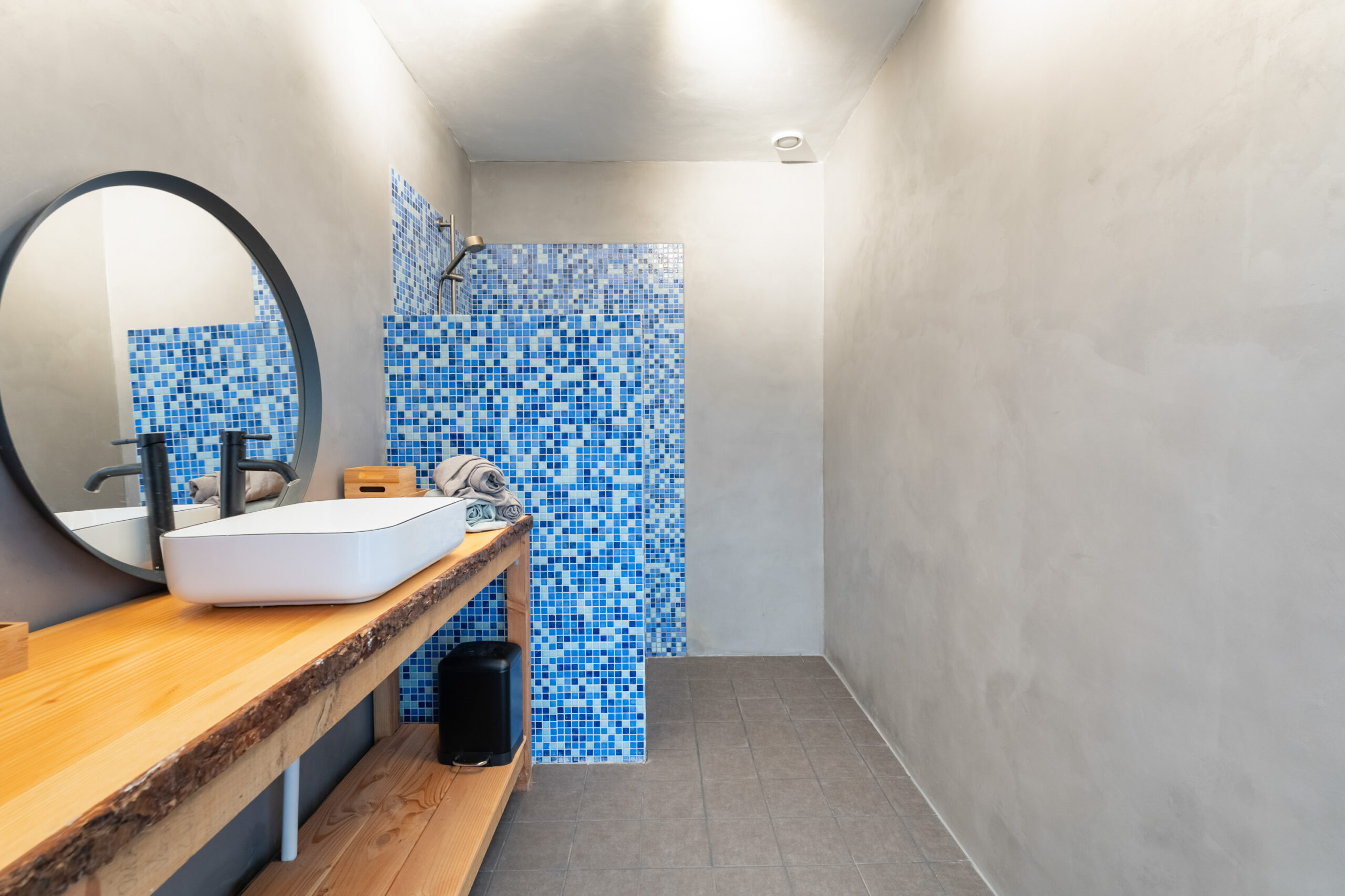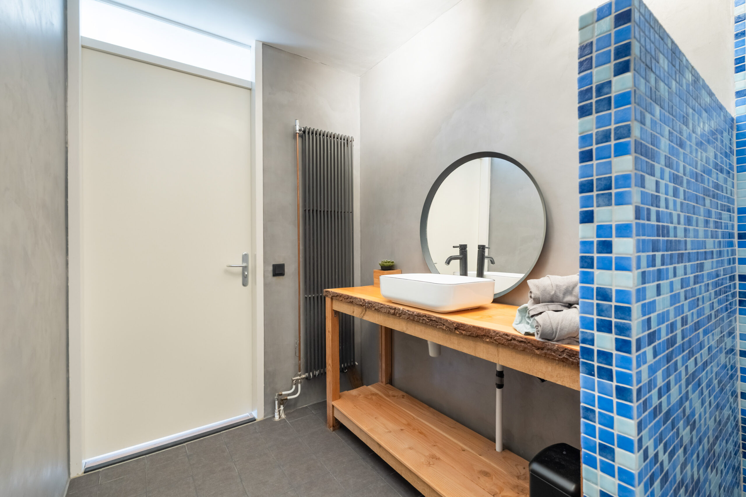 - Moderne inpandige badkamer voorzien van inloopdouche, wastafelmeubel, designradiator en beton ciré wandafwerking.