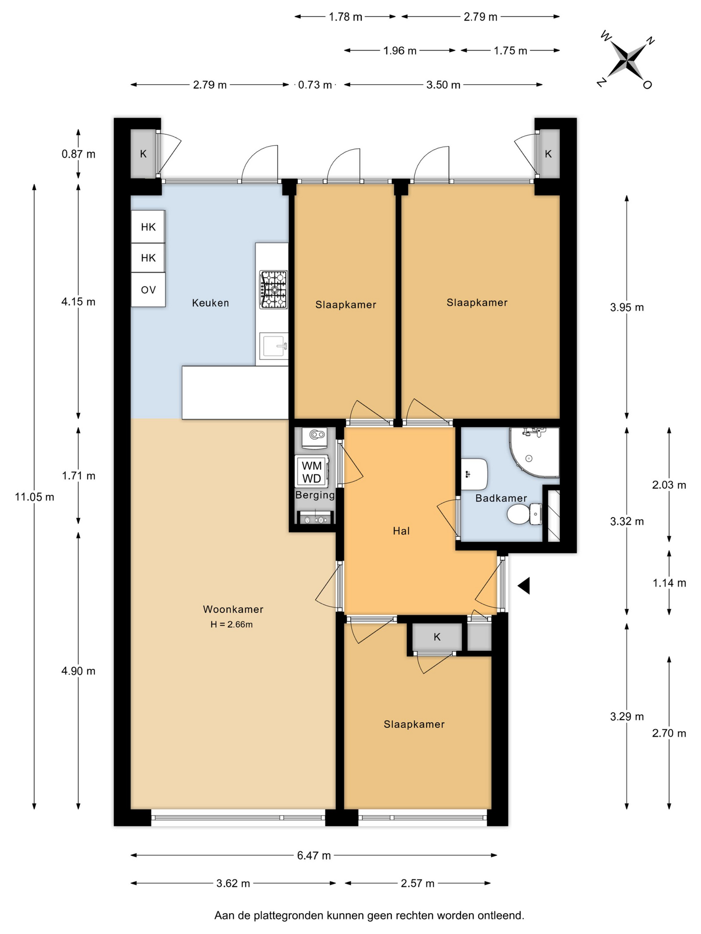 - Hal met toegang tot alle vertrekken, waaronder de woonkamer, slaapkamers, badkamer, meterkast en bergkast;