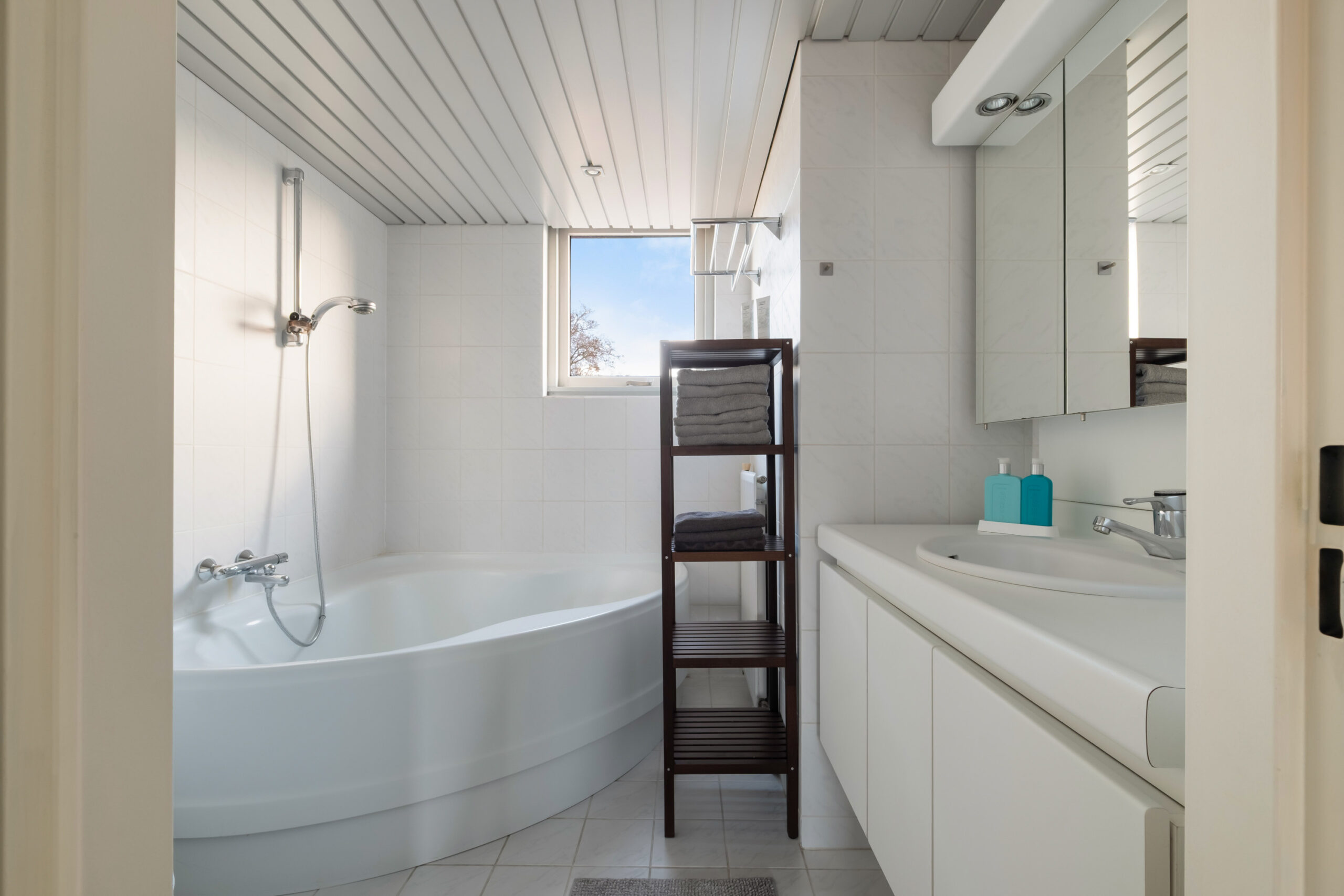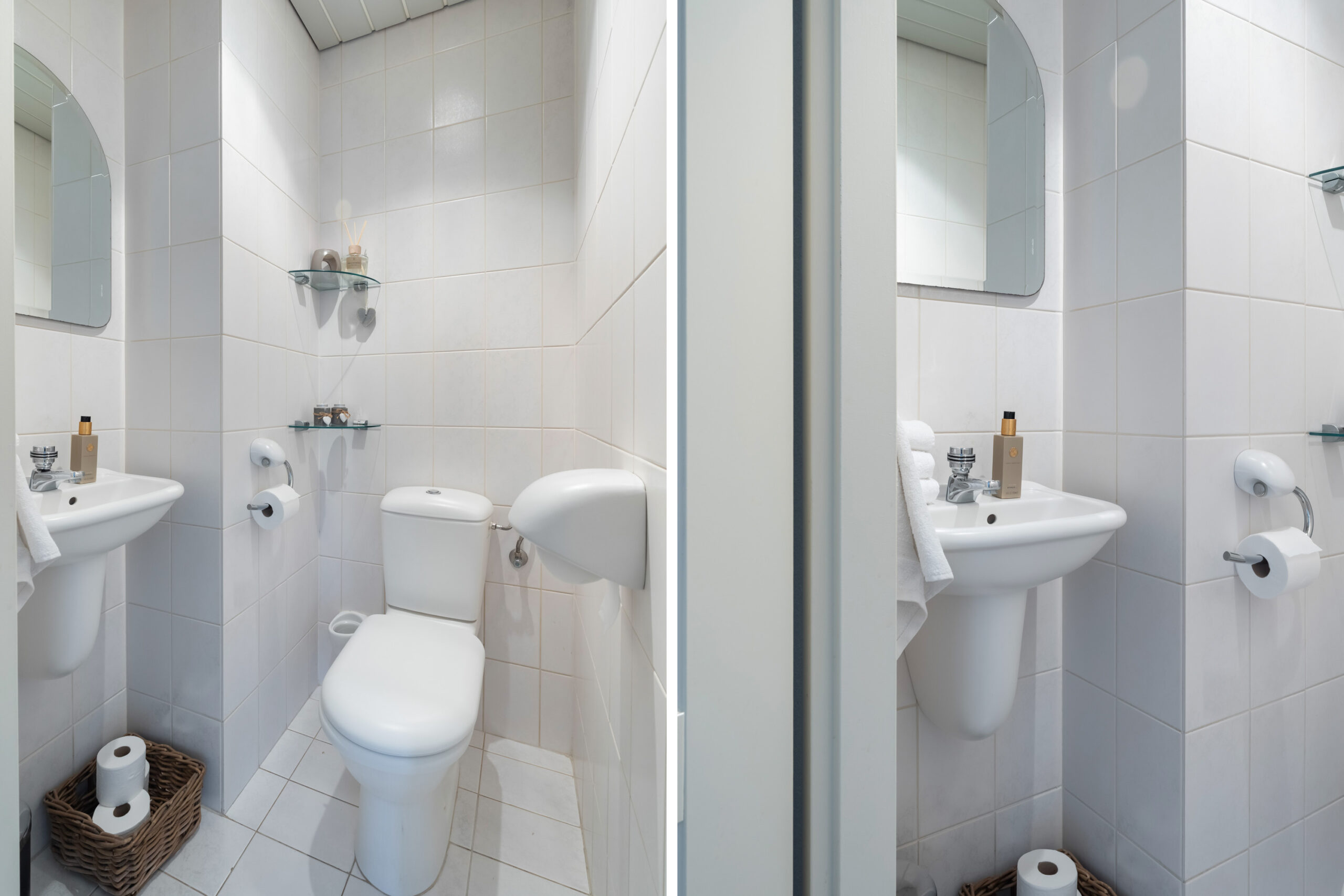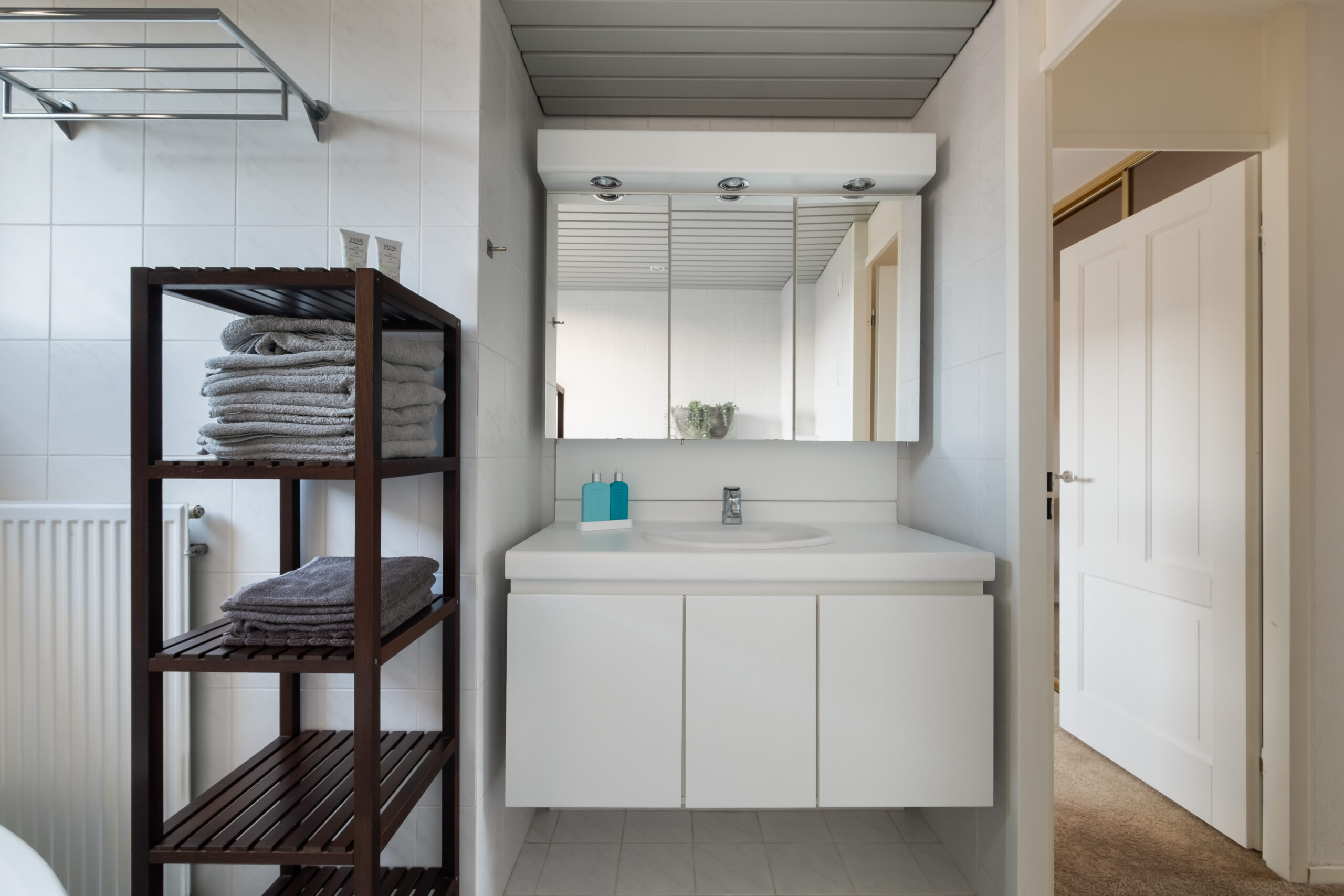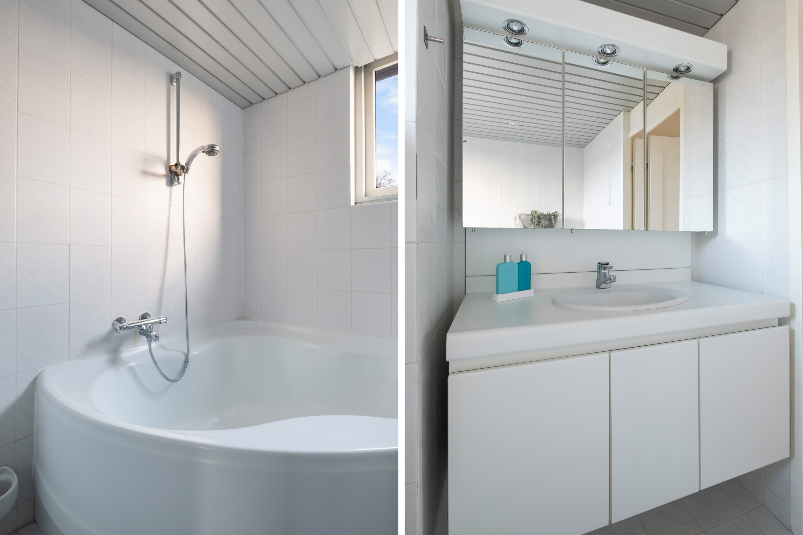 - Badkamer voorzien van toilet, bad-douche combinatie, wastafel en spiegelkast.