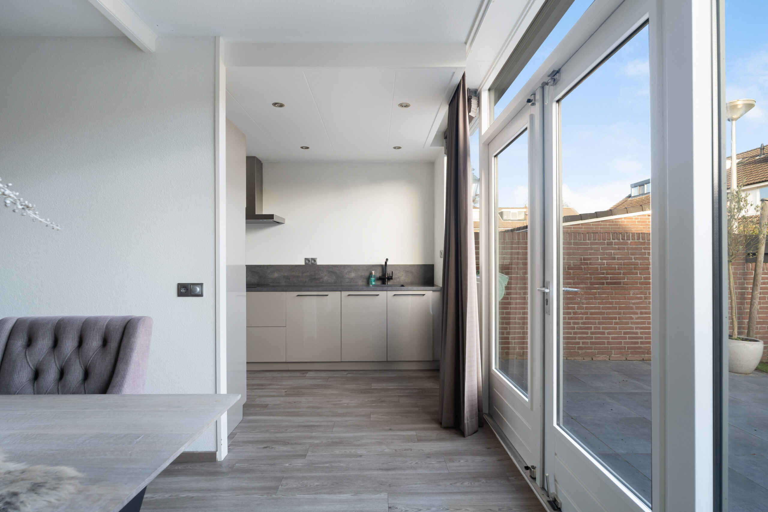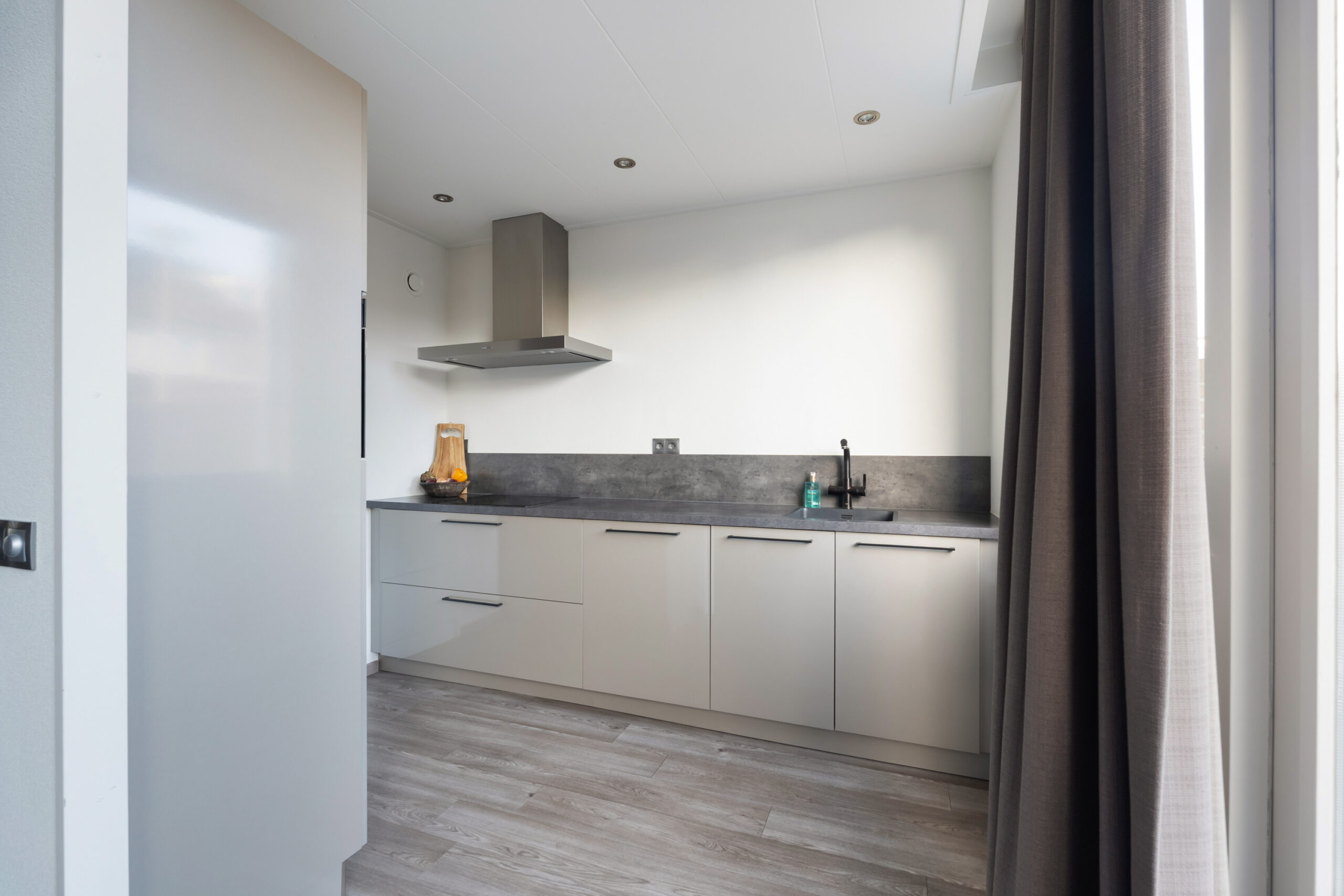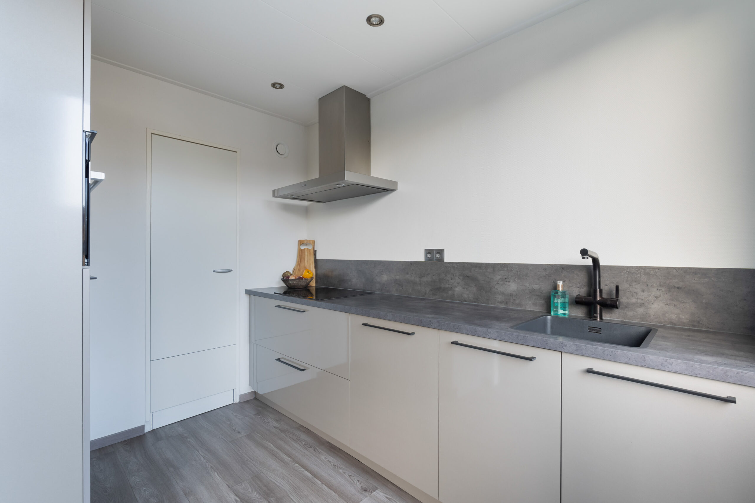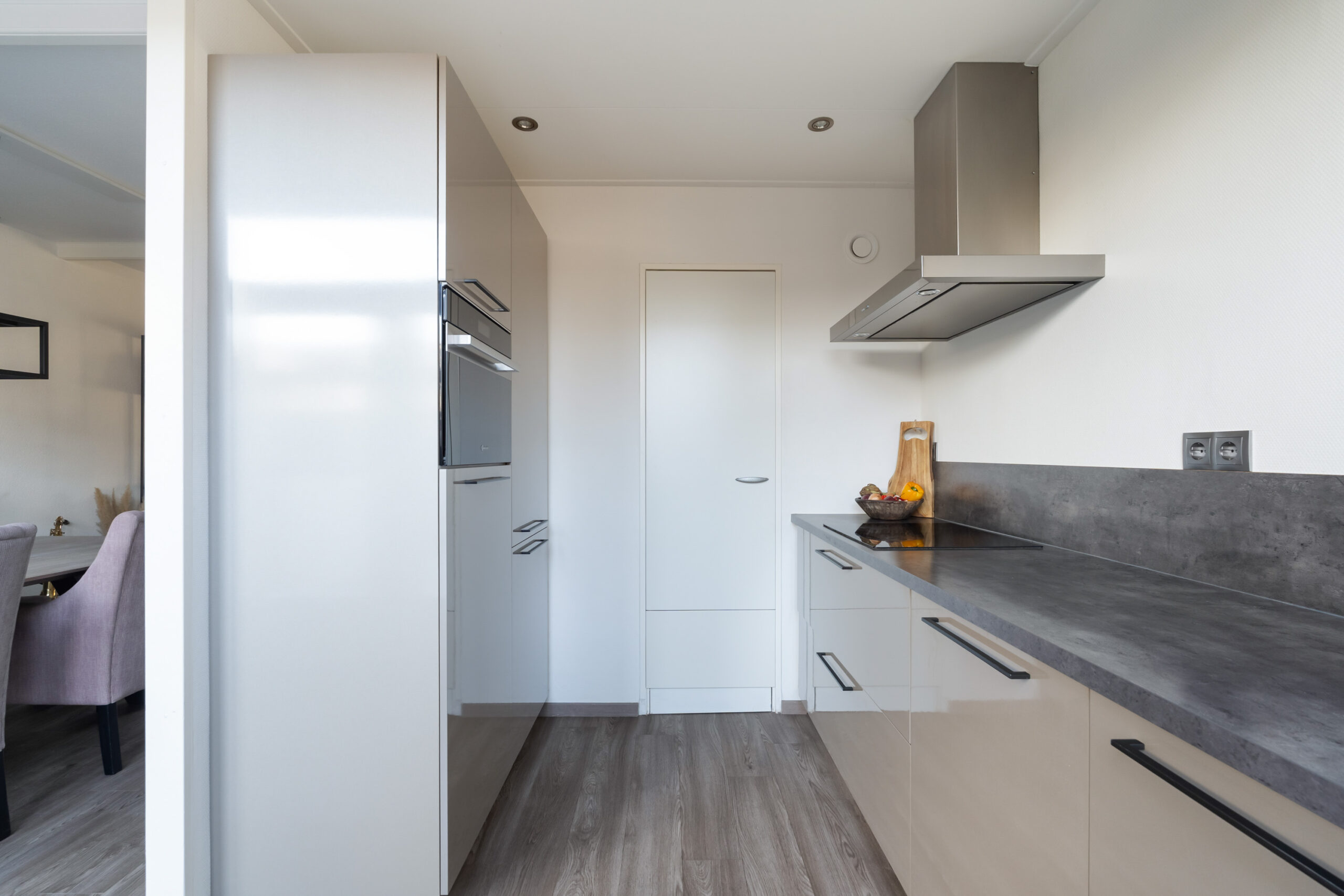 - Moderne half open keuken aan de achterzijde van de woning met openslaande deuren naar de tuin. De keuken is voorzien van inductiekookplaat, afzuigkap, vaatwasmachine, Quooker kraan en combi-oven. De keuken biedt toegang tot de trapkast.