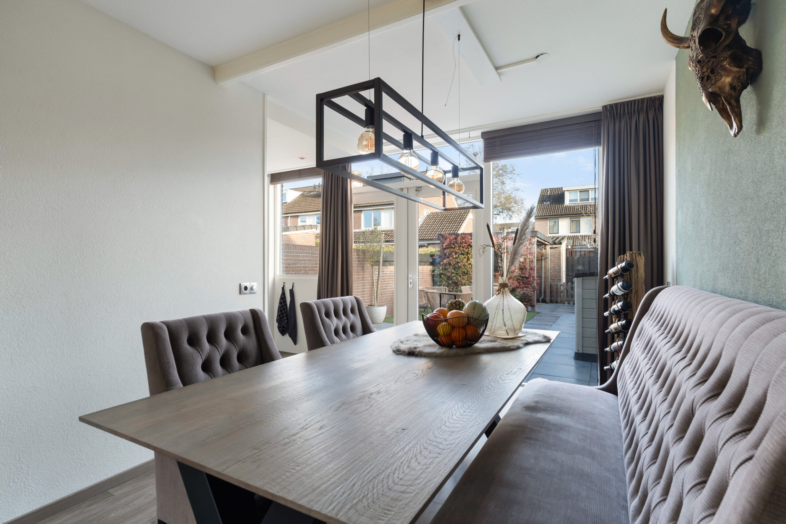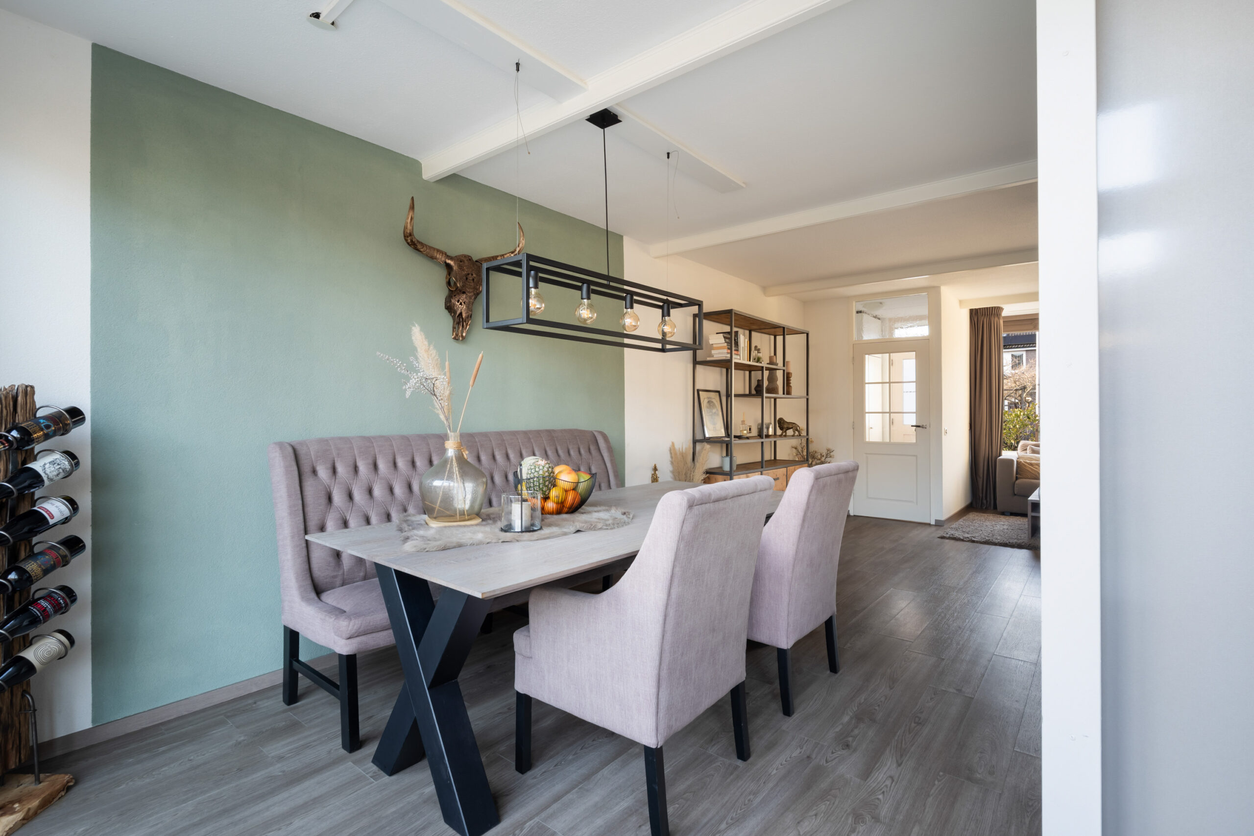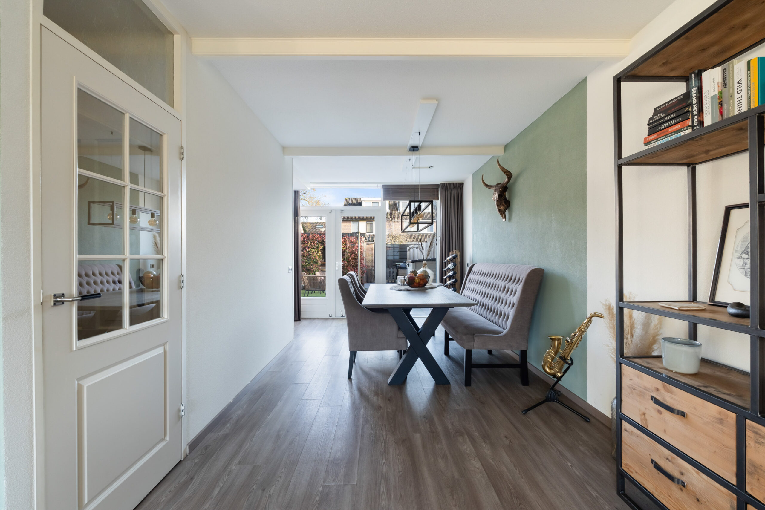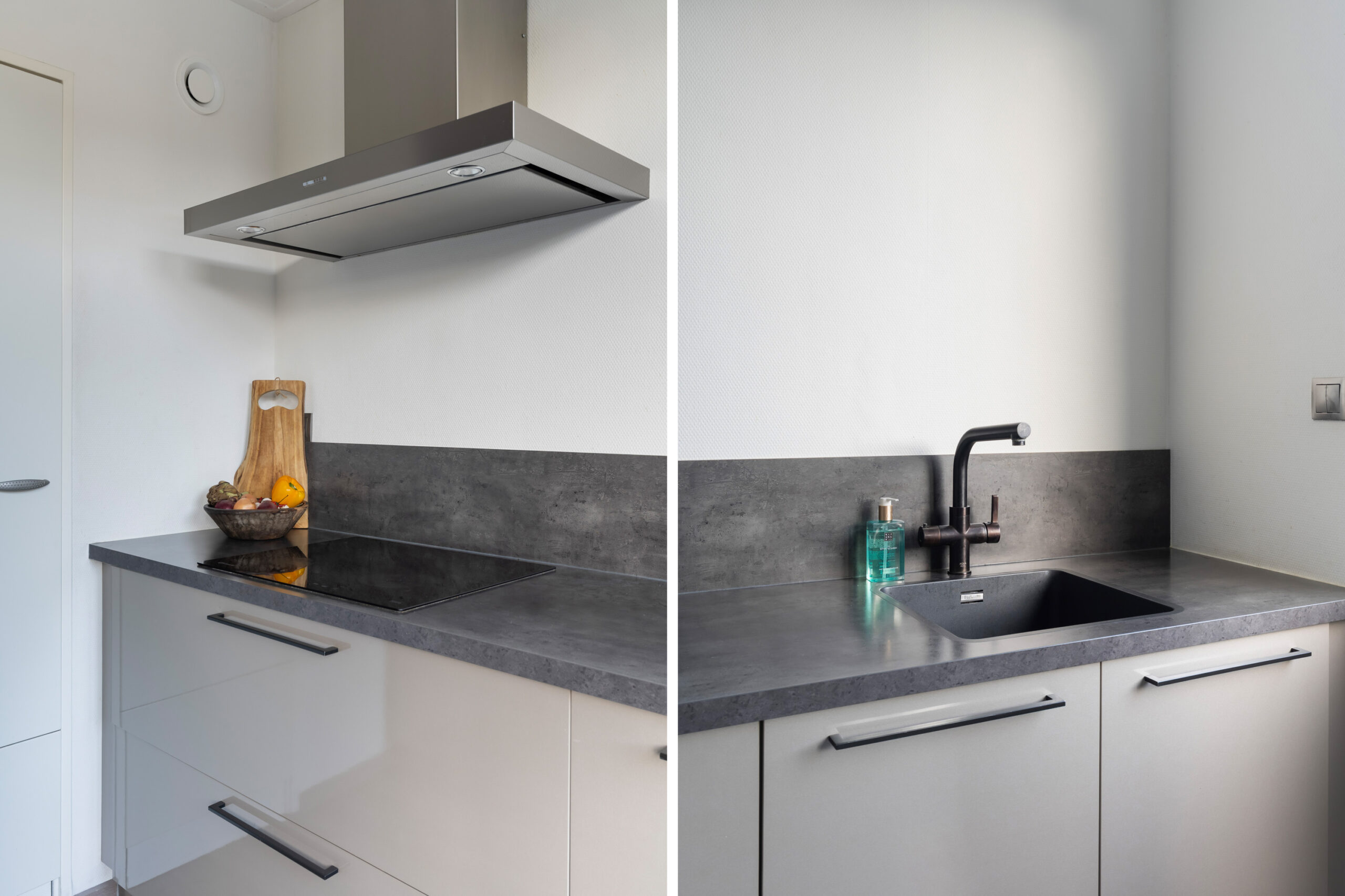 - Moderne half open keuken aan de achterzijde van de woning met openslaande deuren naar de tuin. De keuken is voorzien van inductiekookplaat, afzuigkap, vaatwasmachine, Quooker kraan en combi-oven. De keuken biedt toegang tot de trapkast.
