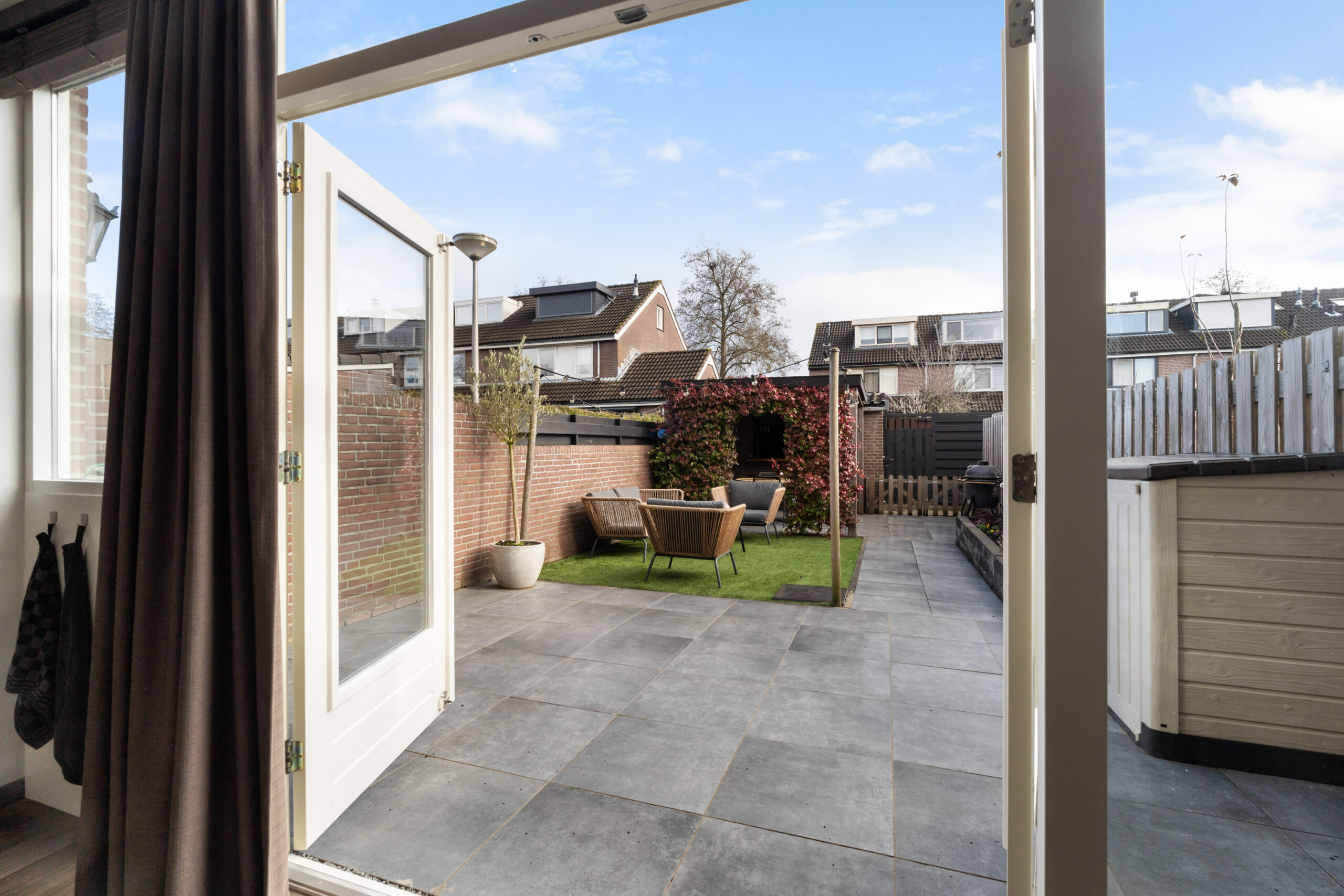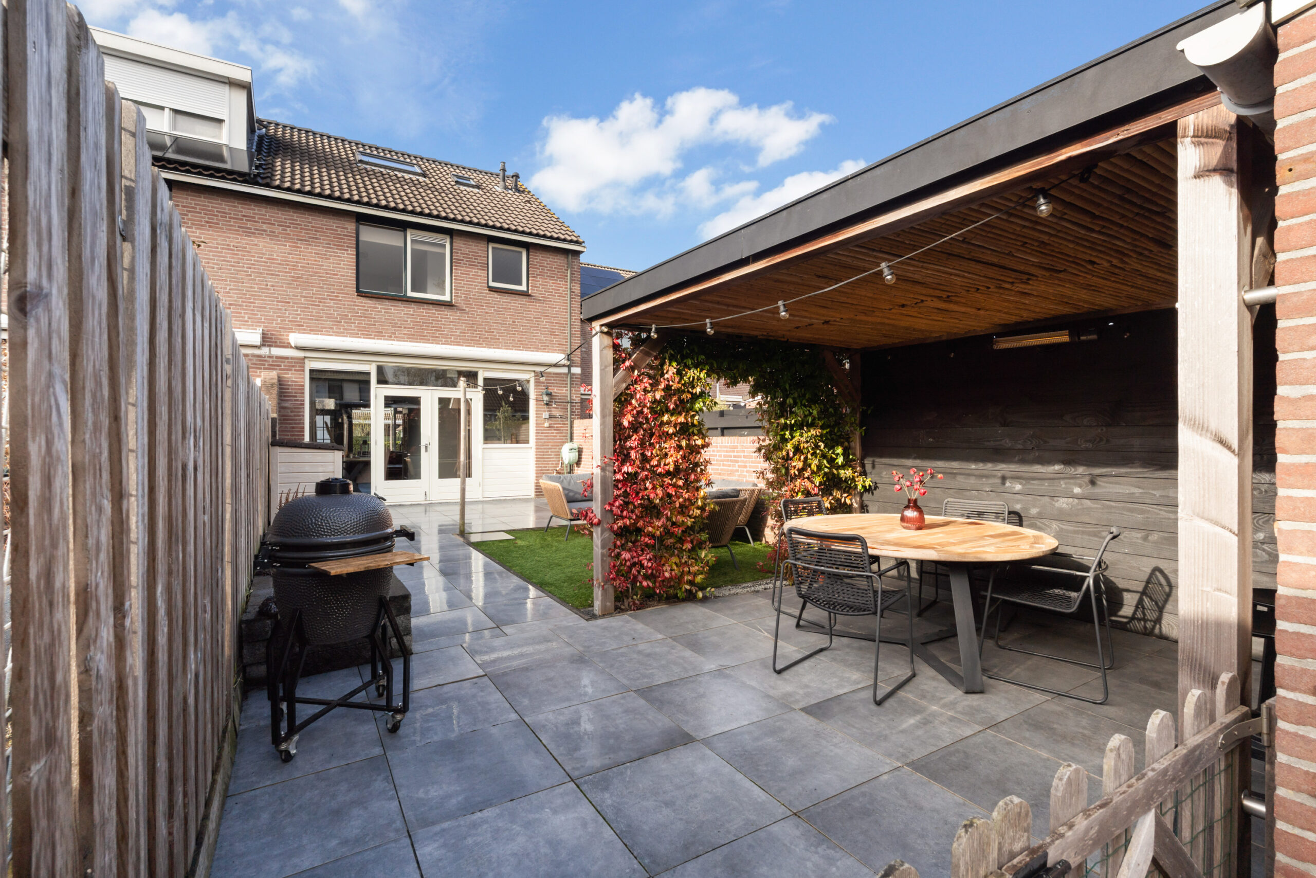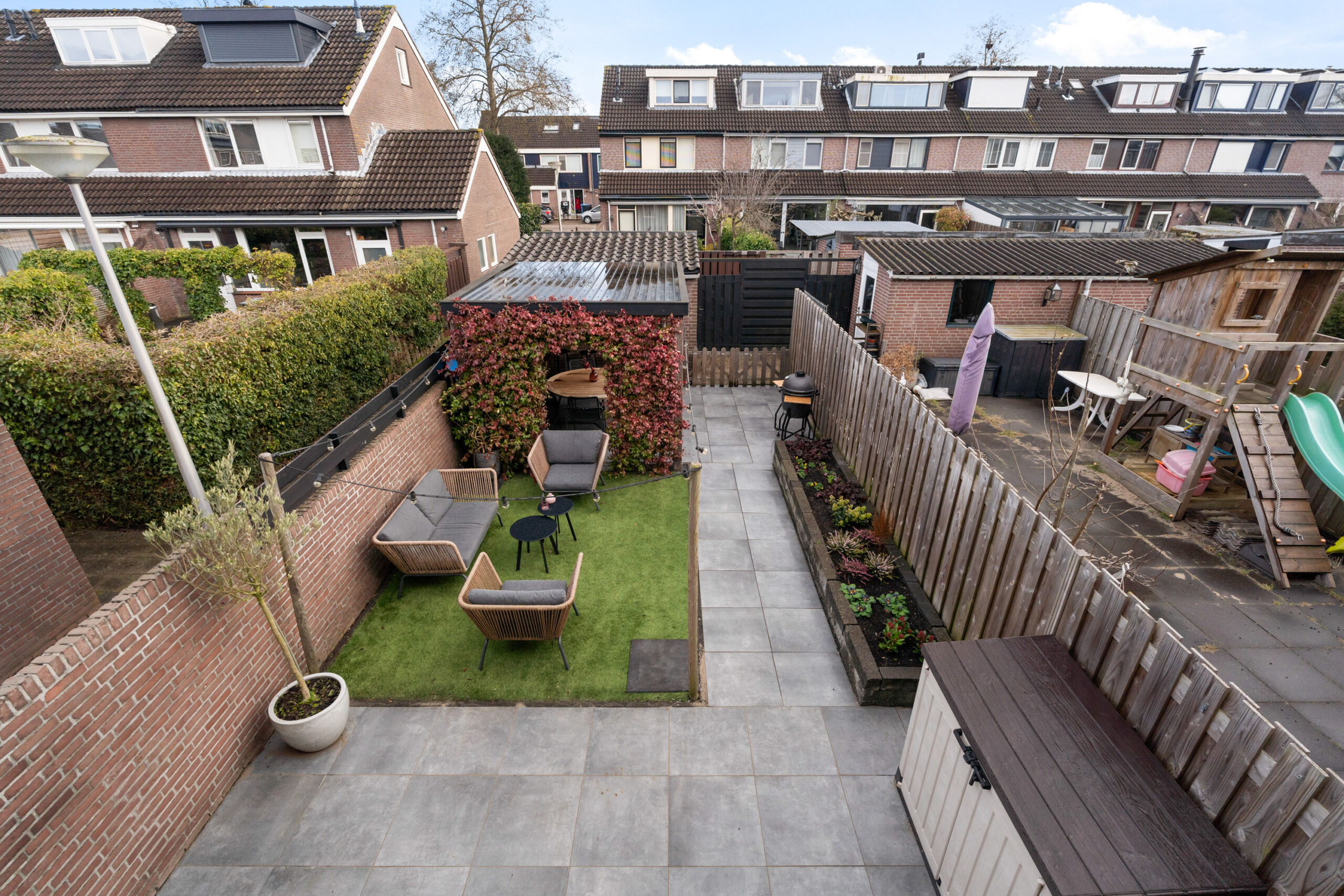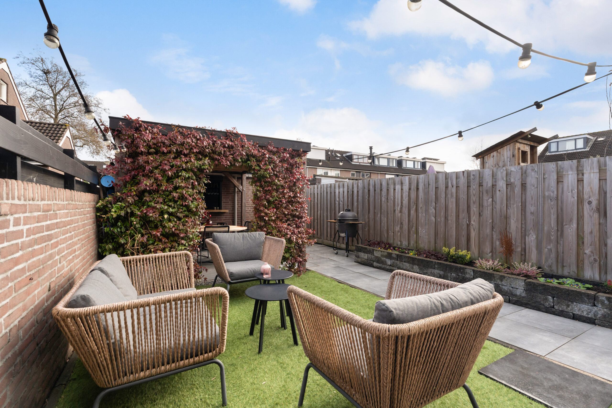 - Royale en zonnige achtertuin van ca. 14 meter diep voorzien van gezellige zithoek, overkapping en berging waarin een buitenbar is gecreëerd.