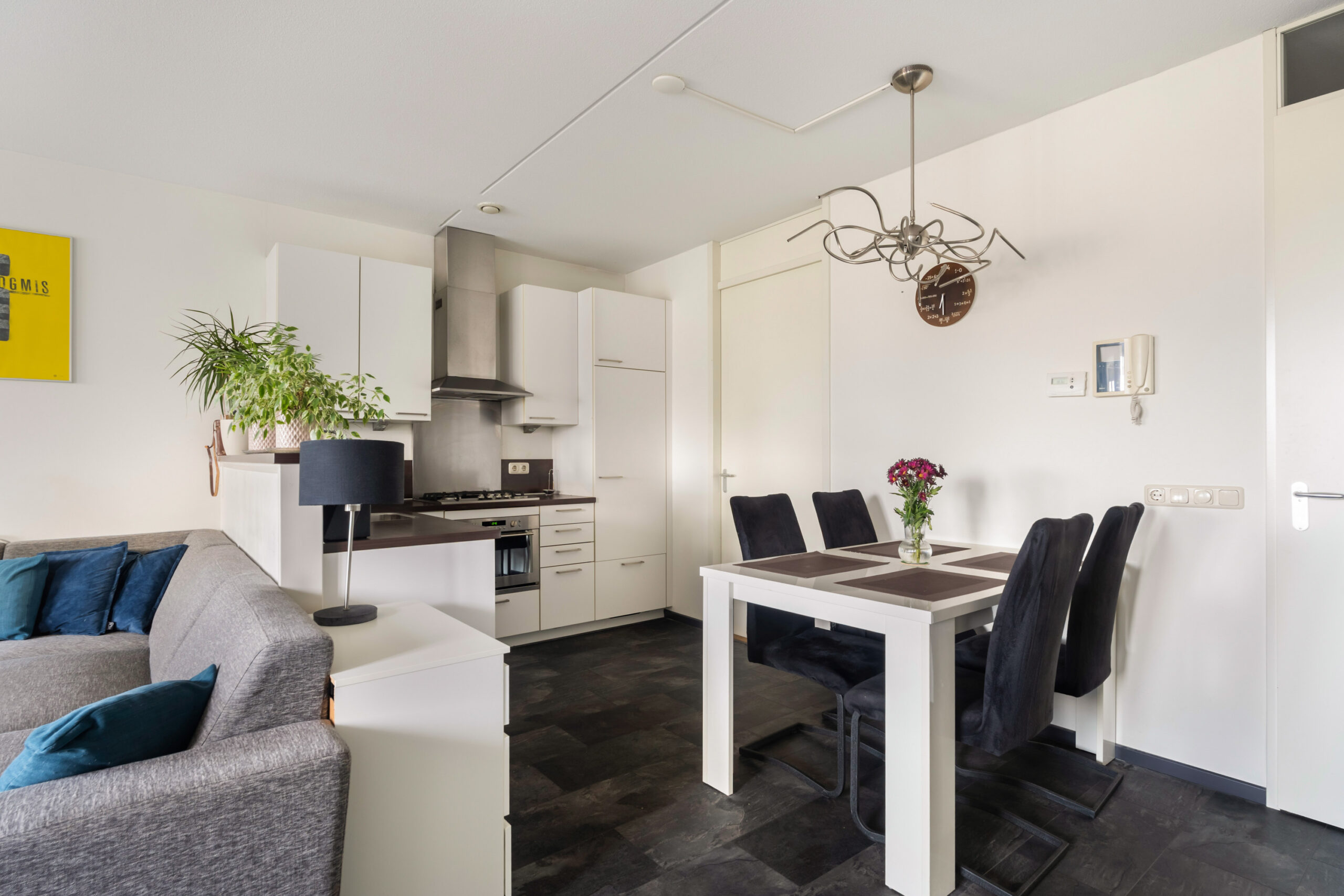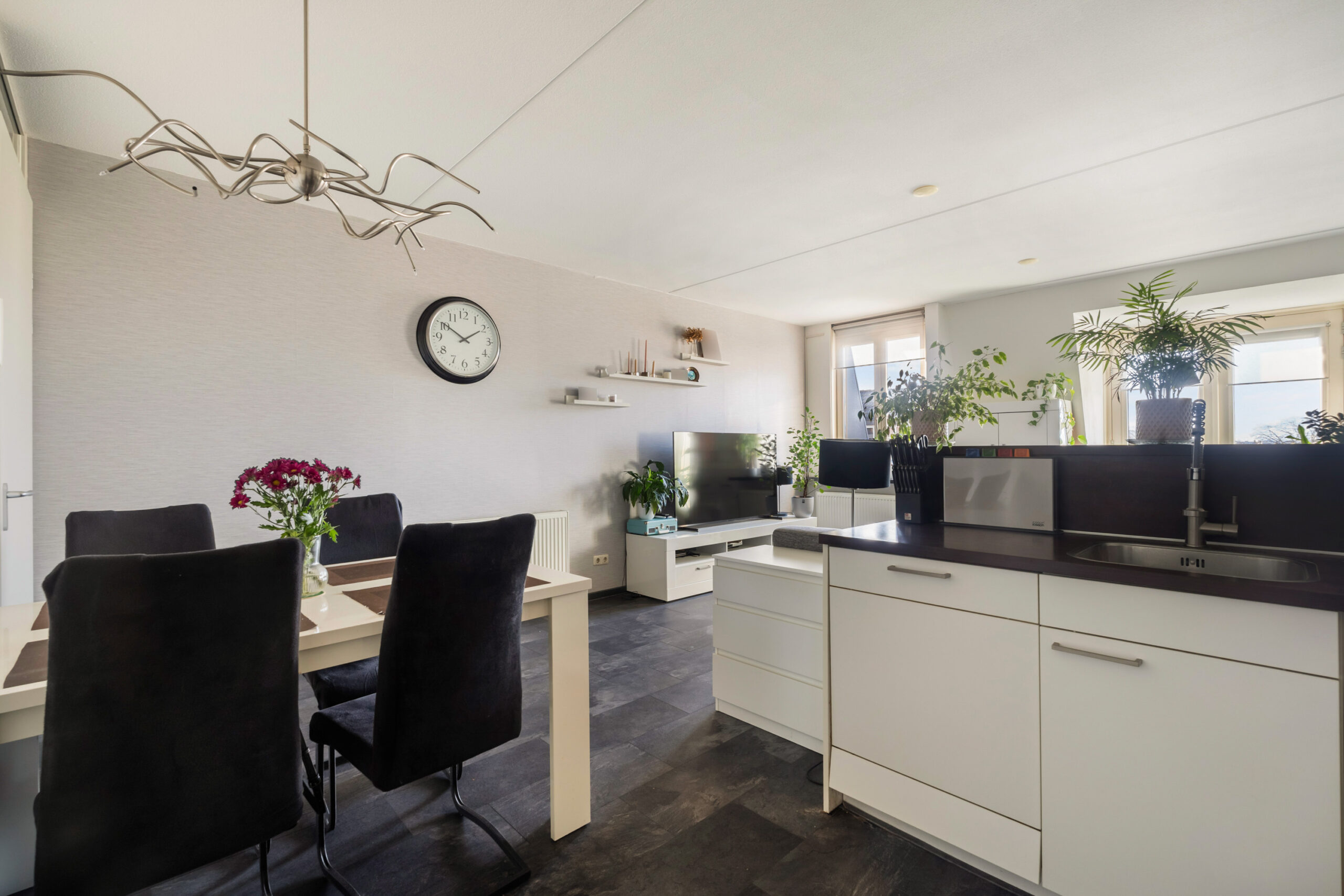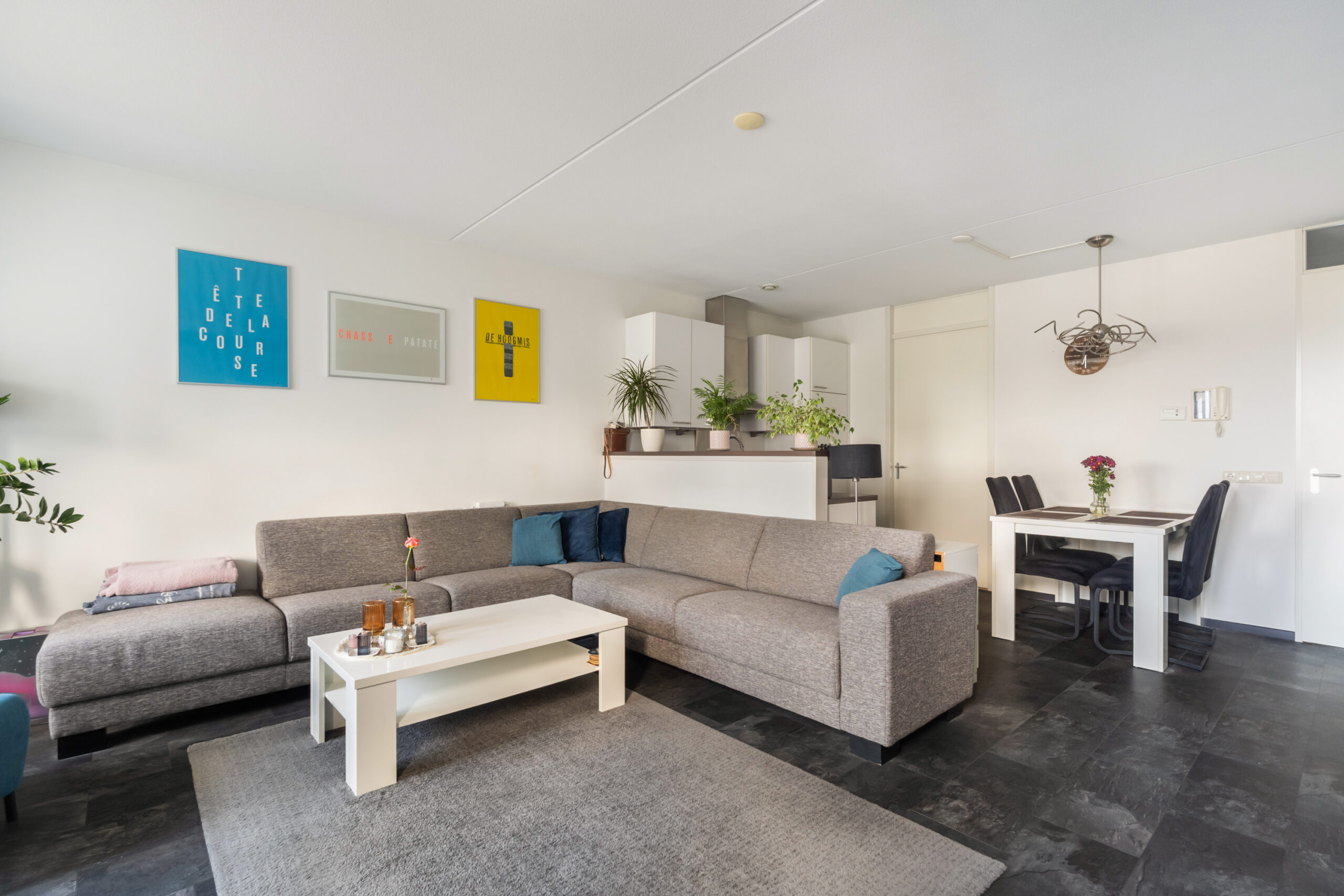 - Lichte woonkamer met open keuken voorzien van laminaat vloer en Frans balkon;