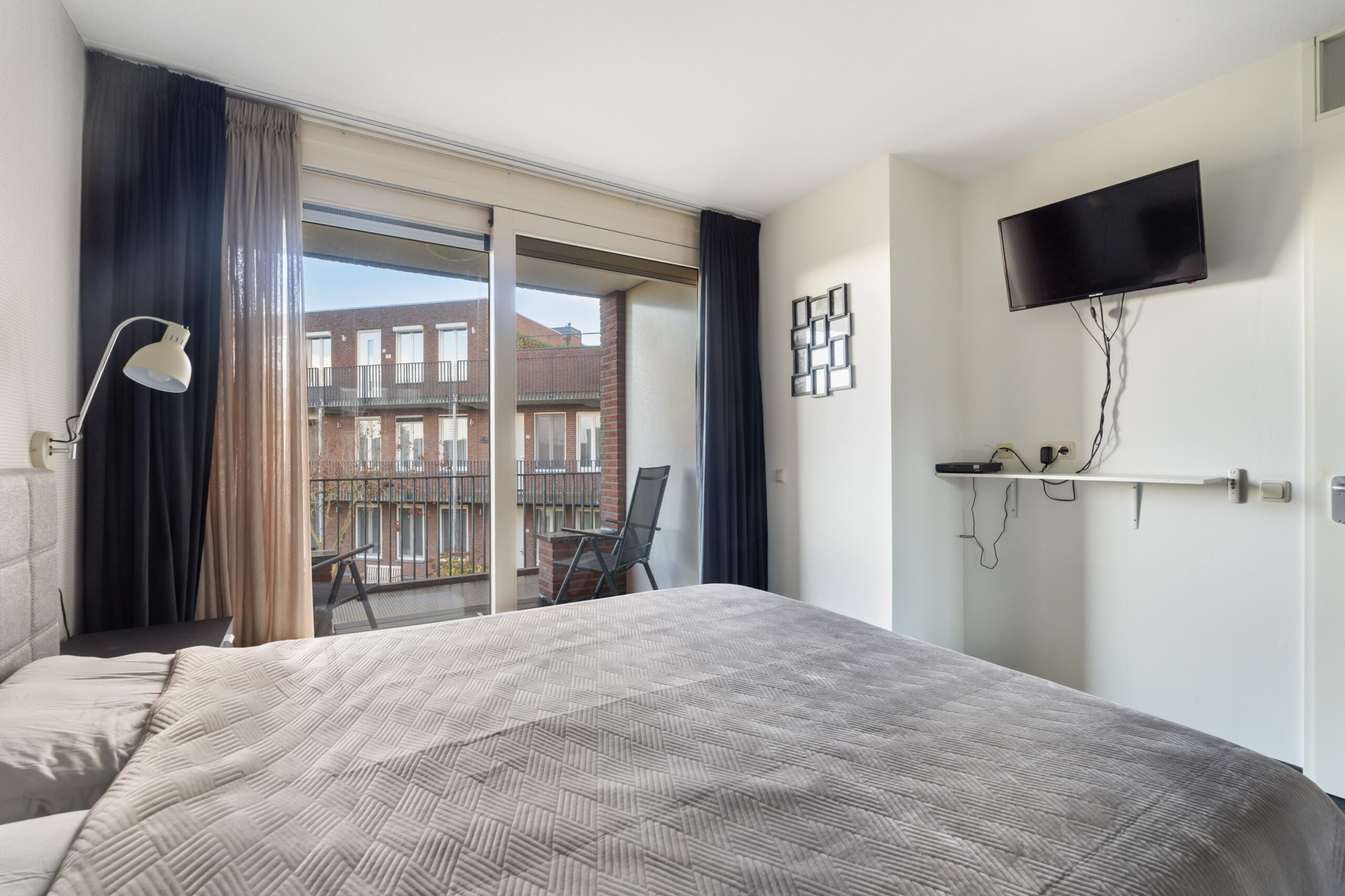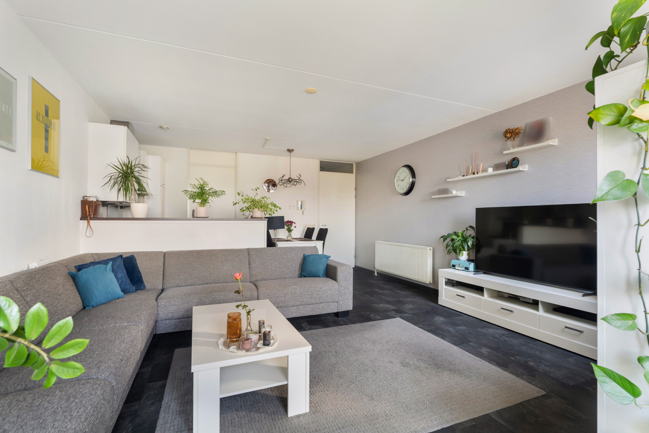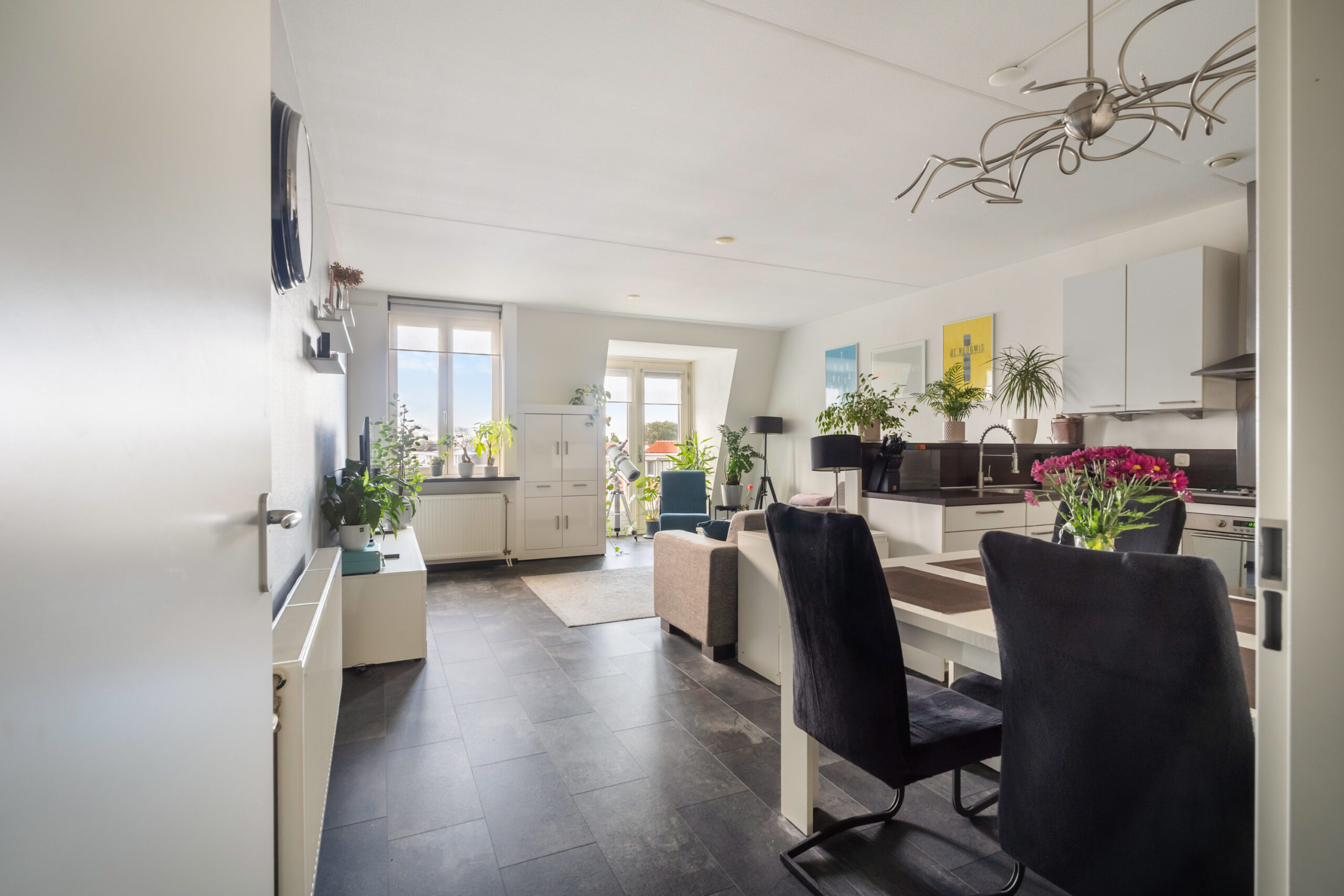 - Lichte woonkamer met open keuken voorzien van laminaat vloer en Frans balkon;