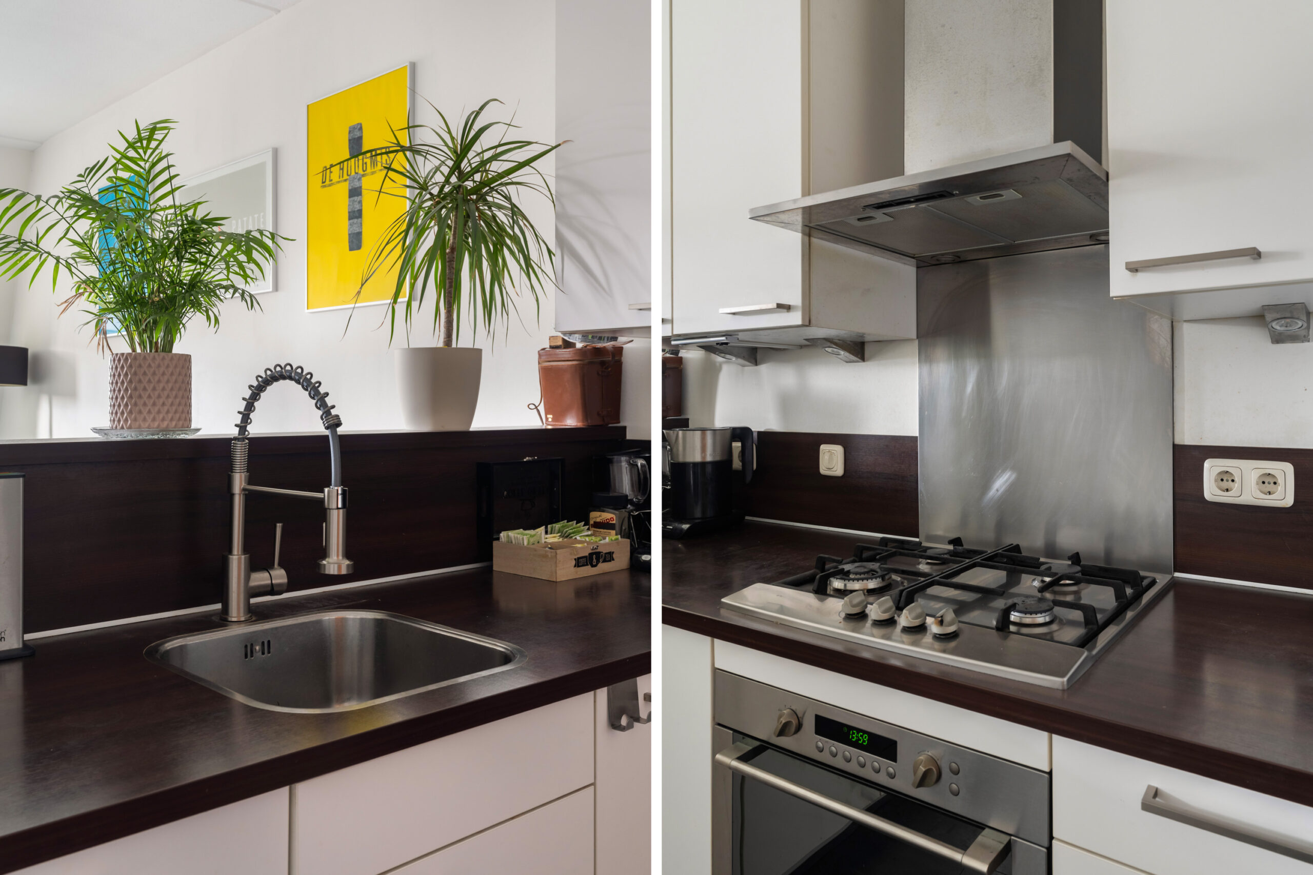 - Moderne L-vormige open keuken in lichte kleurstelling voorzien van diverse inbouwapparatuur;