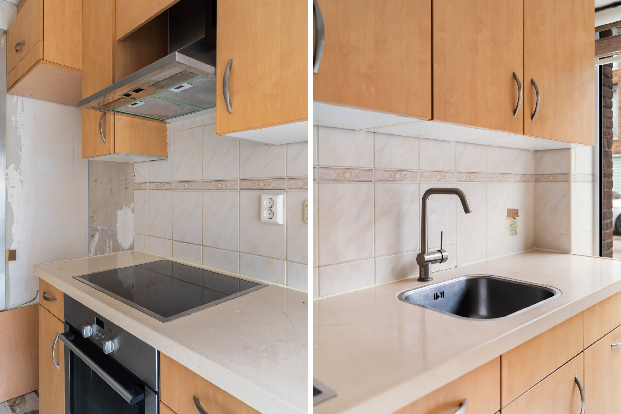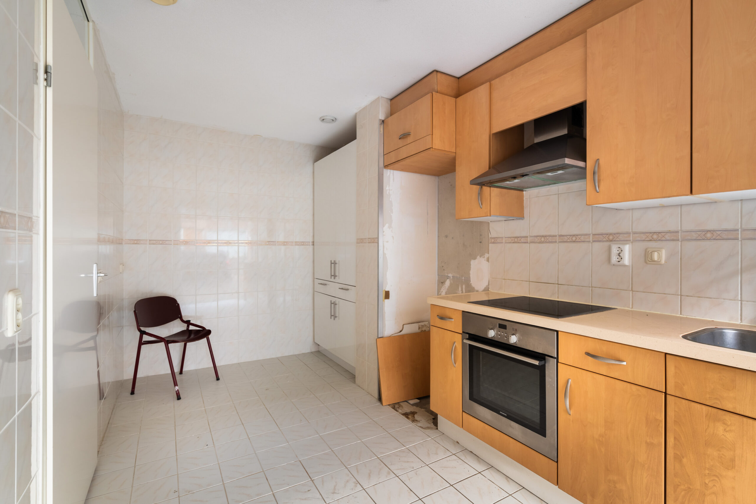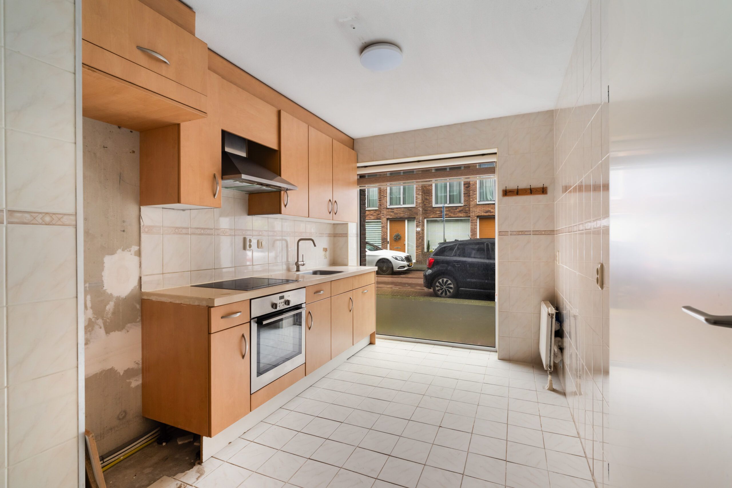 - Gesloten eenvoudige keuken, neutraal van kleur aan de straatzijde;