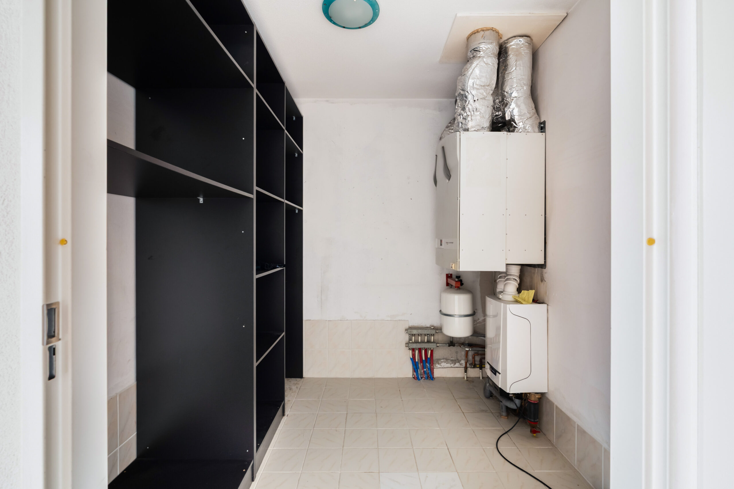 - Overloop met toegang tot grote bergruimte met opstelplaats voor de wasmachine en droger, cv-ketel en WTW-systeem;