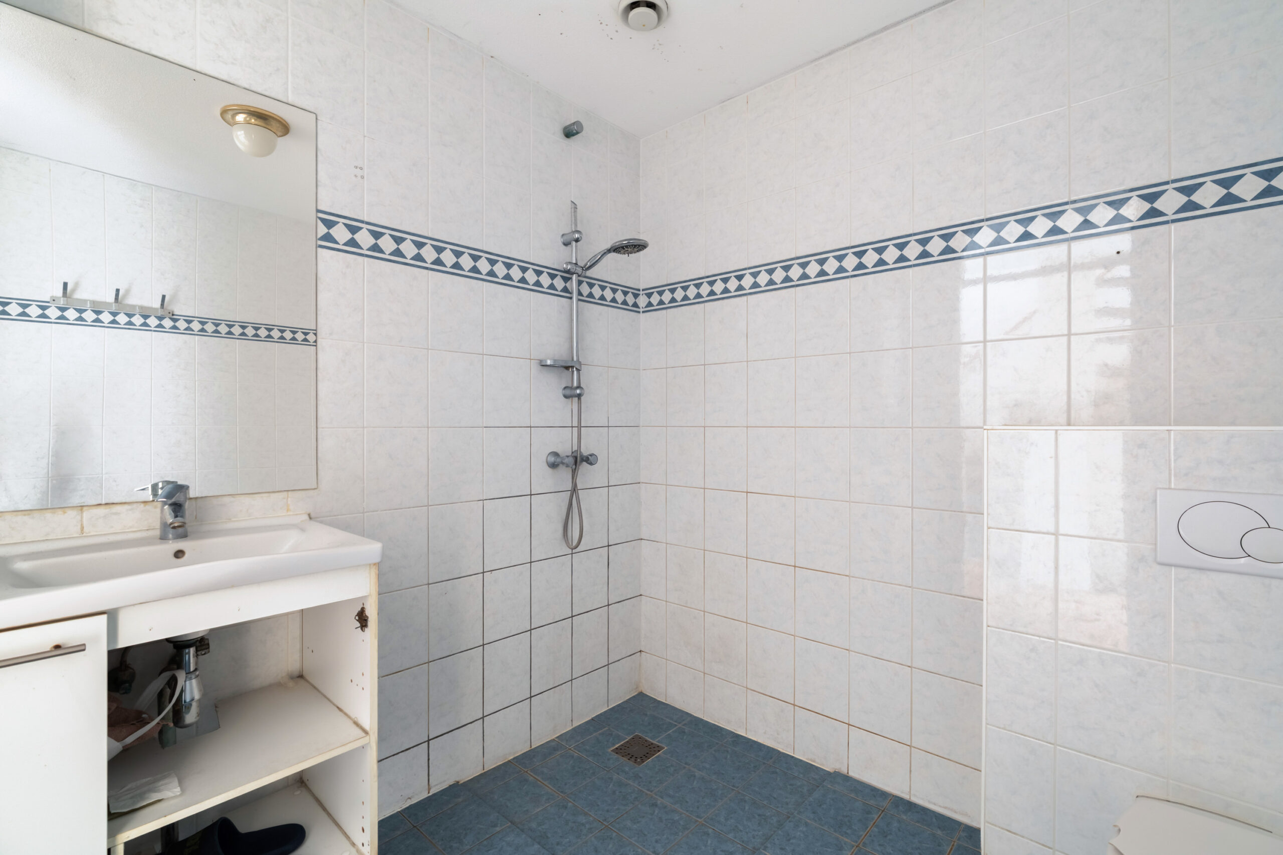 - Tussengelegen badkamer met douche, toilet en wastafel;