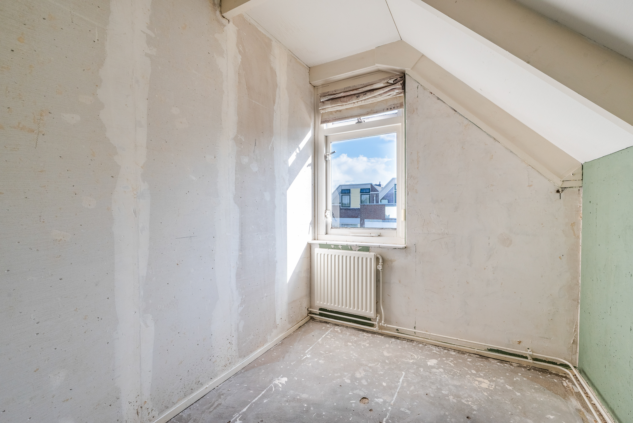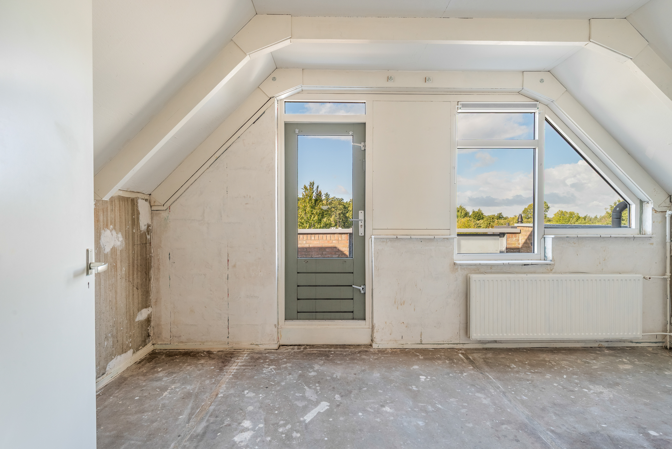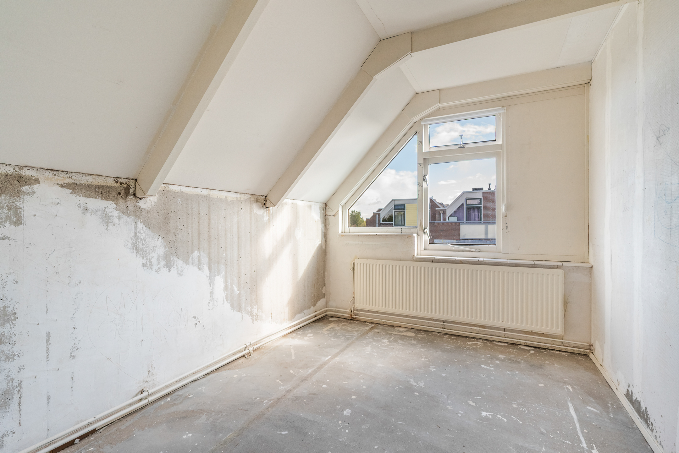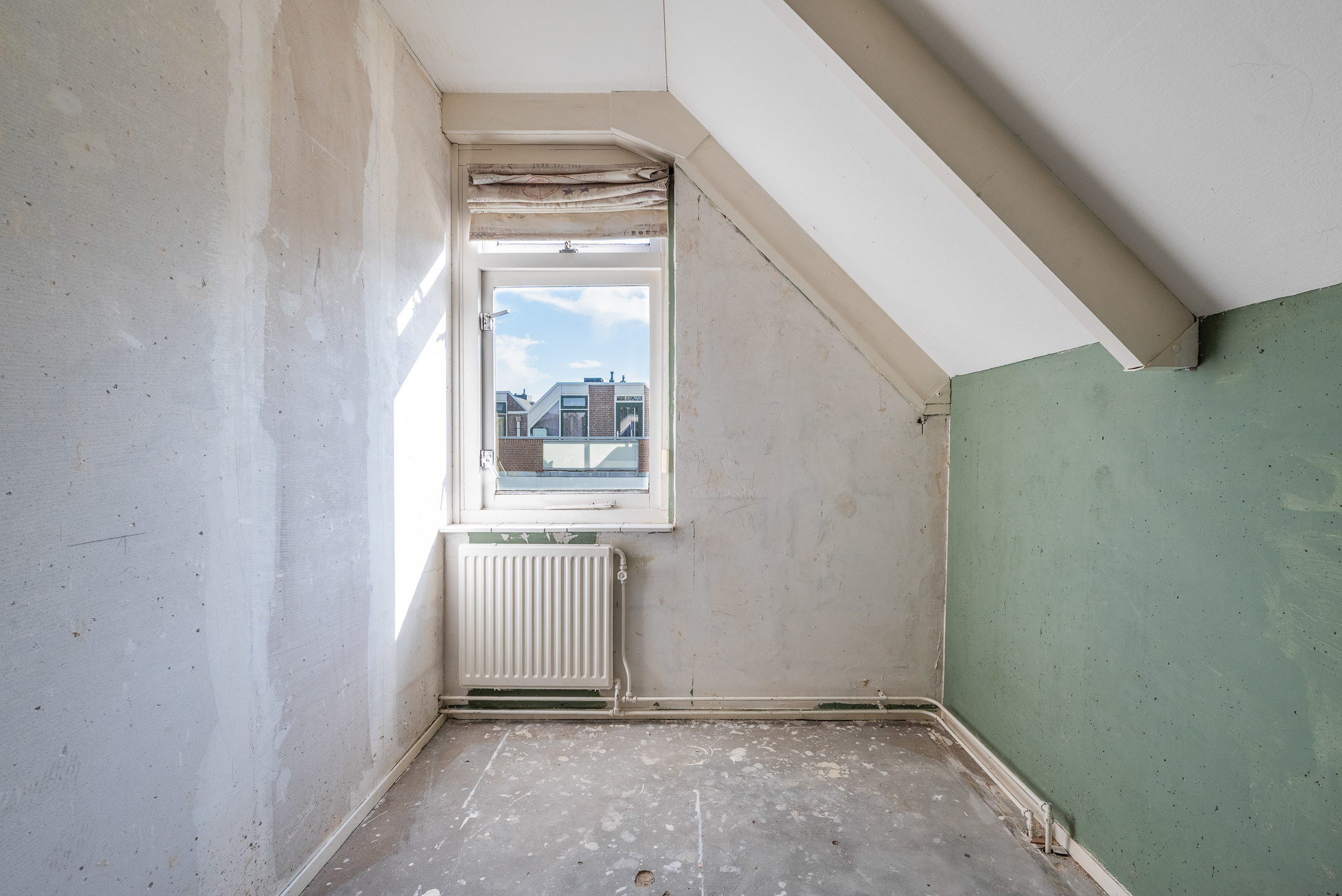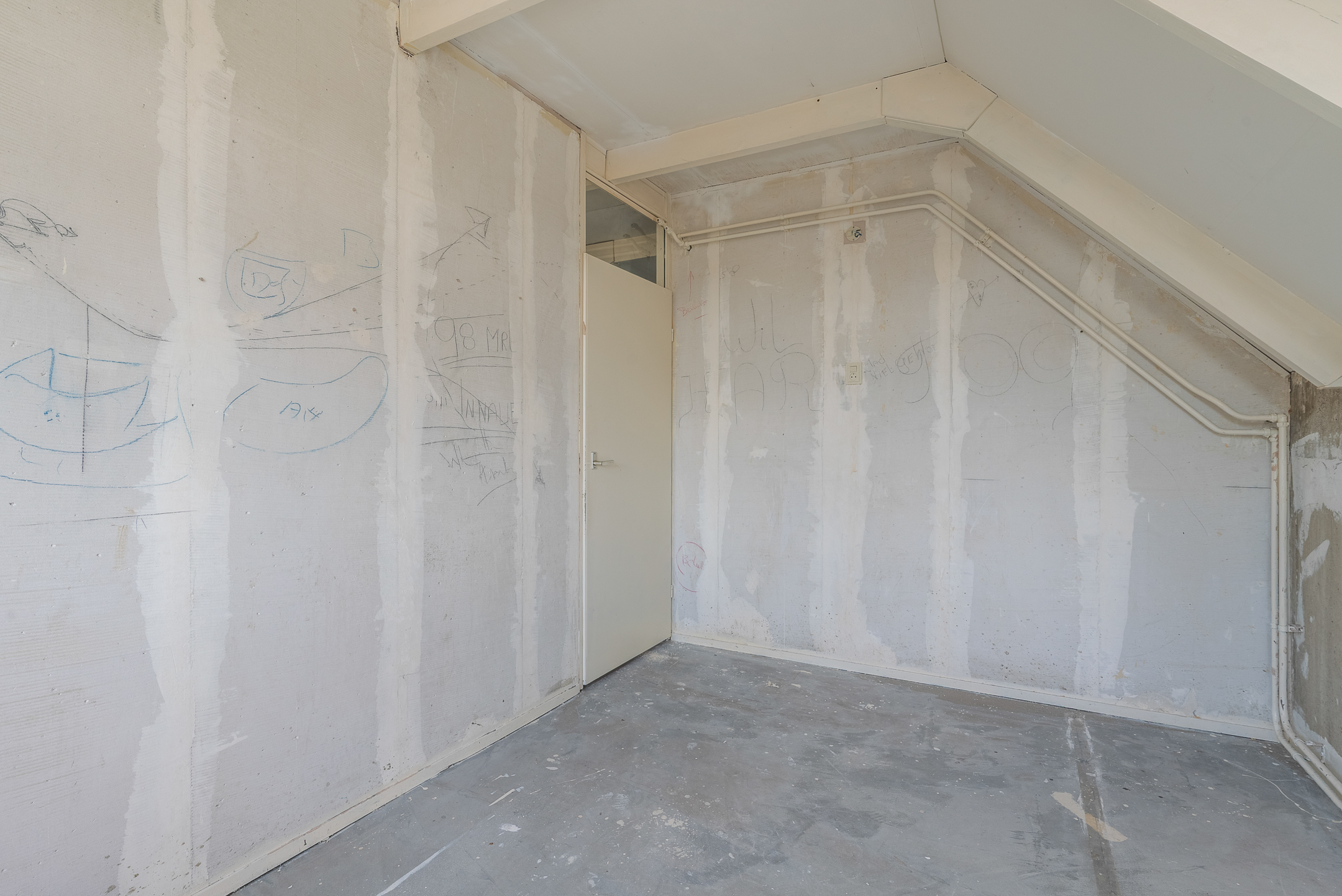 - Ruime slaapkamer van ca. 10 m2 met raampartij voorzien van enkel glas aan de achterzijde van de woning. Via deze kamer bereikt u het dakterras van circa 10 m2.