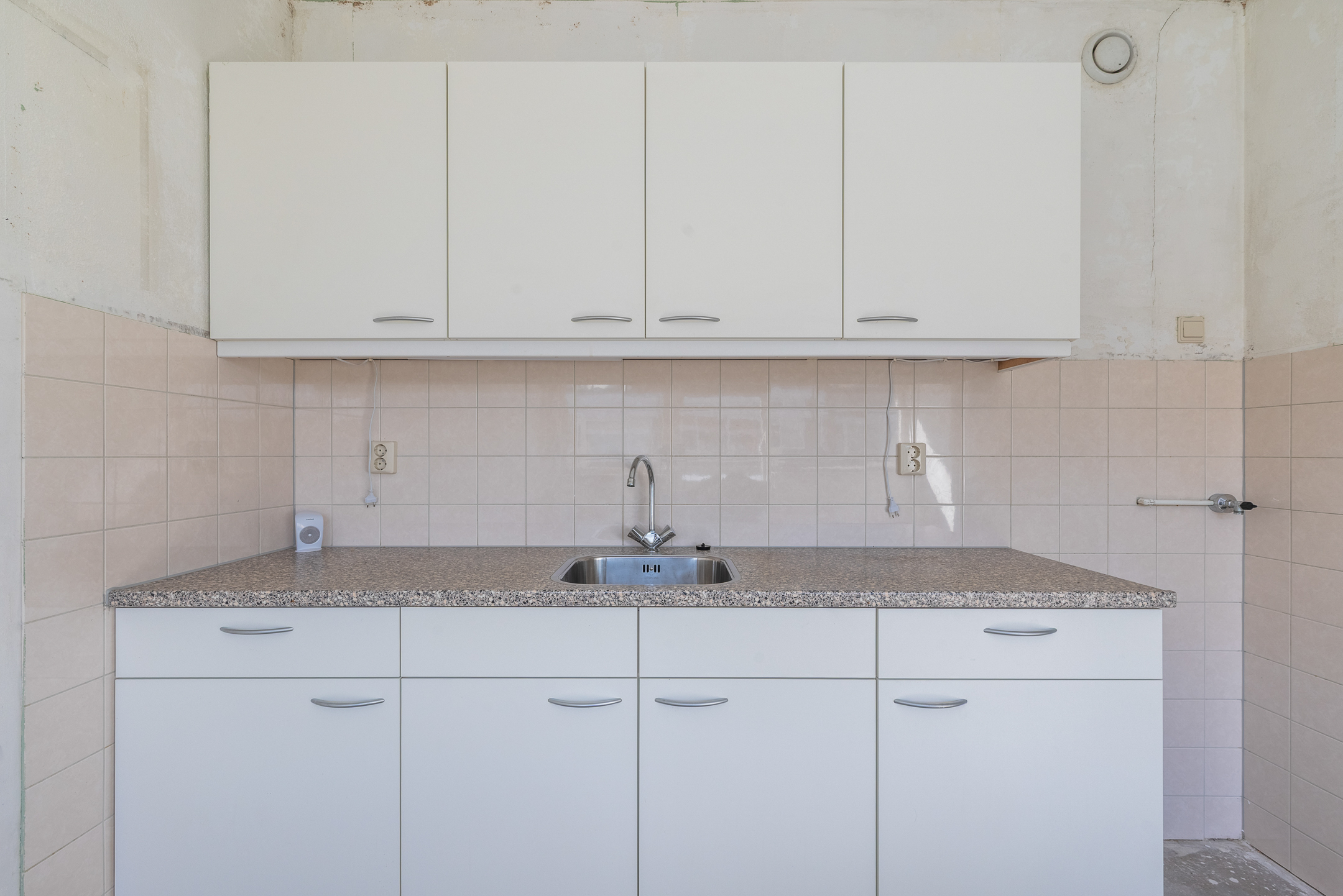 - Halfopen keuken voorzien van eenvoudig keukenblok.