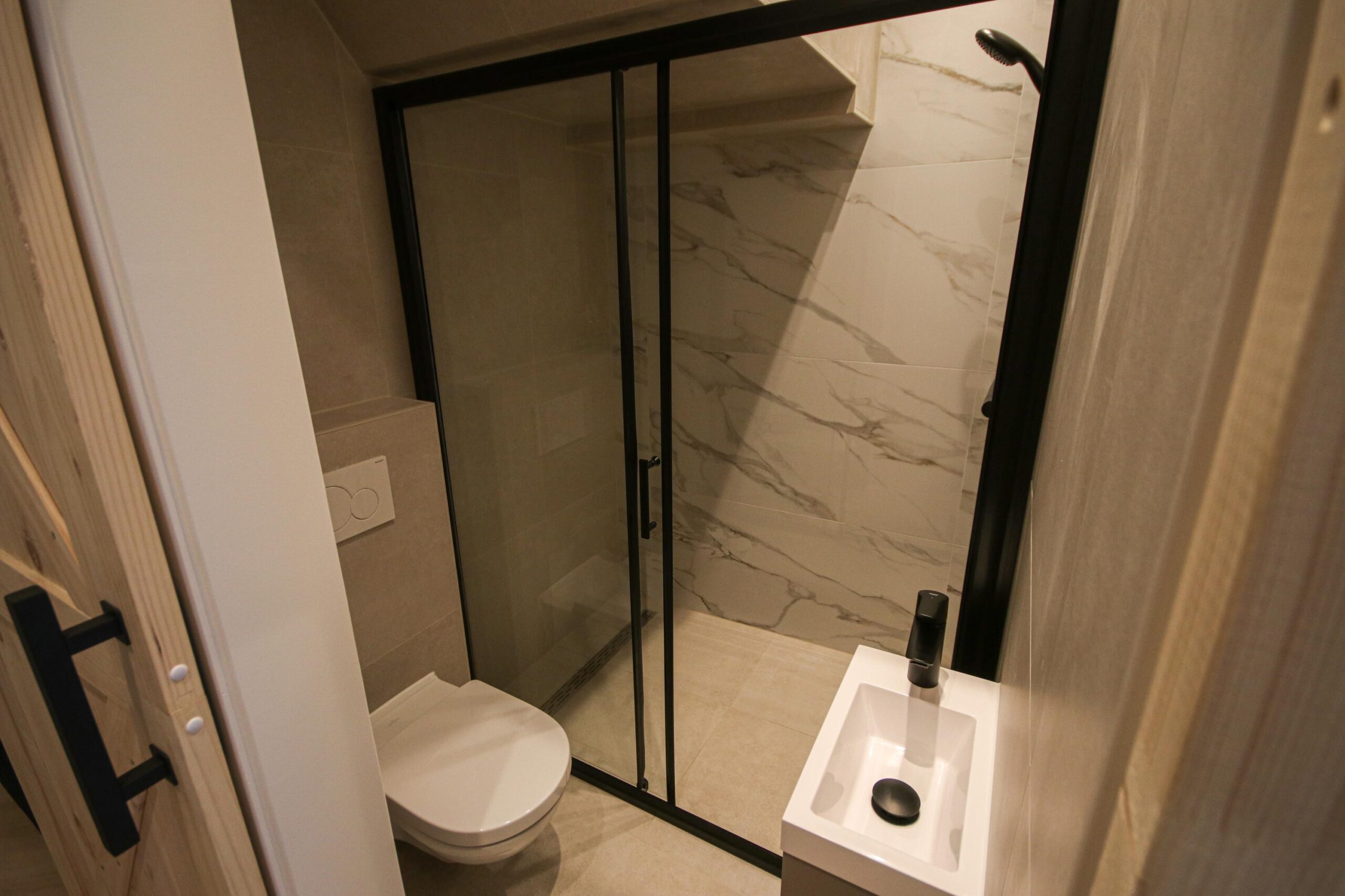 -Badkamer met douche, wastafeltje en toilet