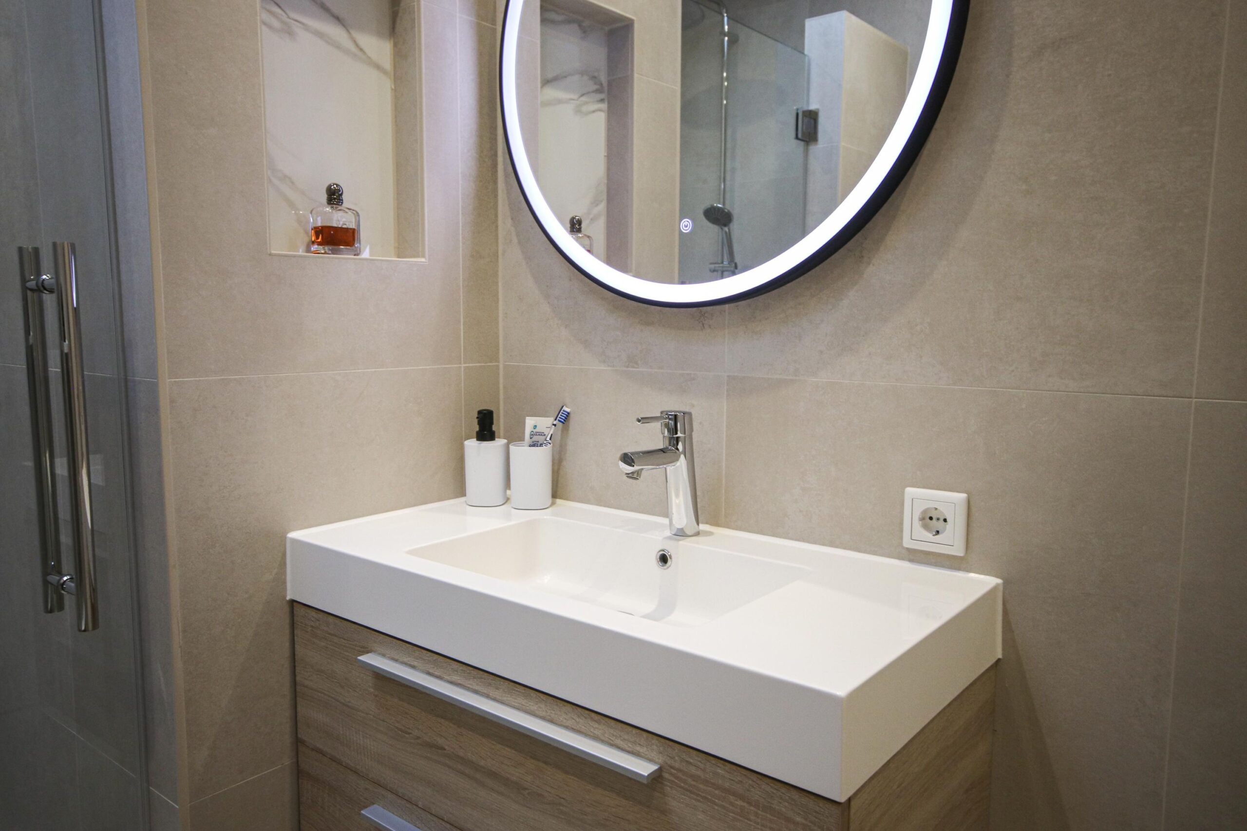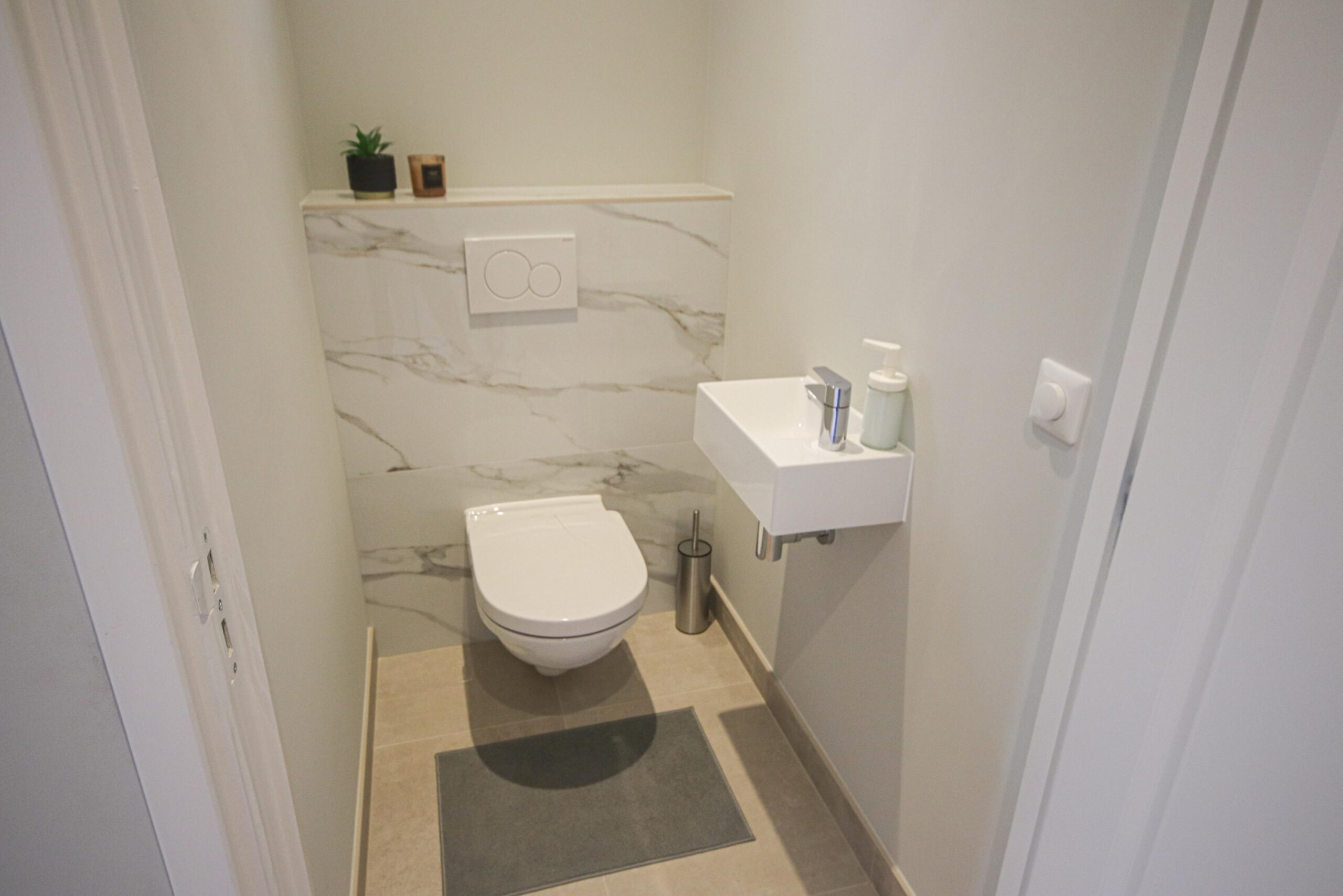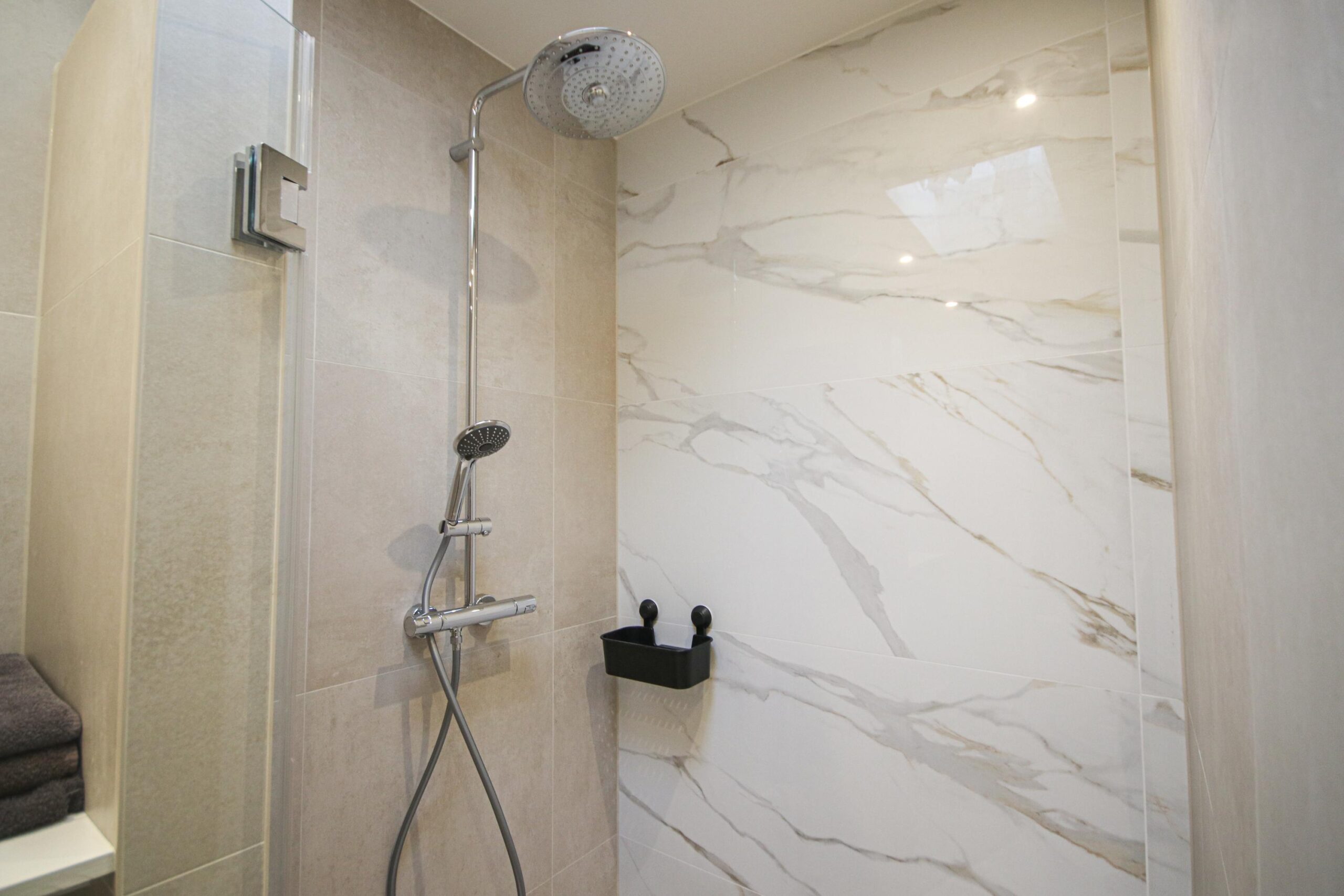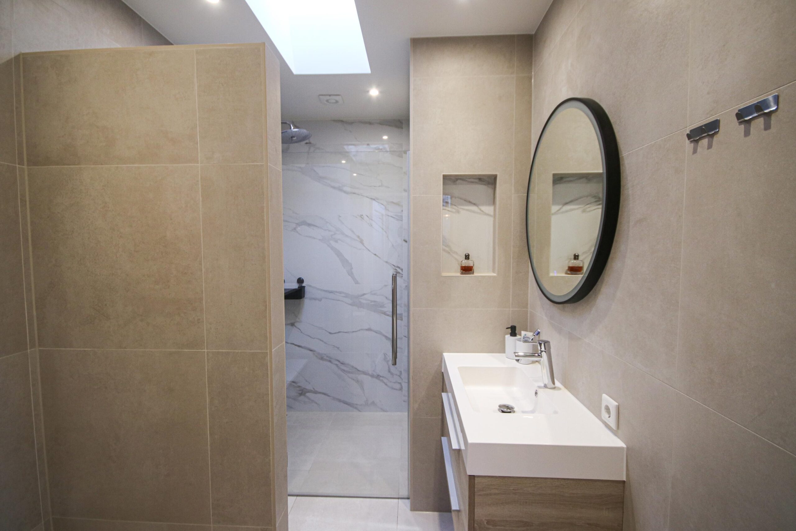 -Badkamer voorzien van douche, wastafelmeubel en aansluiting voor wasmachine